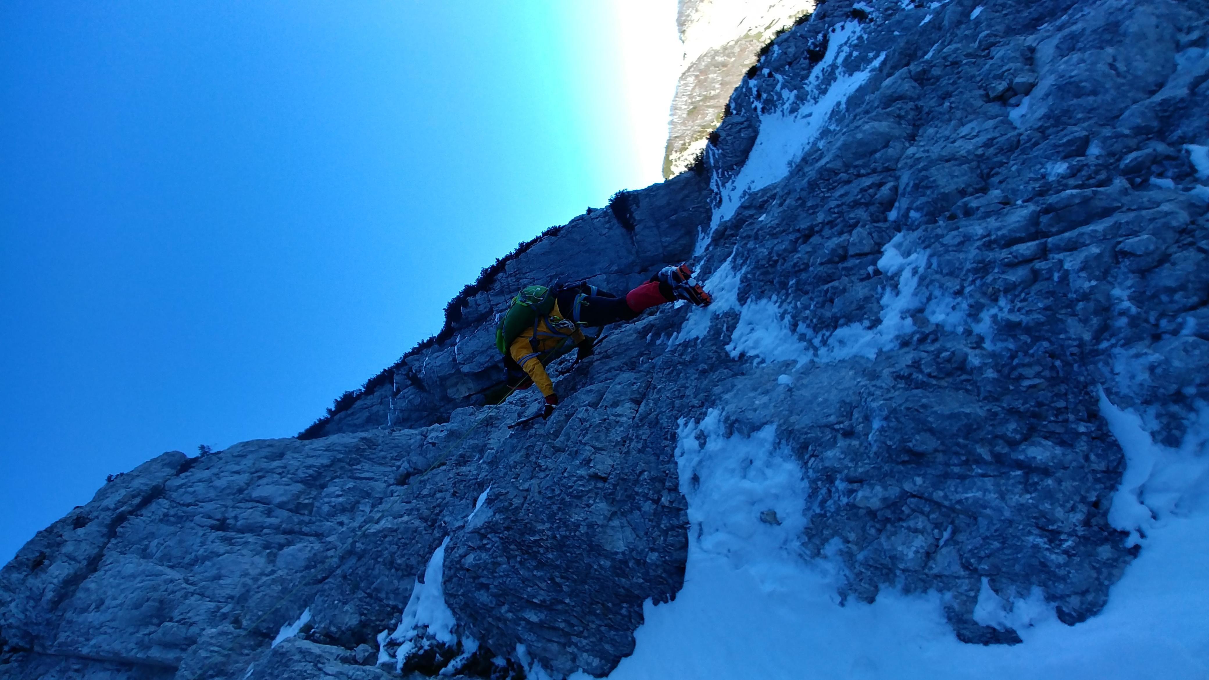 David se je podal v prvi raztežaj, ki je bil vse prej kot prijazen in lahek. Sama skala, mestoma obupno krušljiva, mi pa s cepini in derezami. Med praskajočimi zvoki je celo David izustil kar nekaj krepkih, raztežaj zaključil še z zoprno prečko in si prislužil večno občudovanje mladih pripravnikov. Resno, vsa čast! Zatem sva se v cug podala še midva z Nejcem, pri čemer se je Nejc (ne)prostovoljno javil, da me odreši izbijanja klinov. Že tako ne vem, kako sem pripraskala do Davida.