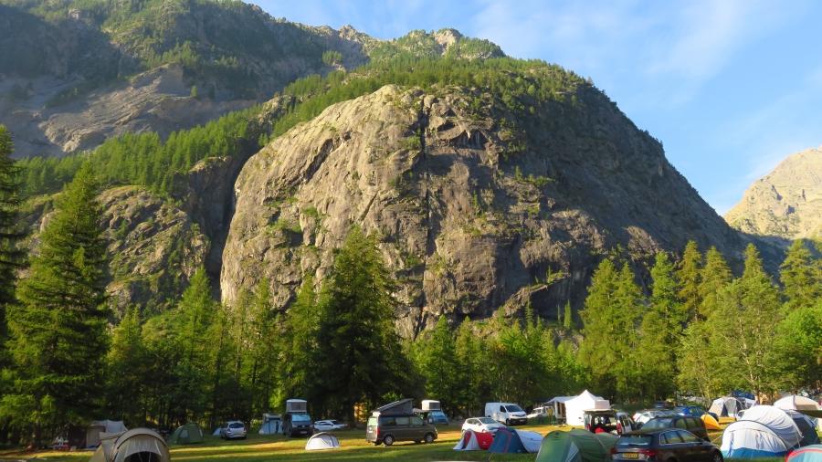 Kamp v vasici Ailefroide (izgovorjava Ajlefrojde :D, ha ha ha) pod mogočno goro Pelvoux je ogromen, a kljub temu je bil ob našem prihodu dodobra nabasan s Francozi, ki letos niso odpotovali na hrvaško obalo. Obdan je z višjimi in nižjimi granitnimi stenami, hribi in gorami, zato se čez dan vedno najdeta senca ali sonce, po želji, zdaj na eni zdaj na drugi strani doline. Mi smo iskali senco. Dva hudourniška potočka skrbita, da se glasovi morebitnih razgrajačev in smrčačev prav lepo zadušijo.