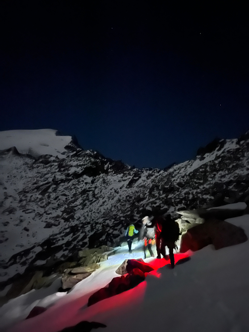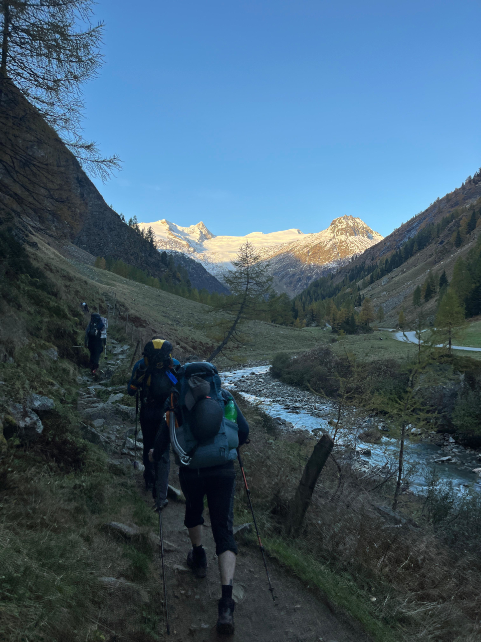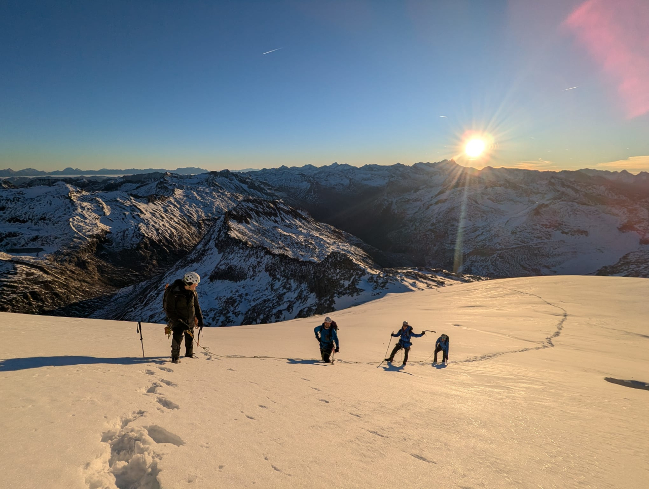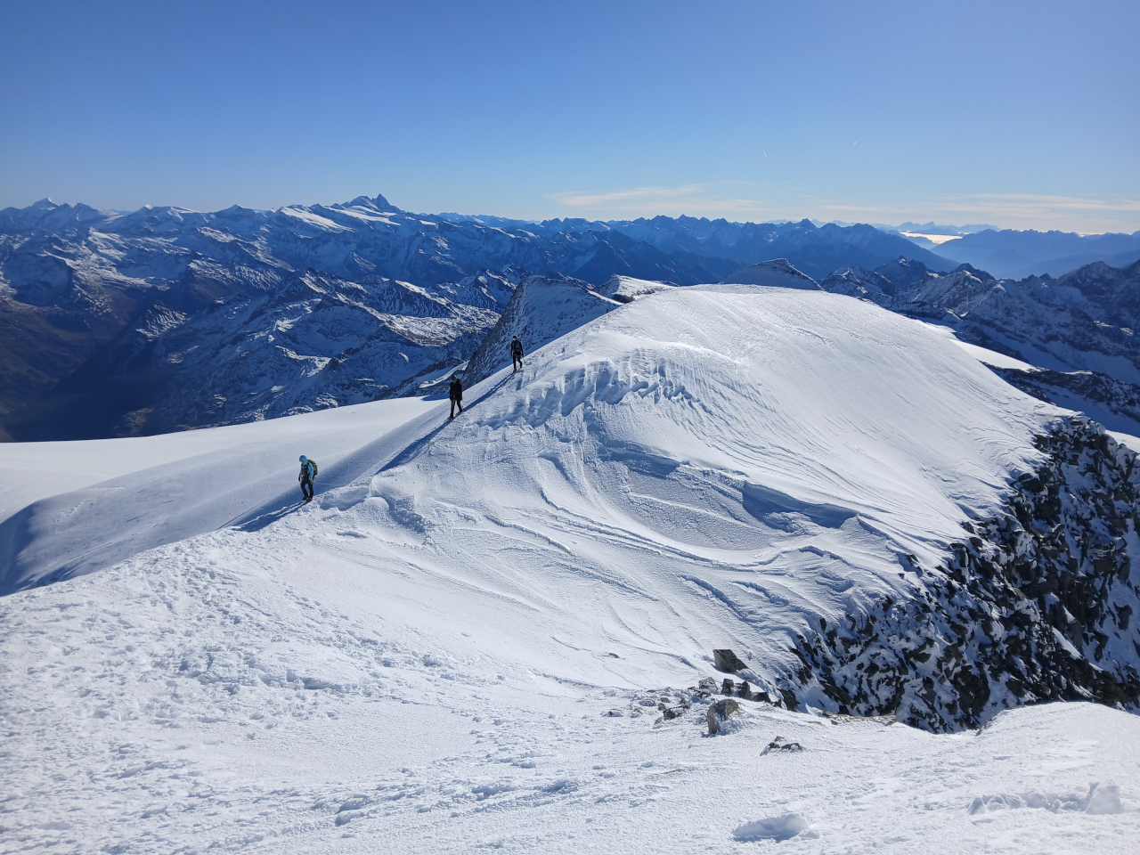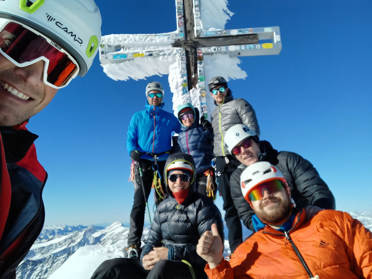 Drugi vikend v oktobru smo opravili načrtovano ledeniško turo. K izvedbi ture je odlično pripomoglo stabilno vremensko okno indijanskega poletja. V skupini nas je bilo sedem železničarjev – Tilen, Matej, Kristijan, Jakob, Vid, Maja in Tomaž. Po načrtu smo se iz Slovenije odpravili ob zgodnji uri ter še pred jutranjo zarjo zavili na parkirišče pred gostiščem Matreier Tauernhaus (1.512 m). Po ureditvi opreme smo krenili po poti 925 skozi macesnov gozd do vasi Innergschloss. Na zahodu so se nad dolino že bleščala pobočja ledenikov. Po poti 921 smo se nato vzpeli na planoto Salzboden, kjer se je odprl čudovit razgled na Schlatenkees. Kjer je na avstrijski planinski topografski karti še narisan širok spodnji del ledenika, so sedaj le še suhe zglajene skale in sivo ledeniško jezero. Po južnem pobočju smo se vzpeli do stare koče Praeger (2.489 m) ter nadaljevali čez zaplate snega do nove koče Praeger (2.796 m), kjer smo se namestili v zimsko sobo. Najprej smo si vzeli čas za zaslužen počitek, nato pa v popoldanskih urah skladno z doktrino privajanja na višino zagazili v snegu med balvani svežo sled dodatnih dvesto višinskih metrov pod skalnim grebenom Niderer Zaun do roba ledenika (3.001 m) ter si ogledali, kje bomo naslednji dan pristopili nanj. Na poti nazaj smo lahko v ledeniškem potoku natočili svežo ledenico ter si tako prihranili nekaj taljenja snega. Po povratku do koče smo v zimski sobi prepustili eno od spalnic skupini petih mladih Madžarov, ki so prispeli v večernem mraku. Zvečer smo na sestanku sestavili naveze in se dogovorili za jutranjo taktiko. Bivanje v zimski sobi nam je precej olajšal štedilnik na drva, kjer smo pripravili večerjo in čaj za na pot. Naslednje jutro je budilka zgodaj zvonila. Zunaj nas je pričakalo jasno zvezdnato nebo, brezvetrje in ledenik, ki se je svetil v mesečini. Skupina Madžarov je odrinila že pred nami. Izpred koče smo lahko spremljali zaporedje svetilk, ko so se vzpenjali po gazi. Po zajtrku smo si tudi mi pripravili vso opremo ter se premaknili do vstopa na ledenik. Pri zadnjih balvanih smo se ob jutranji zori navezali v dve ledeniški navezi. Že nekaj sto metrov višje nas je na ledeniku ujelo sonce, ki je vzšlo za Velikim Klekom. Prva naveza je vztrajno držala umirjen tempo napredovanja in tako smo v obeh navezah razmeroma spočiti dosegli plato pod Kleinvenedigerjem. Šele tu smo zagledali vršno gmoto Grossvenedigerja na zahodu, odprl pa se je tudi dih jemajoč razgled na vse strani. Doline so bile zalite z meglo, mi pa smo se kopali v soncu. Nekateri v skupini so že občutili vpliv višine. V zavetrju pod pobočjem smo naredili kratek postanek, nato pa smo se po zahodnem snežišču in grebenu vzpeli na vrh Grossvenedigerja (3.667 m). Vsi smo od veselja zavriskali, opravili smo obvezno skupinsko fotografiranje ter se kmalu spustili nazaj v zavetrje. Med sestopom smo srečali še dve dvojni navezi. Po počitku na Venedigerjevi škrbini smo zavili nekoliko bolj desno kot pri pristopu, ter po izohipsi obšli Kleinvenediger. Tu je opoldansko sonce že pokazalo svojo moč in omehčalo snežno površino. V velikih lokih smo se izogibali razpokam in brez ustavljanja nadaljevali, dokler nismo vsi varno sestopili med prve balvane. Sledil je še sestop do koče, pospravljanje in vpis v knjigo gostov. Dolgemu sestopu v dolino je sledilo še kar nekaj otovorjenih kilometrov do parkirišča, ko se je v dolino že spuščal mrak. Analizo smo opravili ob odlični pici v Lienzu. Tura je uspela, vsi sodelujoči so opravili prečenje ledenika in pristop nad 3.500 m v tujem gorstvu. Zahvala gre celotni skupini za odlično vzdušje.