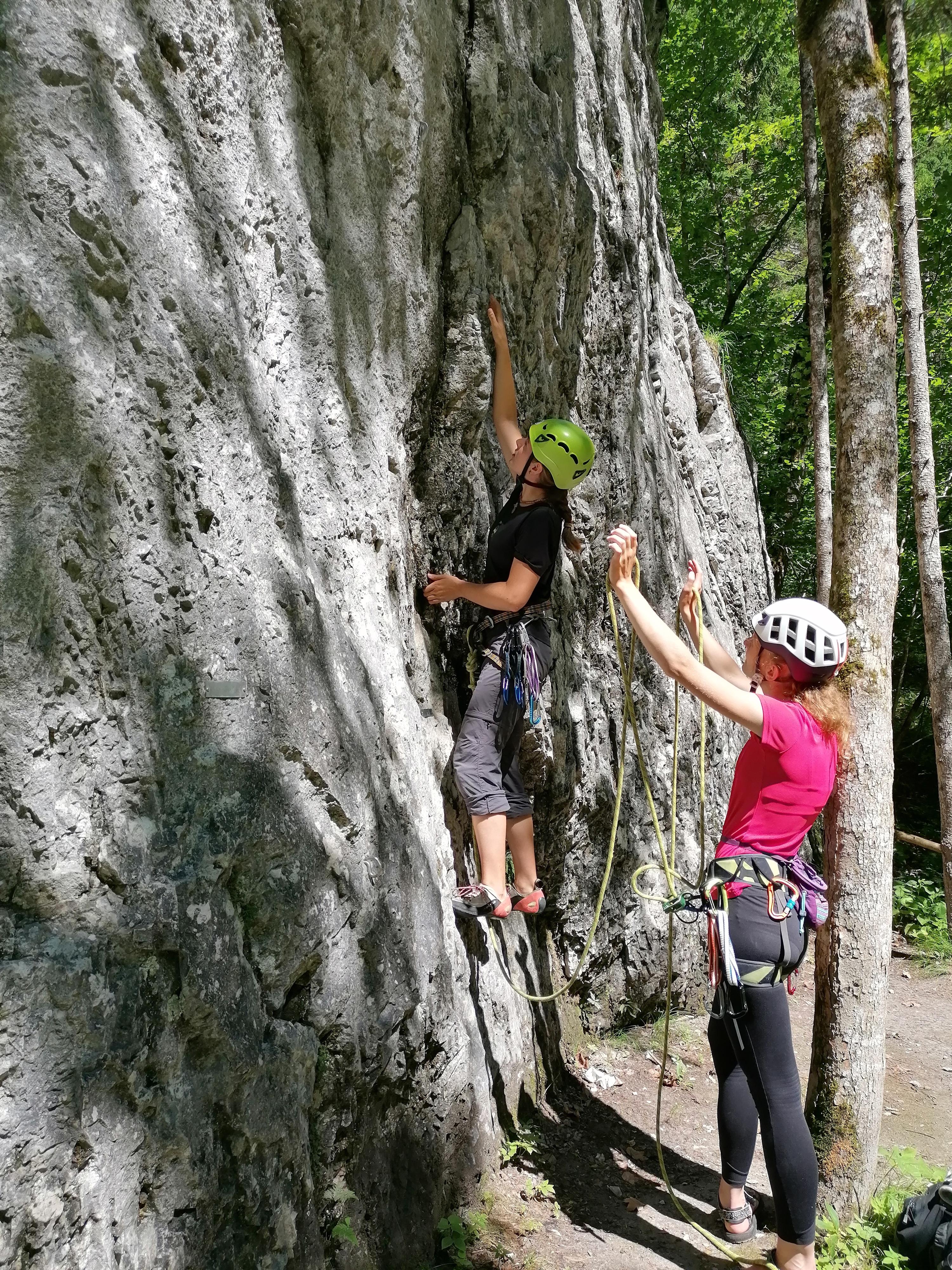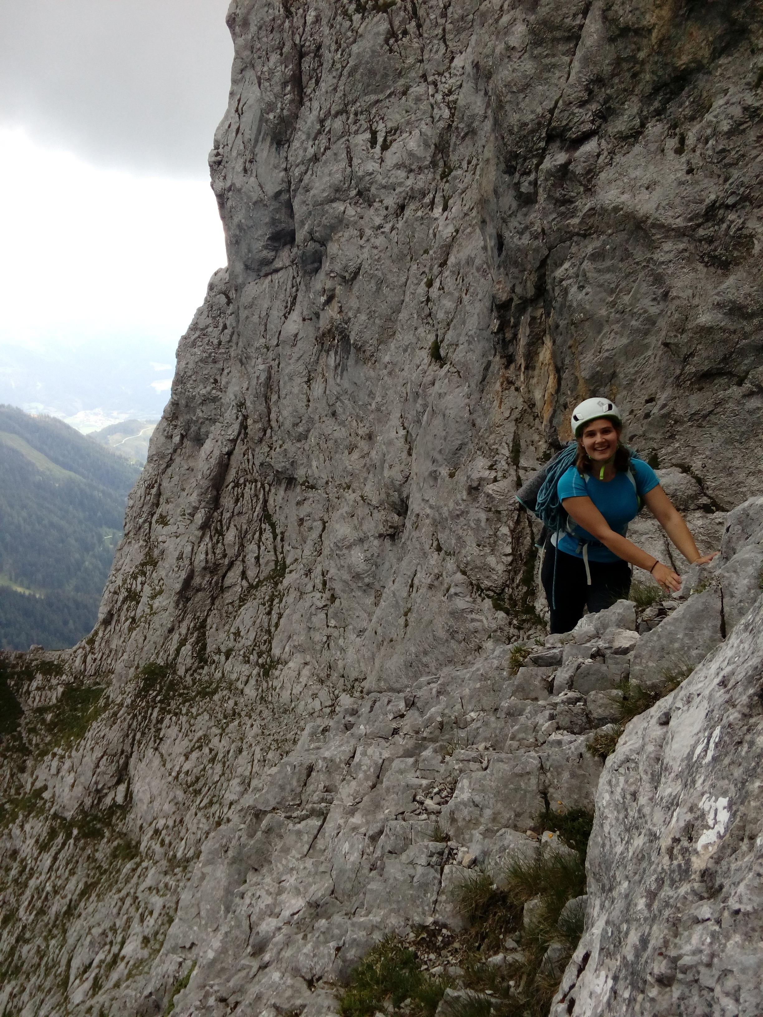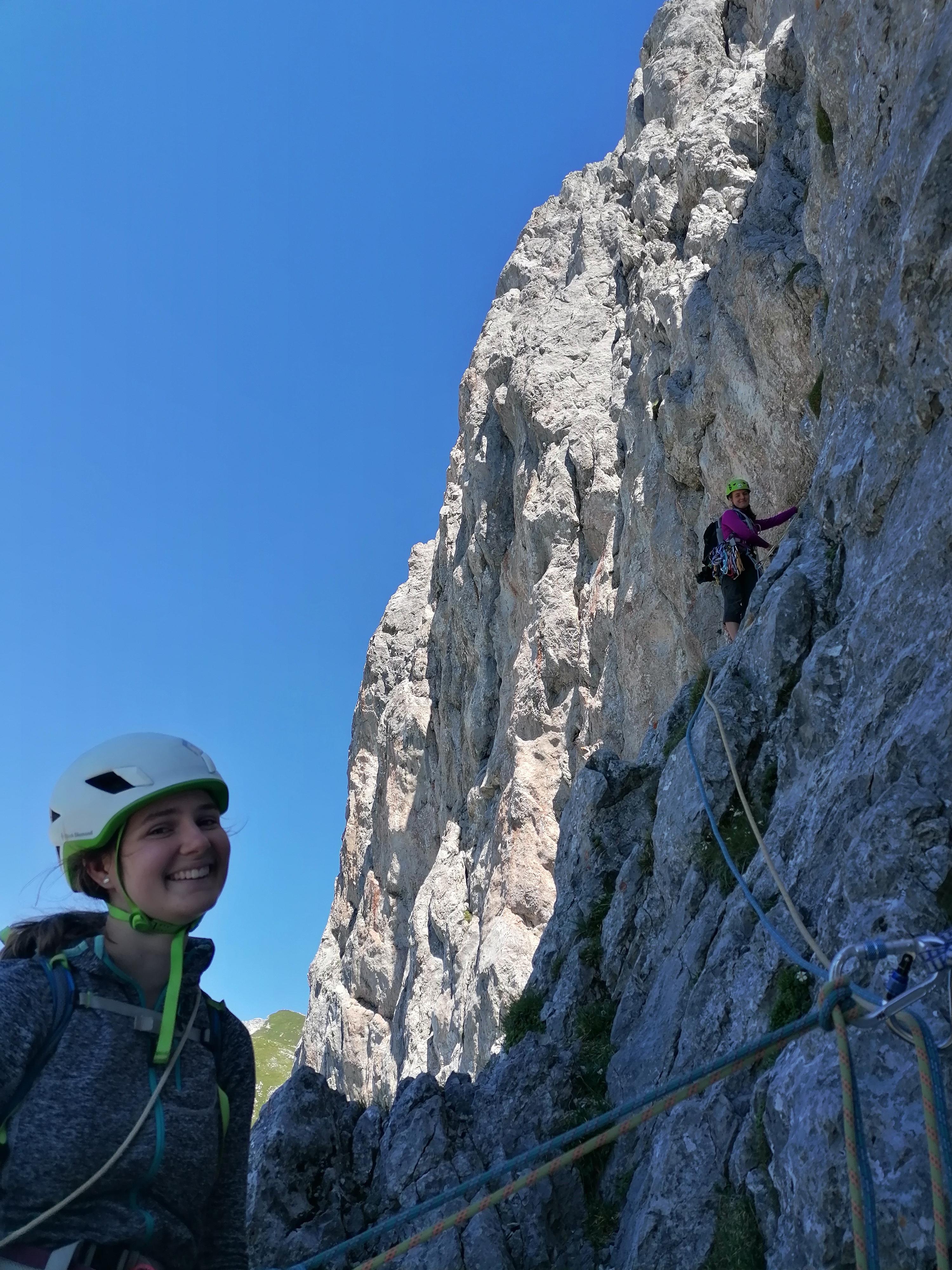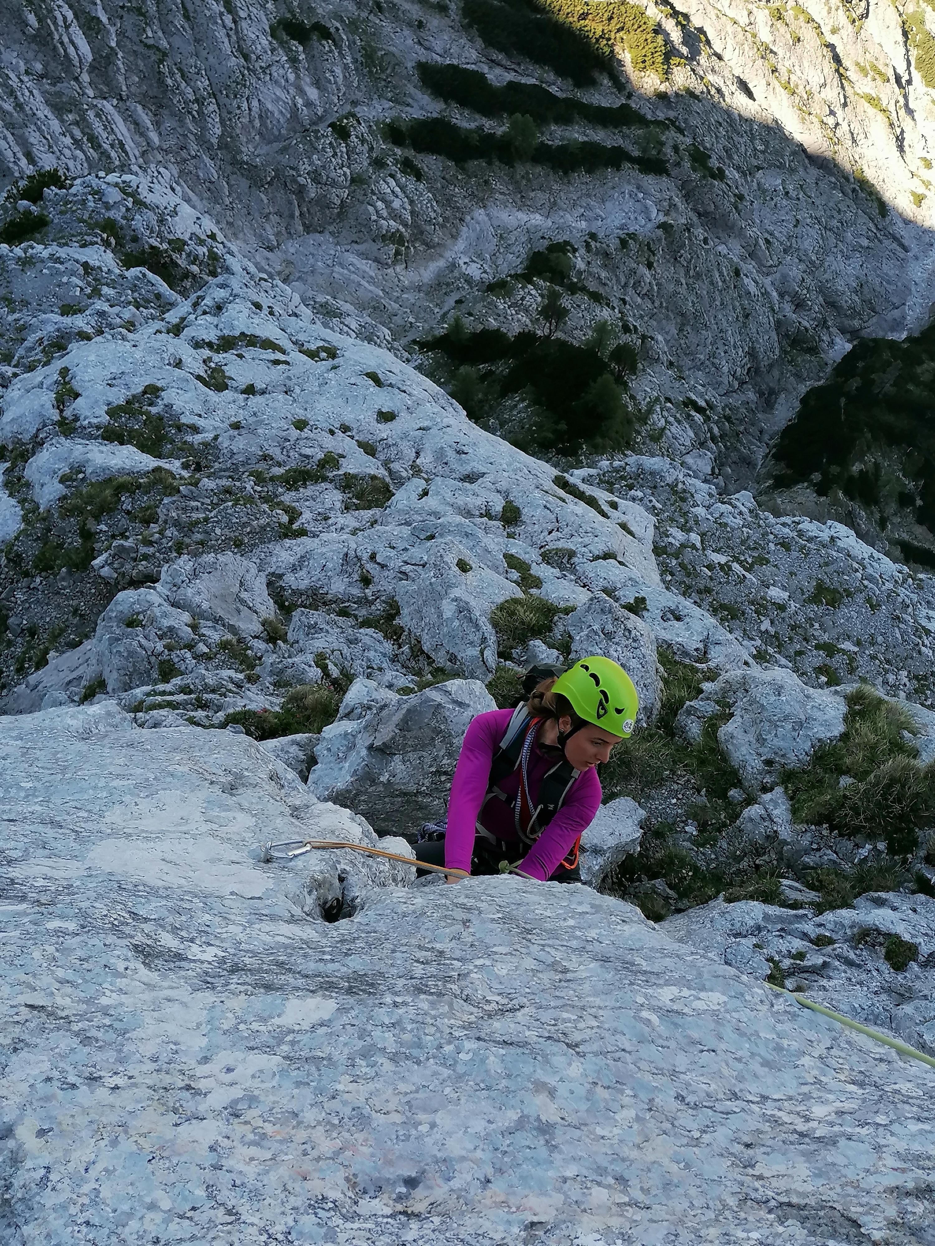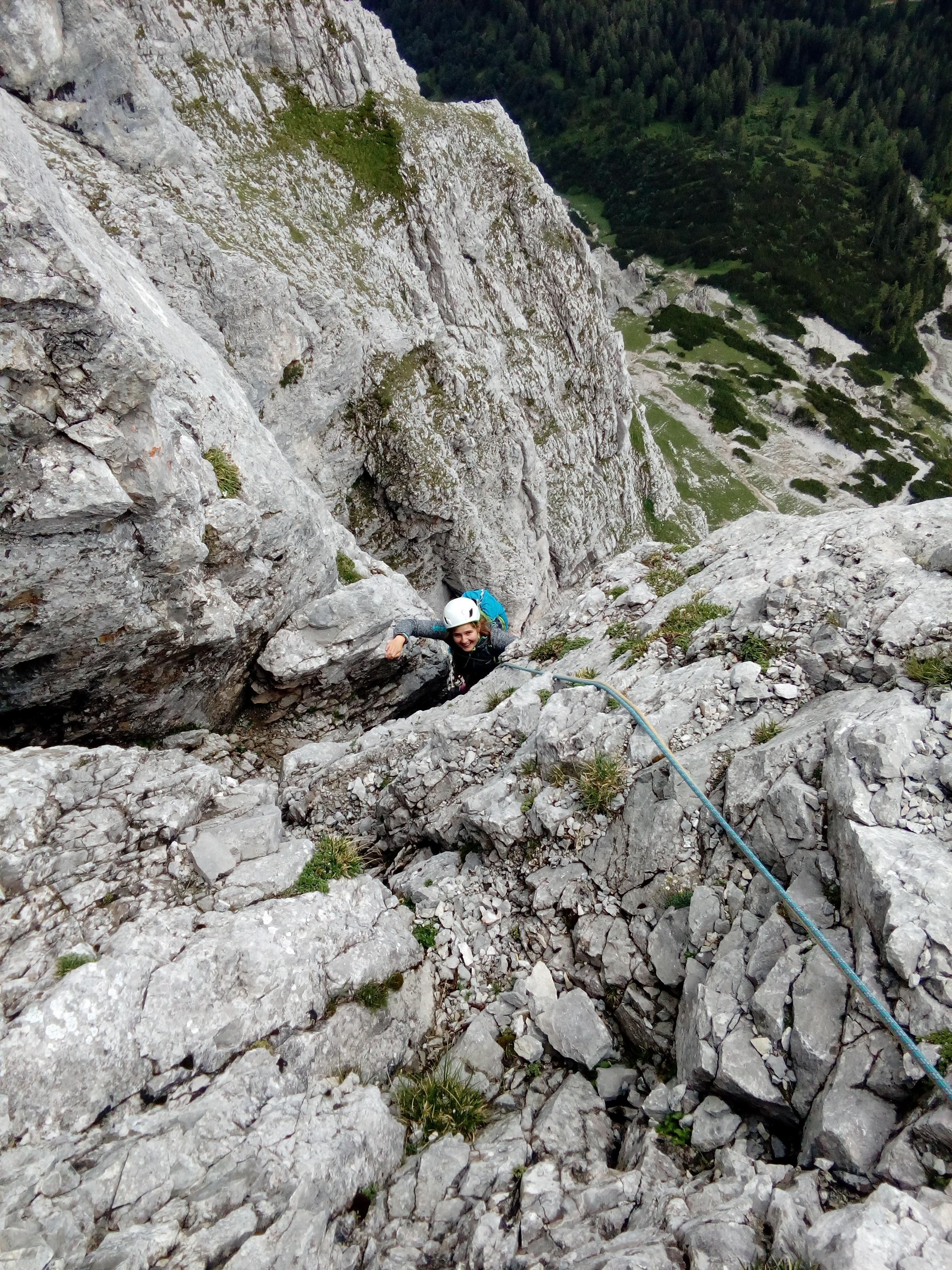 Prvi dan smo že precej zgodaj štartali iz Ljubljane, kjer smo morali najprej 2x zložiti vso prtljago in se šele nato odpeljali proti našemu cilju. Turobnemu vremenu navkljub smo se podali v južno steno gore Kalbling, do katere nas je čakal kratek enourni dostop. Naslednje pol ure smo porabili za poplezavanje (II-III) do začetka smeri Waidhofnerwerg (V+, 200m). Kaja se je zapodila v prvi raztežaj, ki naju je presenetil s svojo težavnostjo. Tudi skala se nama sprva ni zdela pretirano kvalitetnejša od slovenske. Takoj se je v nama prebudilo prav posebno spoštovanje do stene in naju postavilo na realna tla glede najinih plezalskih načrtov za prihajajoči teden. Smer je bila sicer precej dobro opremljena, le na nekaterih delih, kjer si človek ne bi želel pasti, ni bilo možno niti zabiti klina niti nastaviti kakšnega drugega varovanja. Plezanje je bilo večinoma precej zračno in izpostavljeno, gneče v steni pa ta dan na srečo ni bilo. Na grebenu sva pospravili opremo in se v suhem vremenu najprej po grebenu povzpeli na vrh, nato pa po prijazni planinski poti sestopili do avtomobila. Med potjo sva molče zrli v okoliške hribe, ki so nama dajali občutek domačnosti s svojimi zelenimi gozdovi in sivimi stenami.
