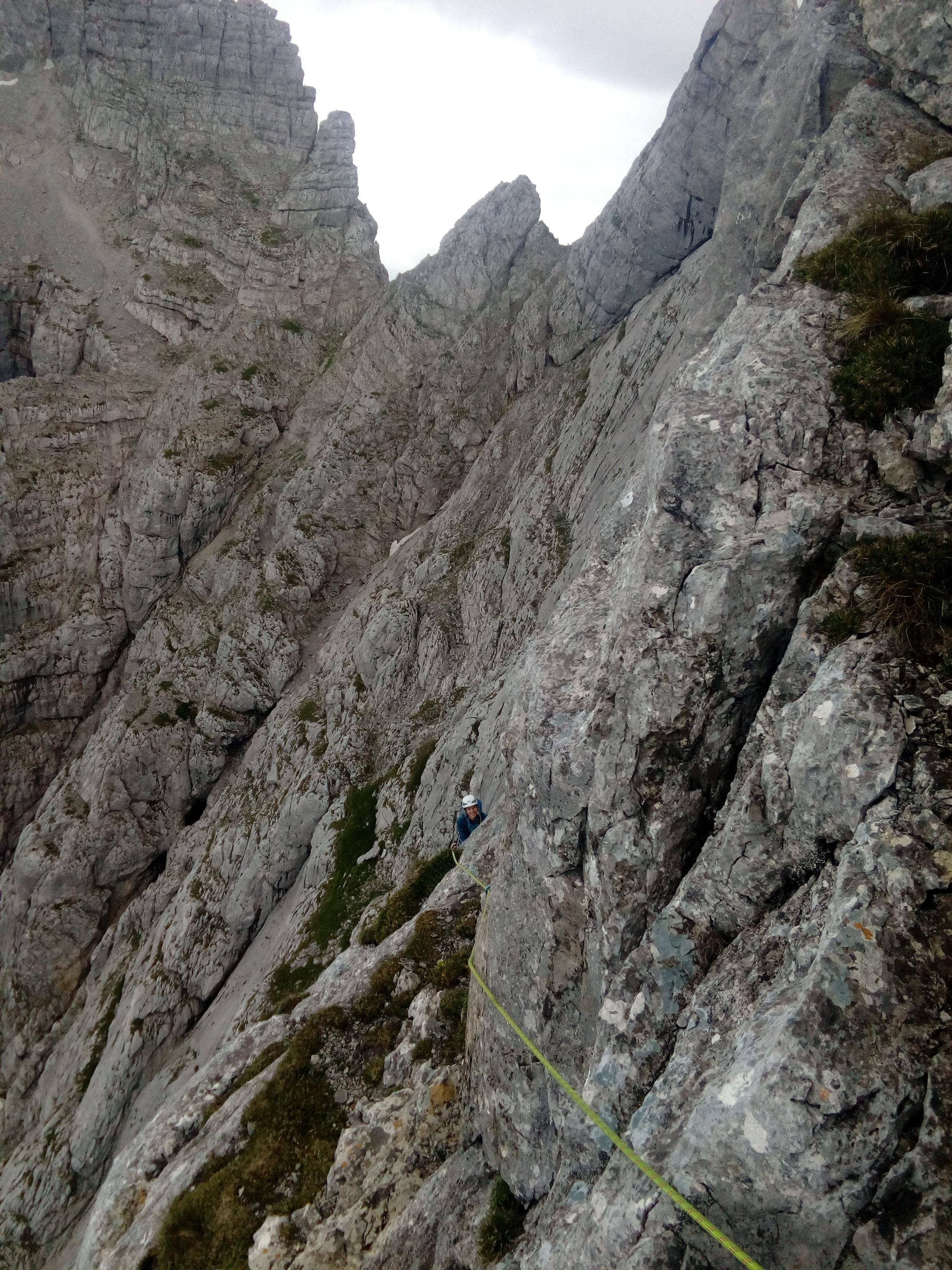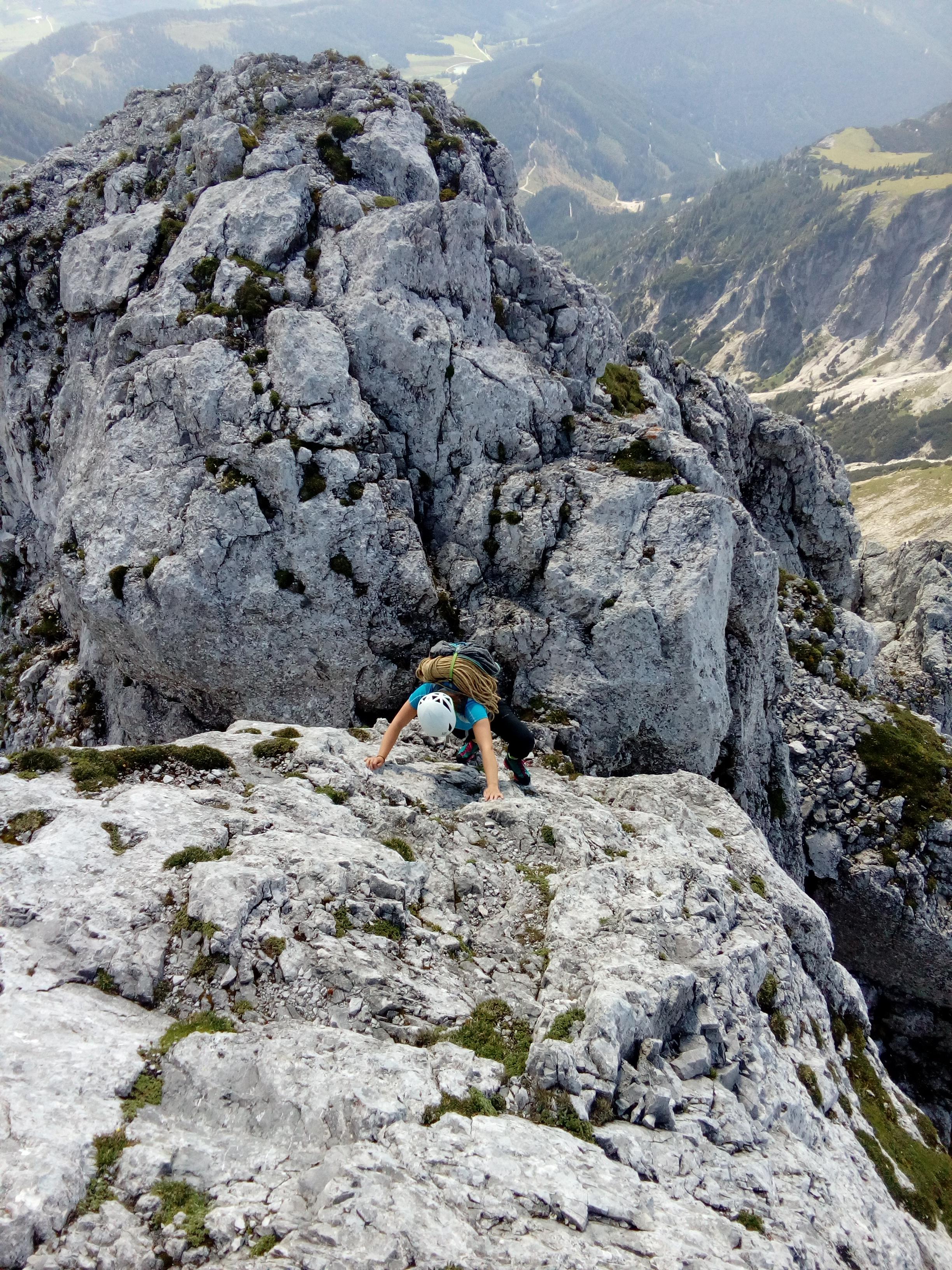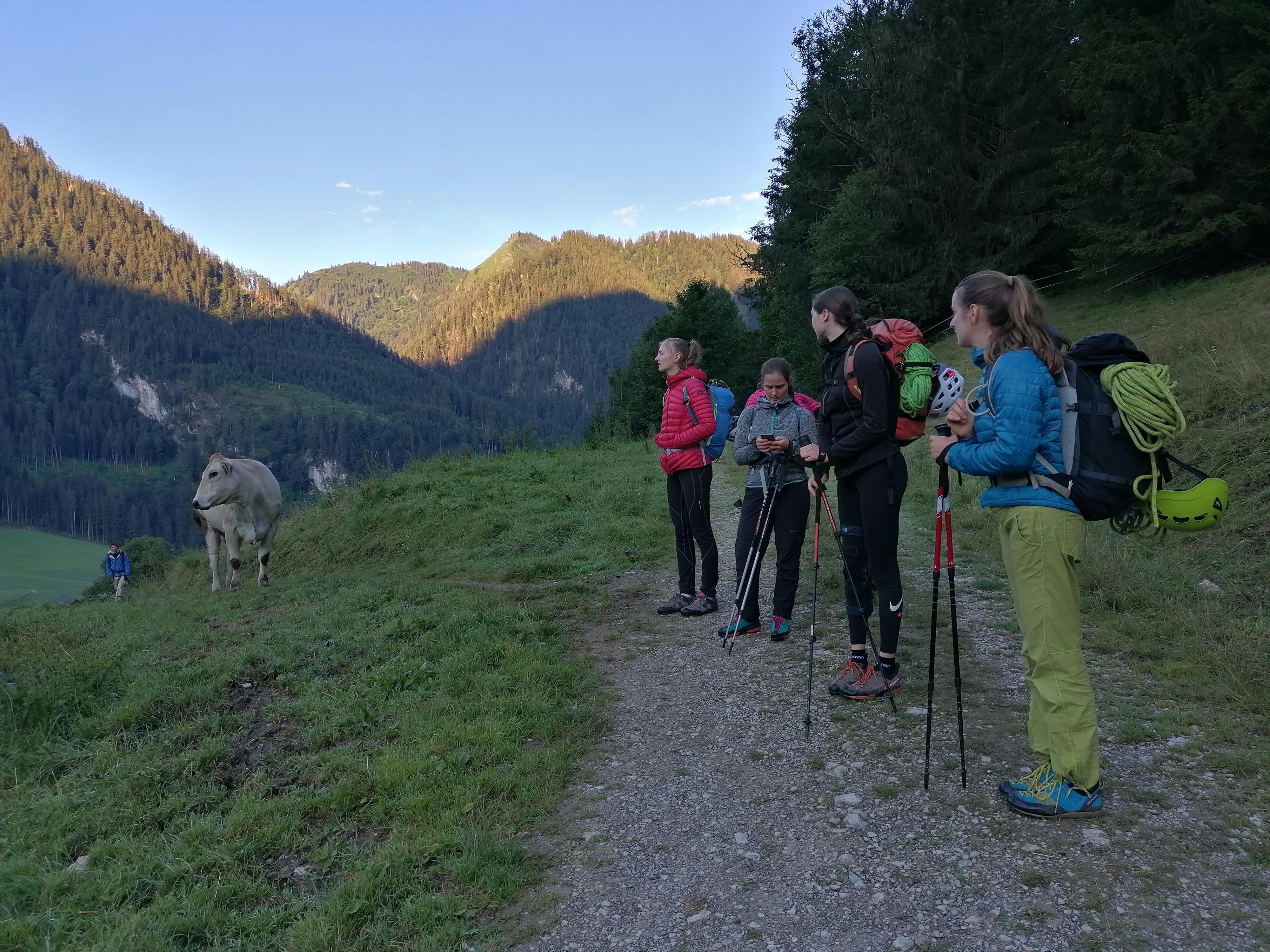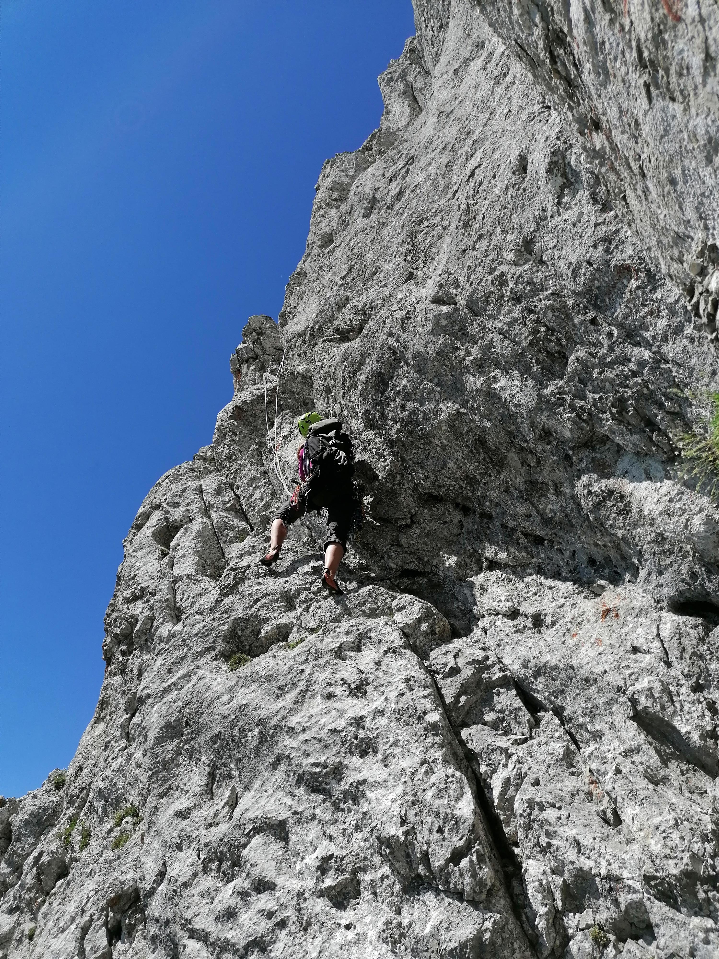 Prvi dan smo že precej zgodaj štartali iz Ljubljane, kjer smo morali najprej 2x zložiti vso prtljago in se šele nato odpeljali proti našemu cilju. Turobnemu vremenu navkljub smo se podali v južno steno gore Kalbling, do katere nas je čakal kratek enourni dostop. Naslednje pol ure smo porabili za poplezavanje (II-III) do začetka smeri Waidhofnerwerg (V+, 200m). Kaja se je zapodila v prvi raztežaj, ki naju je presenetil s svojo težavnostjo. Tudi skala se nama sprva ni zdela pretirano kvalitetnejša od slovenske. Takoj se je v nama prebudilo prav posebno spoštovanje do stene in naju postavilo na realna tla glede najinih plezalskih načrtov za prihajajoči teden. Smer je bila sicer precej dobro opremljena, le na nekaterih delih, kjer si človek ne bi želel pasti, ni bilo možno niti zabiti klina niti nastaviti kakšnega drugega varovanja. Plezanje je bilo večinoma precej zračno in izpostavljeno, gneče v steni pa ta dan na srečo ni bilo. Na grebenu sva pospravili opremo in se v suhem vremenu najprej po grebenu povzpeli na vrh, nato pa po prijazni planinski poti sestopili do avtomobila. Med potjo sva molče zrli v okoliške hribe, ki so nama dajali občutek domačnosti s svojimi zelenimi gozdovi in sivimi stenami.