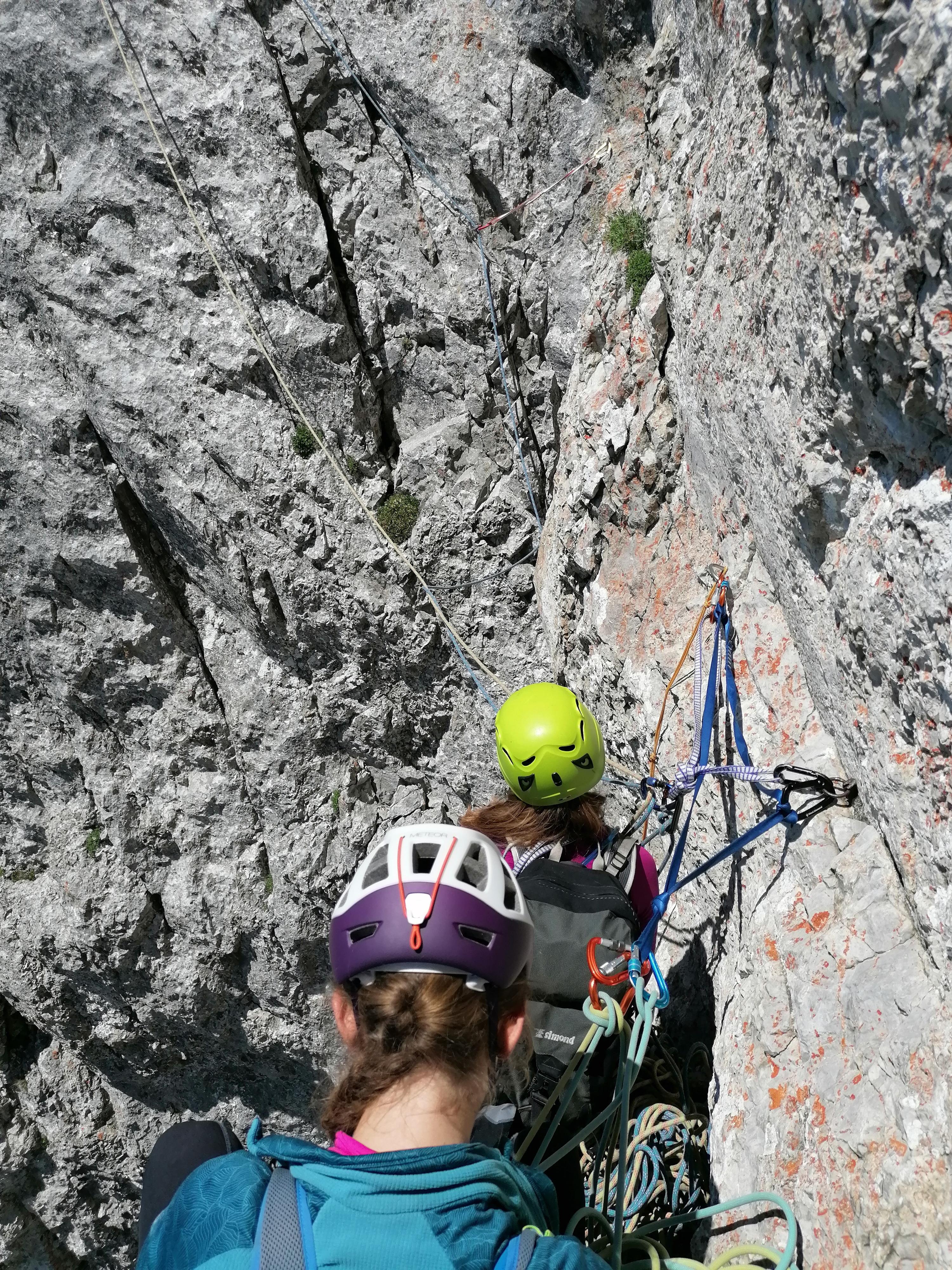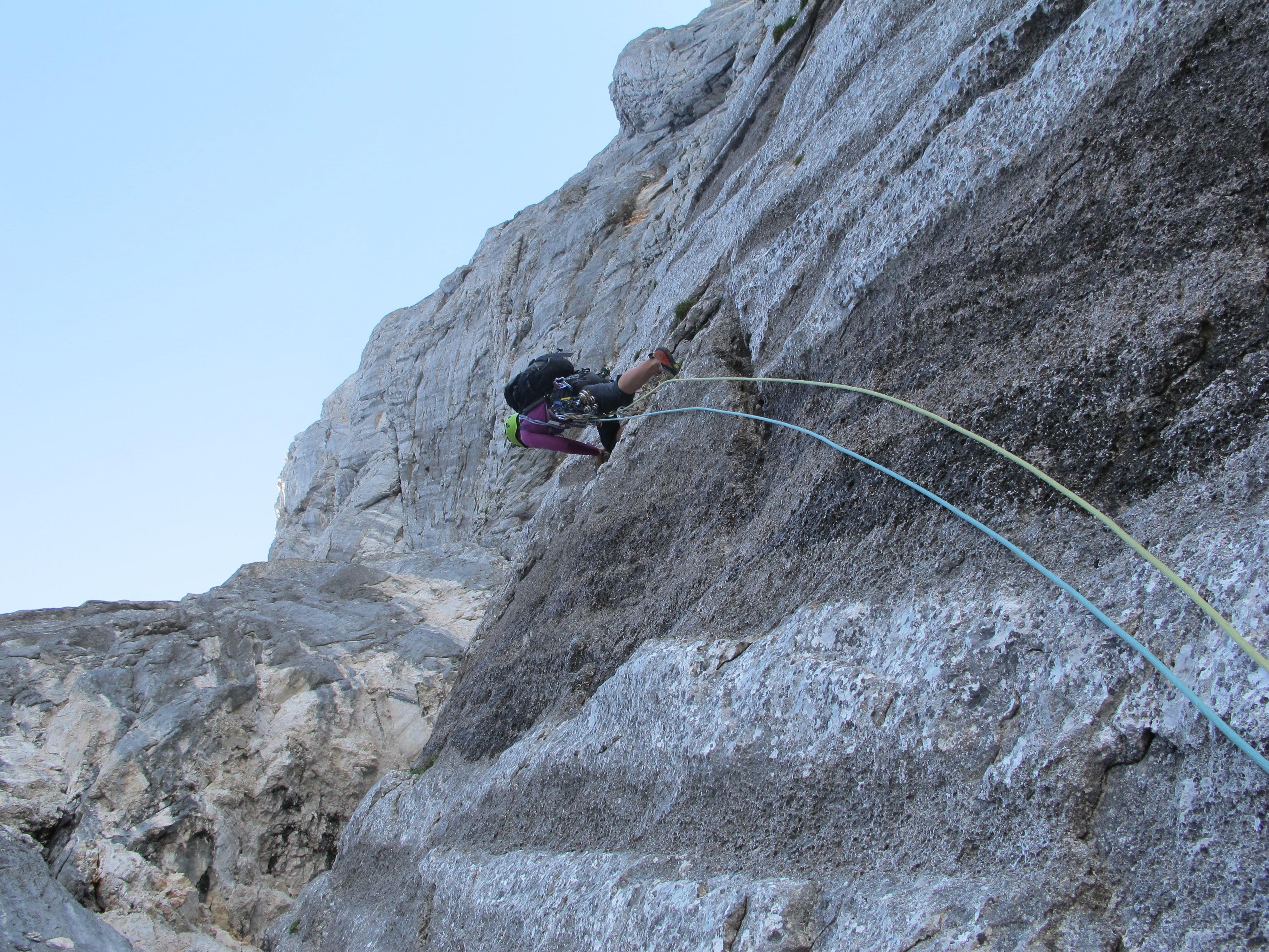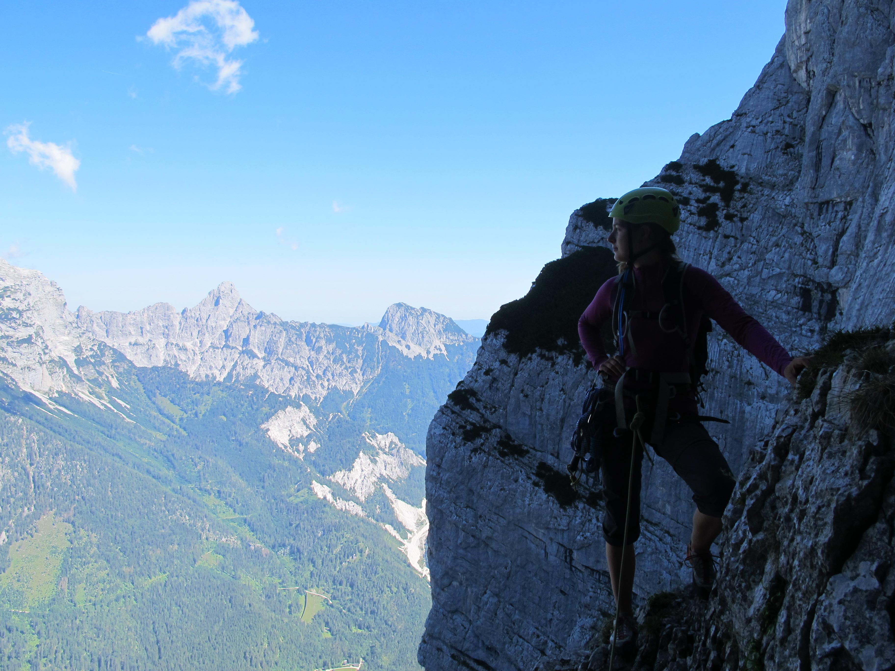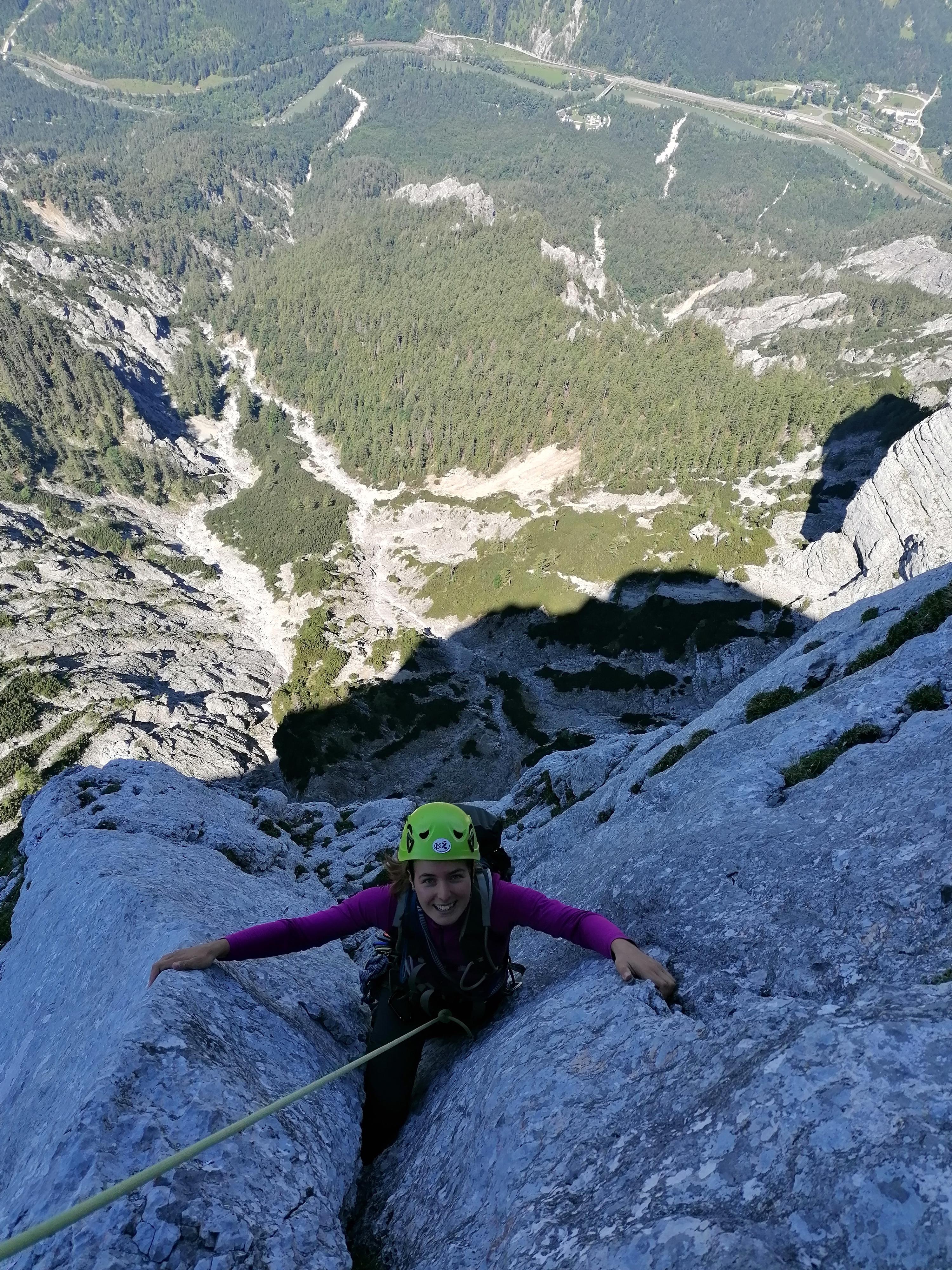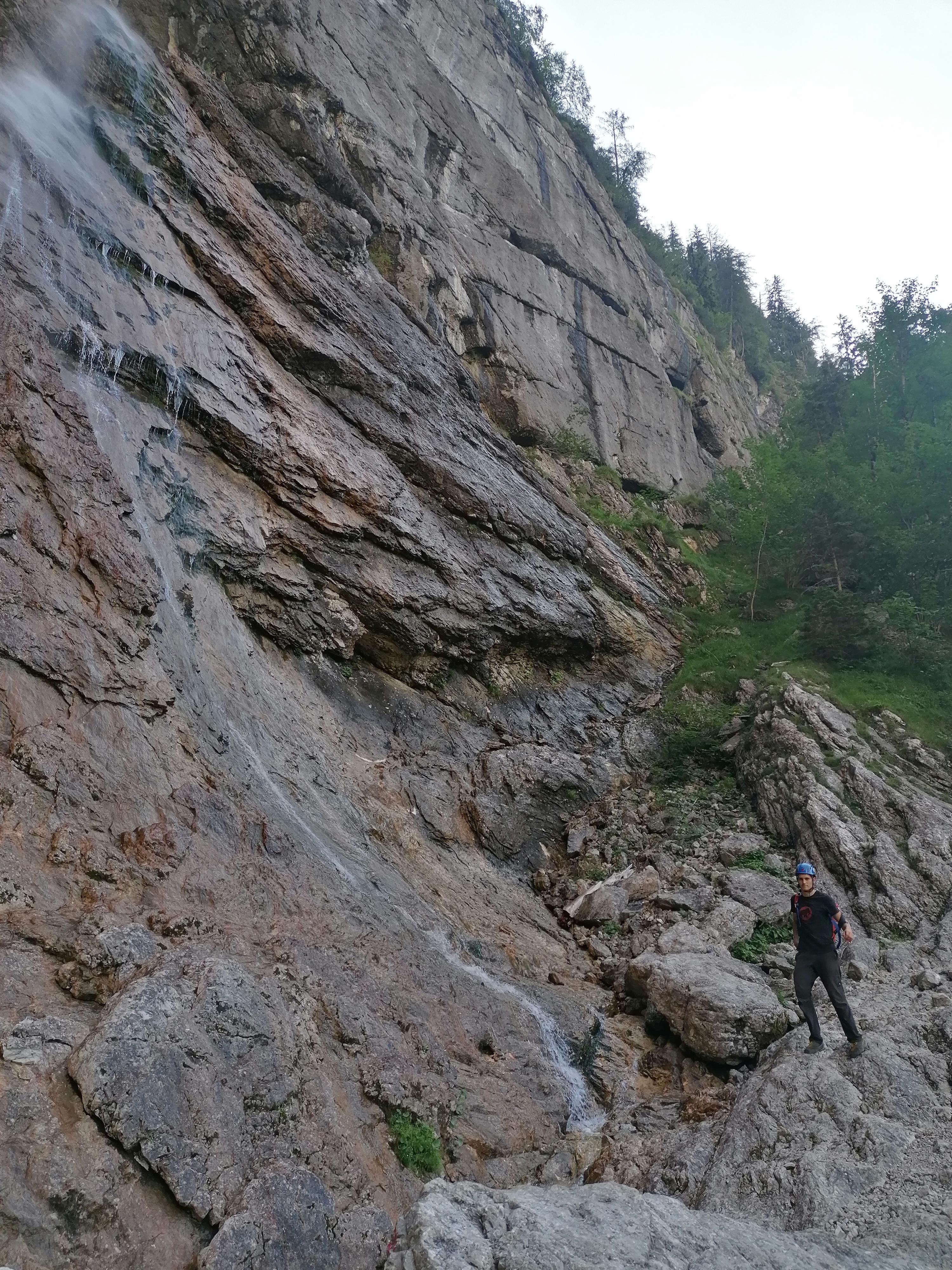 Prvi dan smo že precej zgodaj štartali iz Ljubljane, kjer smo morali najprej 2x zložiti vso prtljago in se šele nato odpeljali proti našemu cilju. Turobnemu vremenu navkljub smo se podali v južno steno gore Kalbling, do katere nas je čakal kratek enourni dostop. Naslednje pol ure smo porabili za poplezavanje (II-III) do začetka smeri Waidhofnerwerg (V+, 200m). Kaja se je zapodila v prvi raztežaj, ki naju je presenetil s svojo težavnostjo. Tudi skala se nama sprva ni zdela pretirano kvalitetnejša od slovenske. Takoj se je v nama prebudilo prav posebno spoštovanje do stene in naju postavilo na realna tla glede najinih plezalskih načrtov za prihajajoči teden. Smer je bila sicer precej dobro opremljena, le na nekaterih delih, kjer si človek ne bi želel pasti, ni bilo možno niti zabiti klina niti nastaviti kakšnega drugega varovanja. Plezanje je bilo večinoma precej zračno in izpostavljeno, gneče v steni pa ta dan na srečo ni bilo. Na grebenu sva pospravili opremo in se v suhem vremenu najprej po grebenu povzpeli na vrh, nato pa po prijazni planinski poti sestopili do avtomobila. Med potjo sva molče zrli v okoliške hribe, ki so nama dajali občutek domačnosti s svojimi zelenimi gozdovi in sivimi stenami.