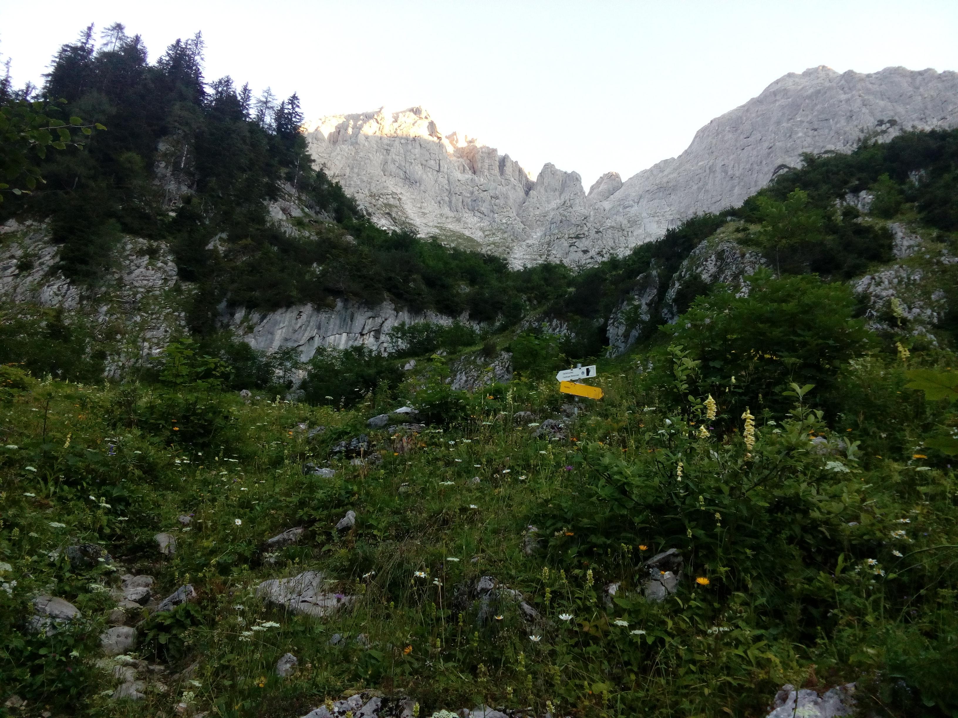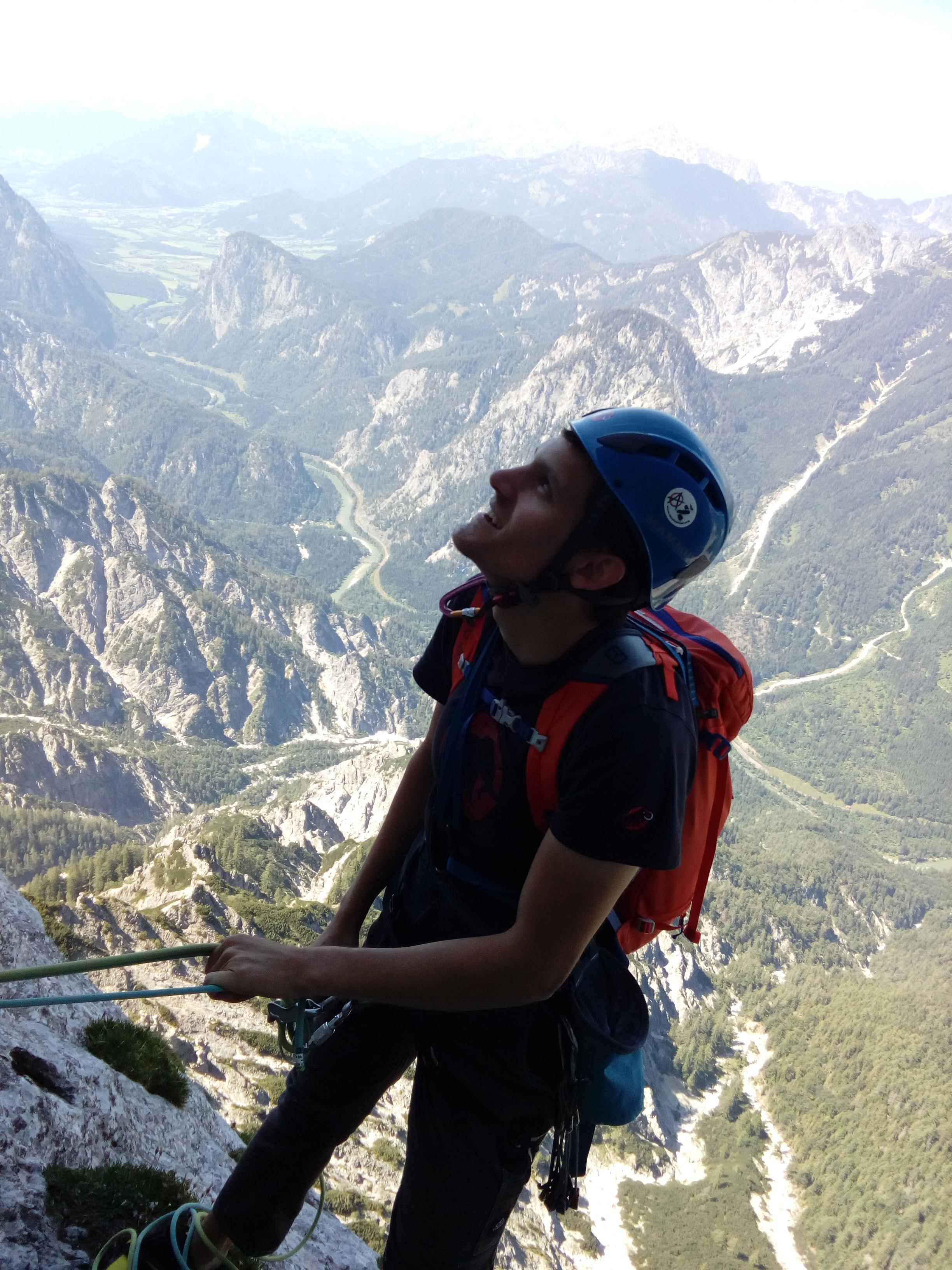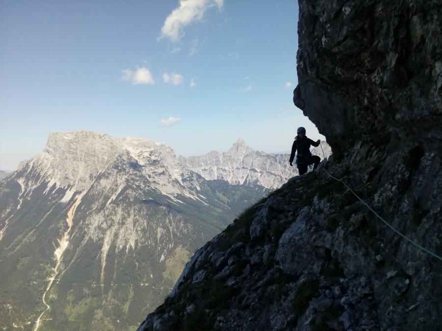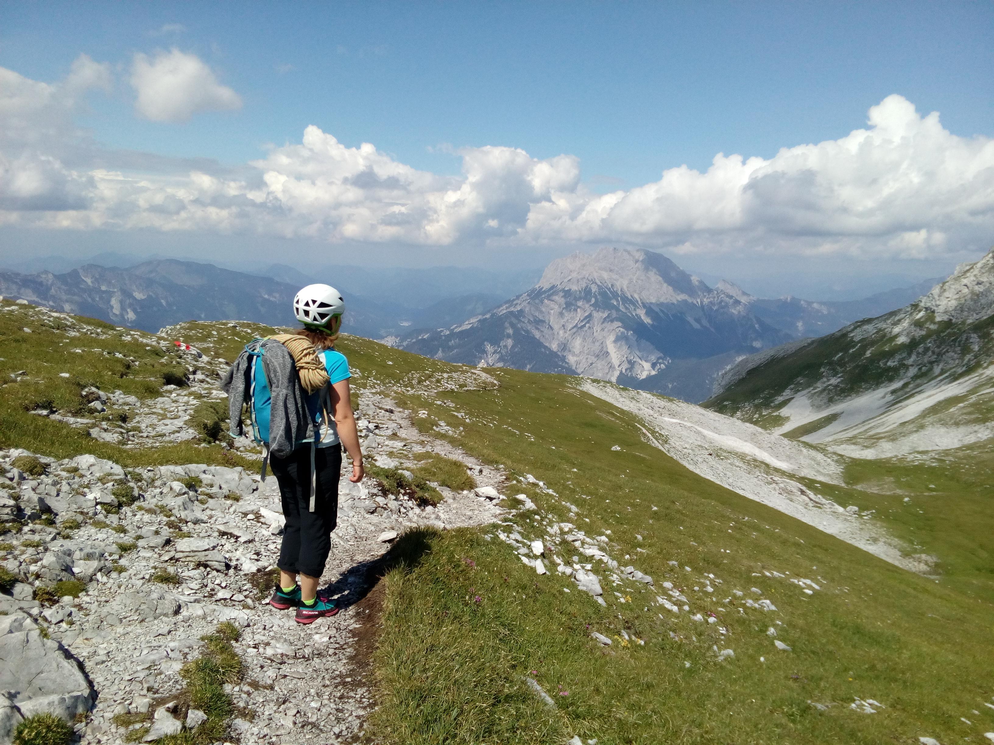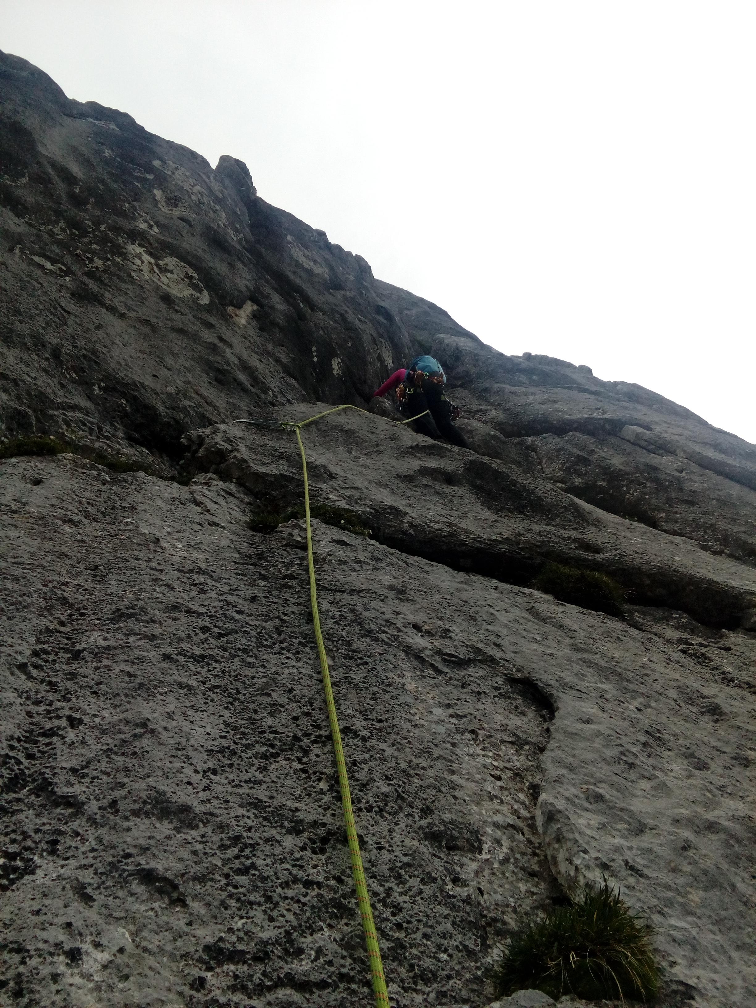Prvi dan smo že precej zgodaj štartali iz Ljubljane, kjer smo morali najprej 2x zložiti vso prtljago in se šele nato odpeljali proti našemu cilju. Turobnemu vremenu navkljub smo se podali v južno steno gore Kalbling, do katere nas je čakal kratek enourni dostop. Naslednje pol ure smo porabili za poplezavanje (II-III) do začetka smeri Waidhofnerwerg (V+, 200m). Kaja se je zapodila v prvi raztežaj, ki naju je presenetil s svojo težavnostjo. Tudi skala se nama sprva ni zdela pretirano kvalitetnejša od slovenske. Takoj se je v nama prebudilo prav posebno spoštovanje do stene in naju postavilo na realna tla glede najinih plezalskih načrtov za prihajajoči teden. Smer je bila sicer precej dobro opremljena, le na nekaterih delih, kjer si človek ne bi želel pasti, ni bilo možno niti zabiti klina niti nastaviti kakšnega drugega varovanja. Plezanje je bilo večinoma precej zračno in izpostavljeno, gneče v steni pa ta dan na srečo ni bilo. Na grebenu sva pospravili opremo in se v suhem vremenu najprej po grebenu povzpeli na vrh, nato pa po prijazni planinski poti sestopili do avtomobila. Med potjo sva molče zrli v okoliške hribe, ki so nama dajali občutek domačnosti s svojimi zelenimi gozdovi in sivimi stenami.