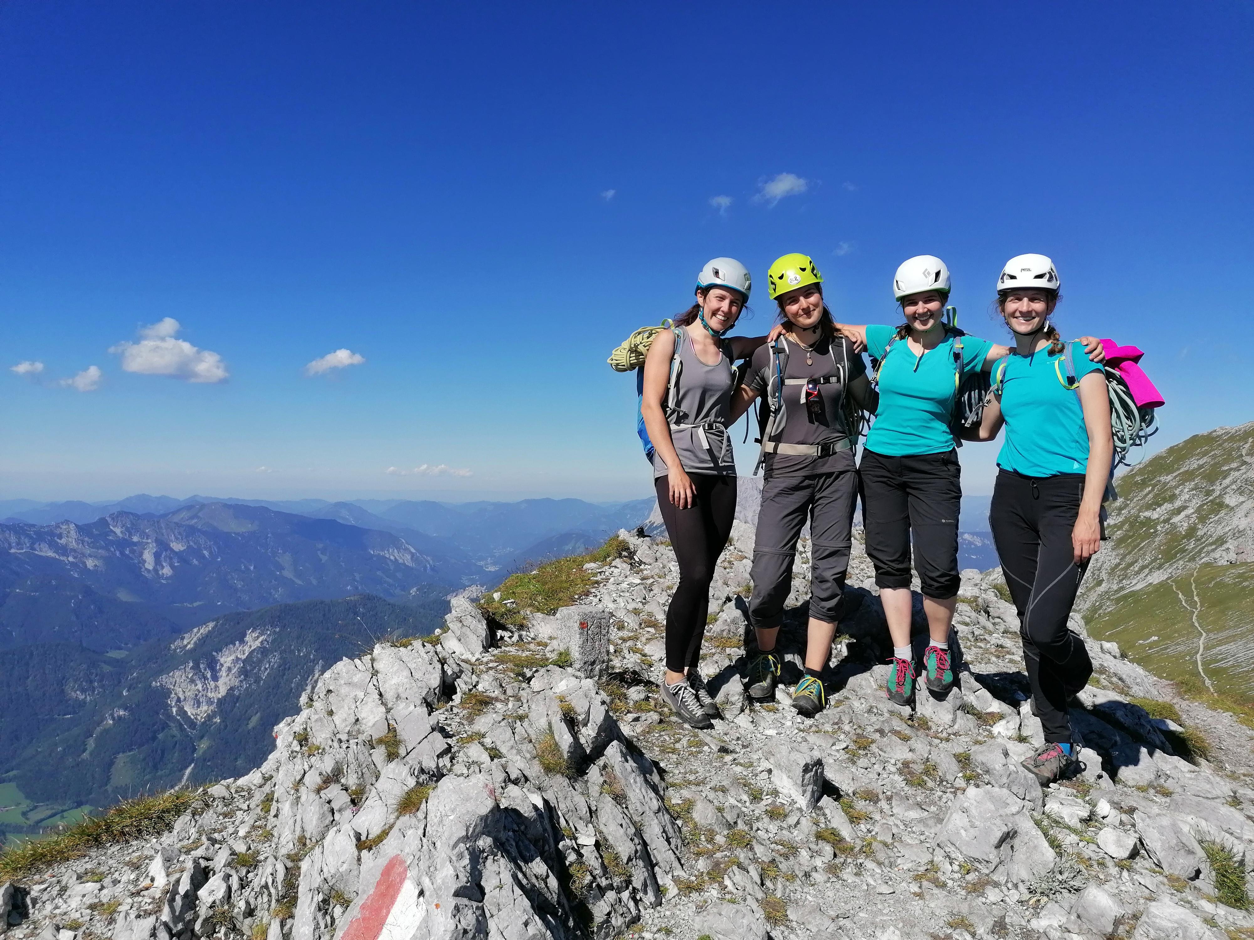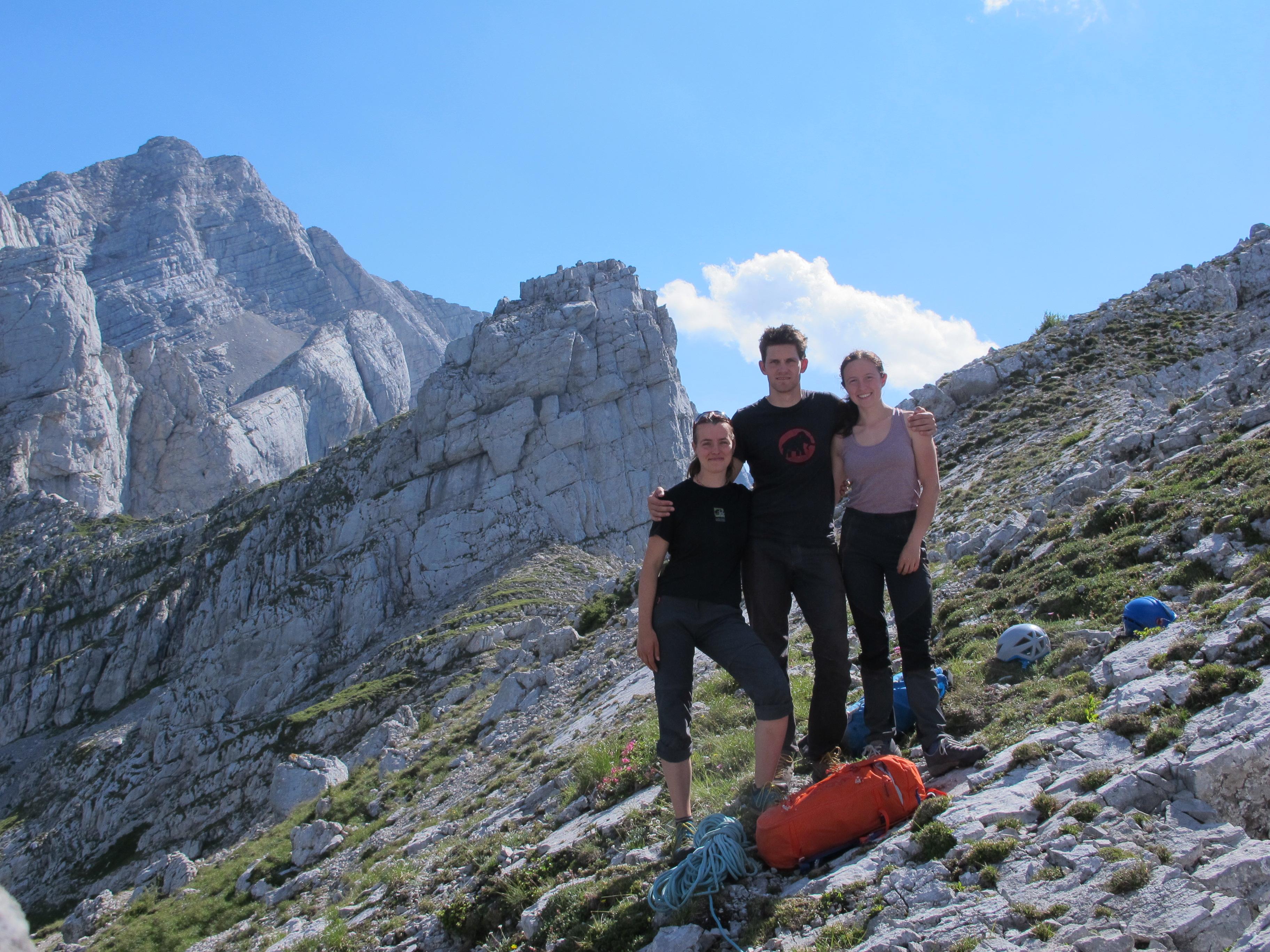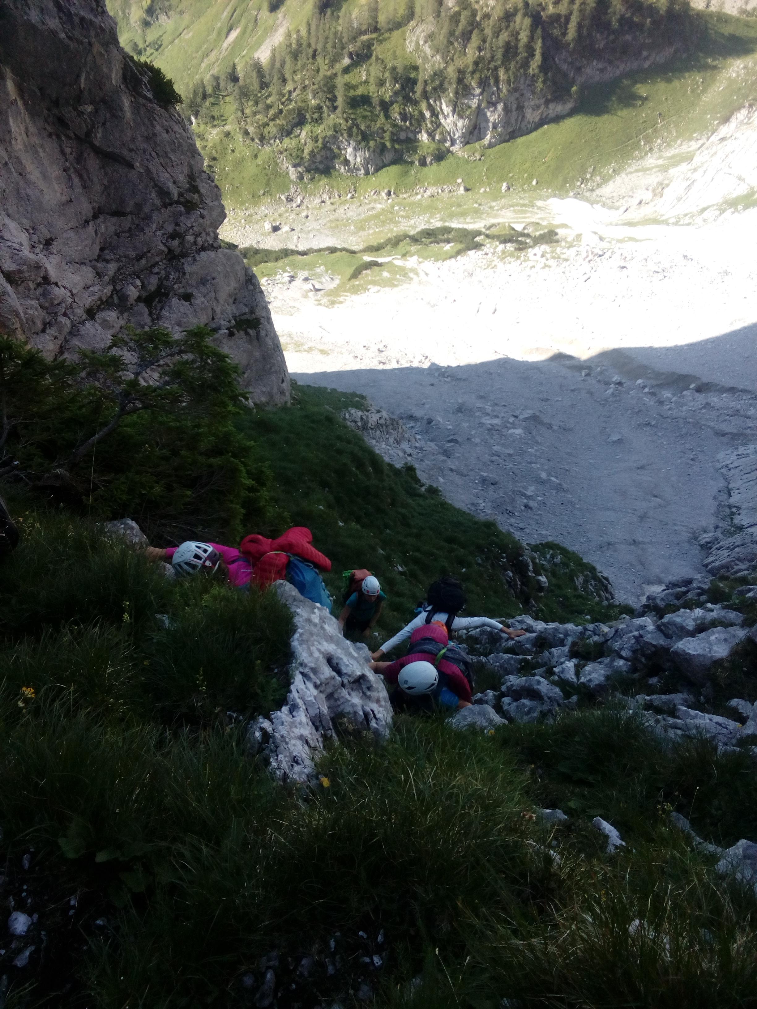 Na kratko povzeto o plezanju v Gesauseju – dostopi do sten so večinoma daljši, velikokrat je potrebno poplezavanje že samo da prideš do pod smeri. Smeri so se mi na splošno zdele malenkost težje kot so bile ocenjene, so bile pa smeri, ki sem jih plezala jaz, dobro opremljene (svedri, klini). Za tiste bolj resne pa se seveda najdejo tudi bolj resne alpinistične smeri, kjer smeri niso opremljene s svedri in kladivo poje pogosteje. Vid in Denis sta se na primer podala v eno tako smer v severni steni Planspitze, imenovano Rote Rinne (V, 600m) in jo zelo pohvalila. Predvsem poseben užitek nudi prijazna, nenavadno kompaktna skala. Če se podate v te konce, ne smete izpustiti plezanja po škrapljah, ki so mene vsekakor najbolj navdušile. Skratka, naj zaključim že tako predolg zapis - hvala goram in predvsem dobri družbi za še en prekrasen teden in nova doživetja! Naj živi plezarija, naj živijo plezalski tabori!