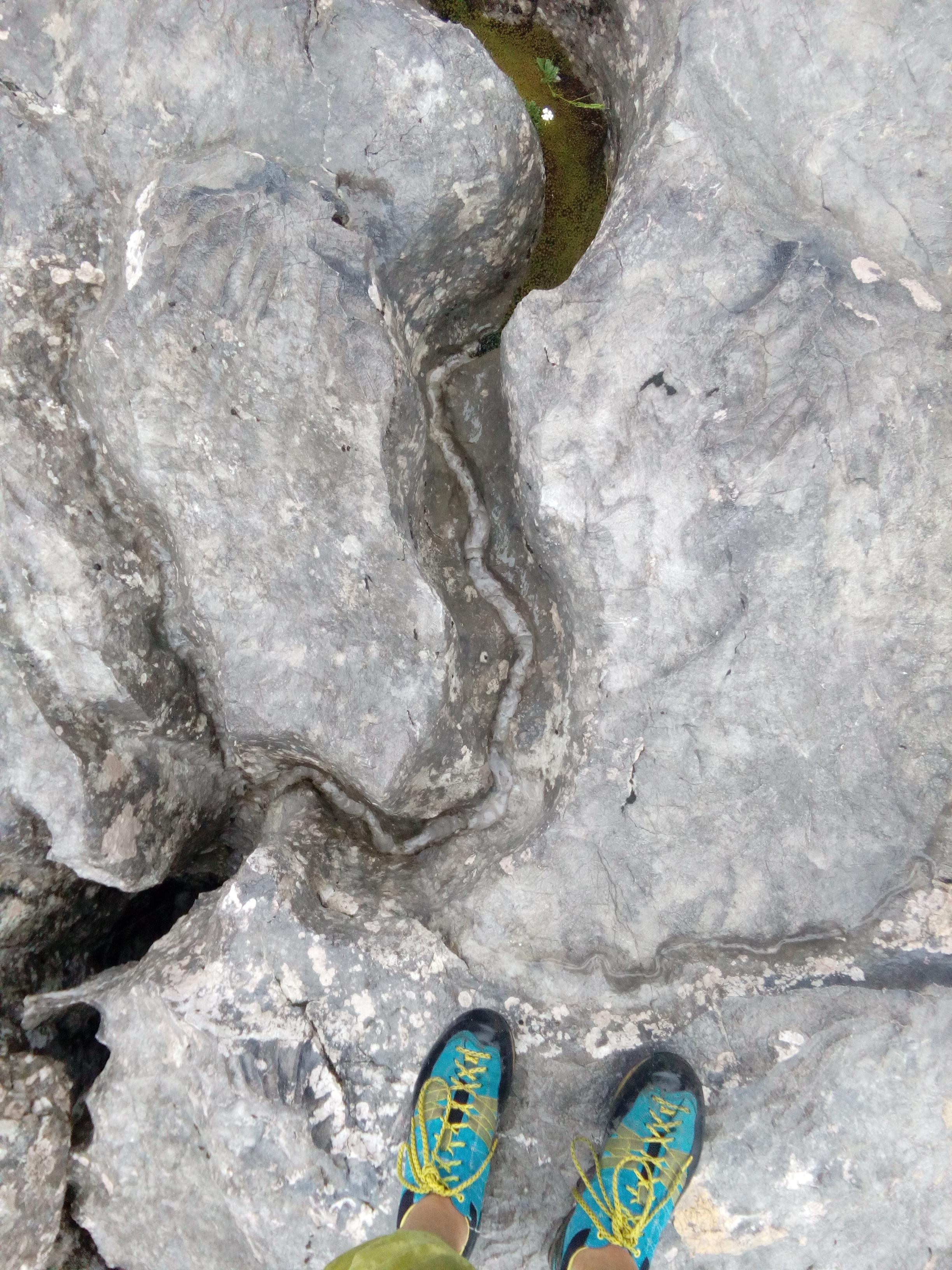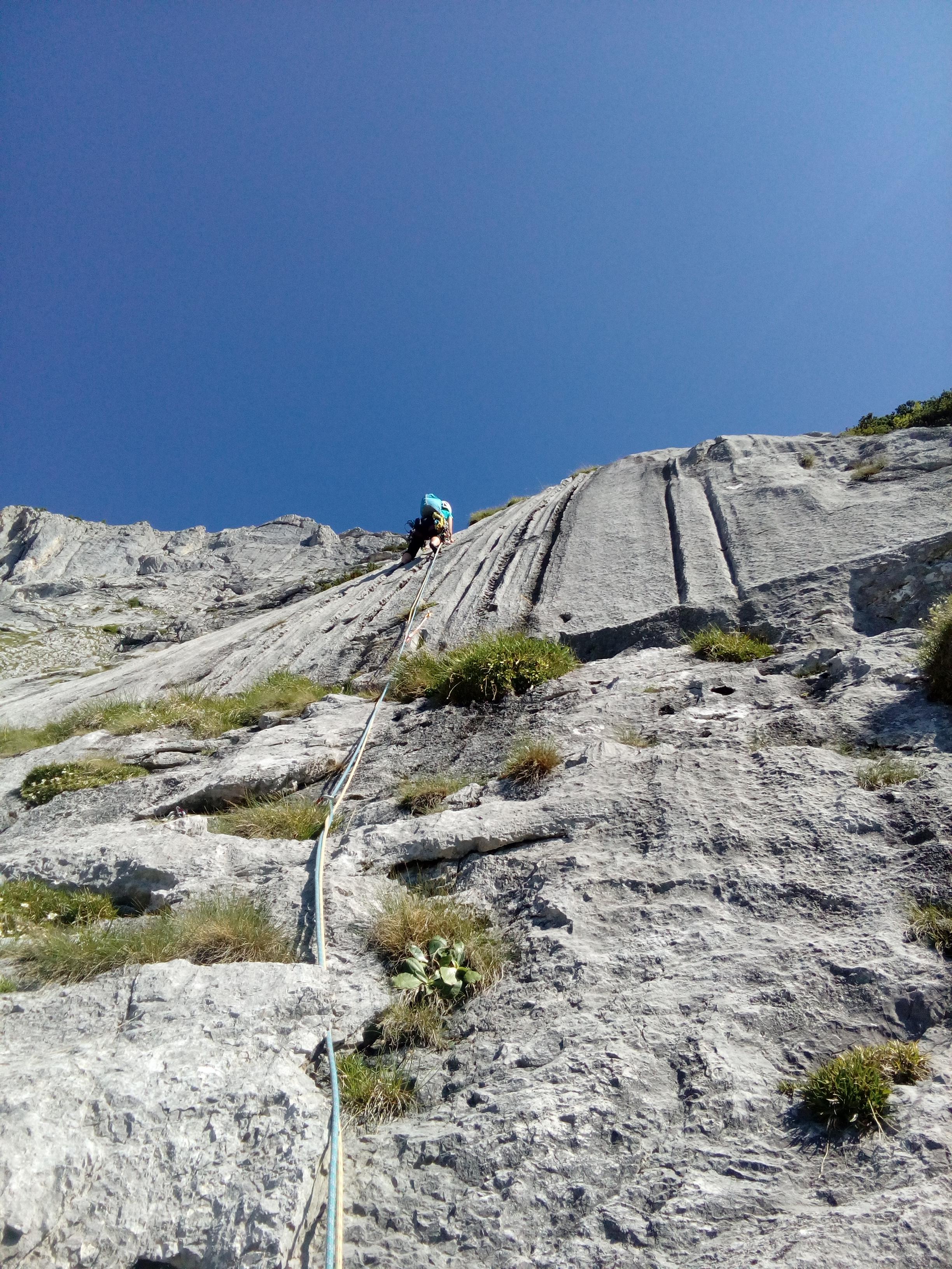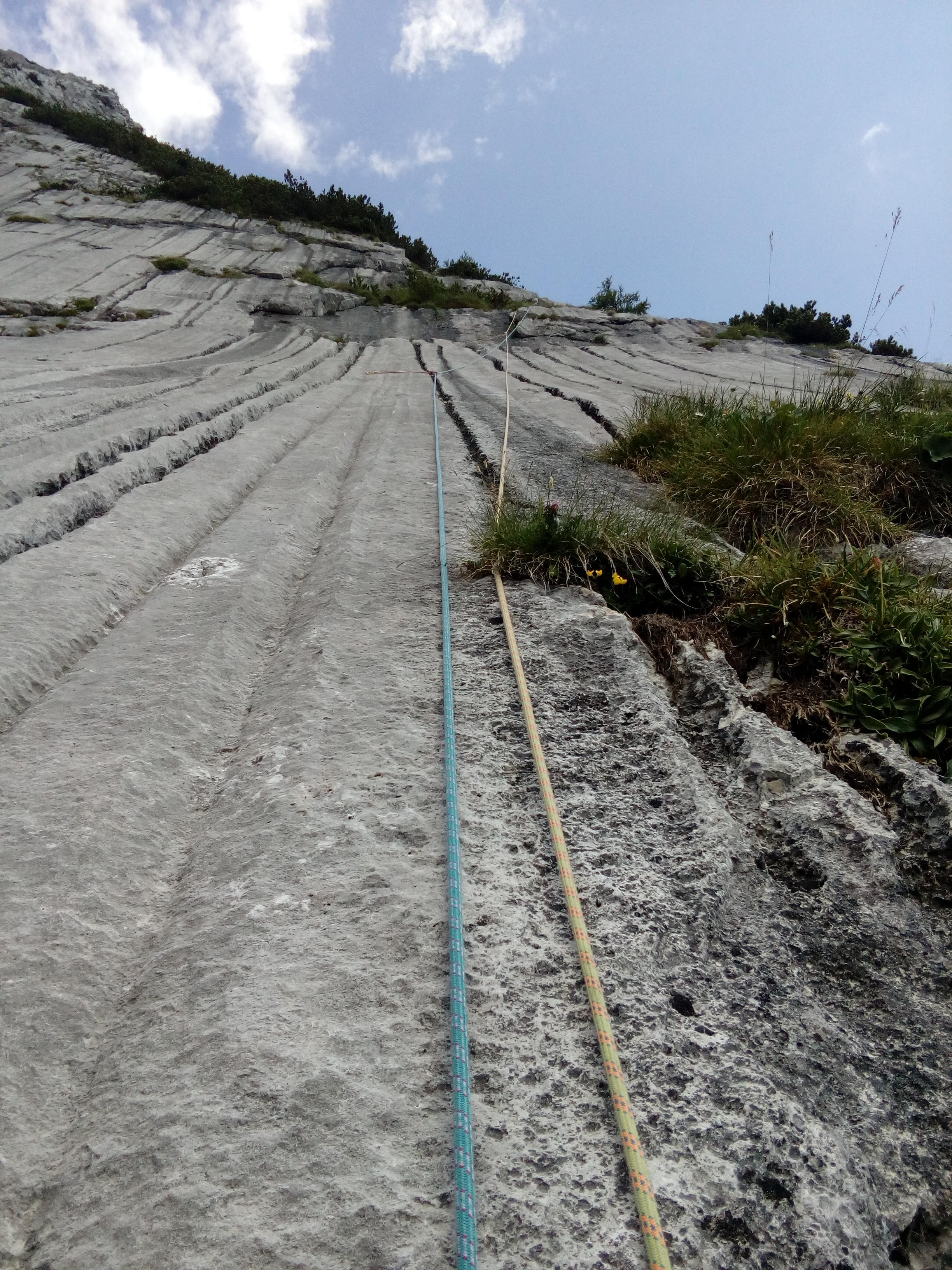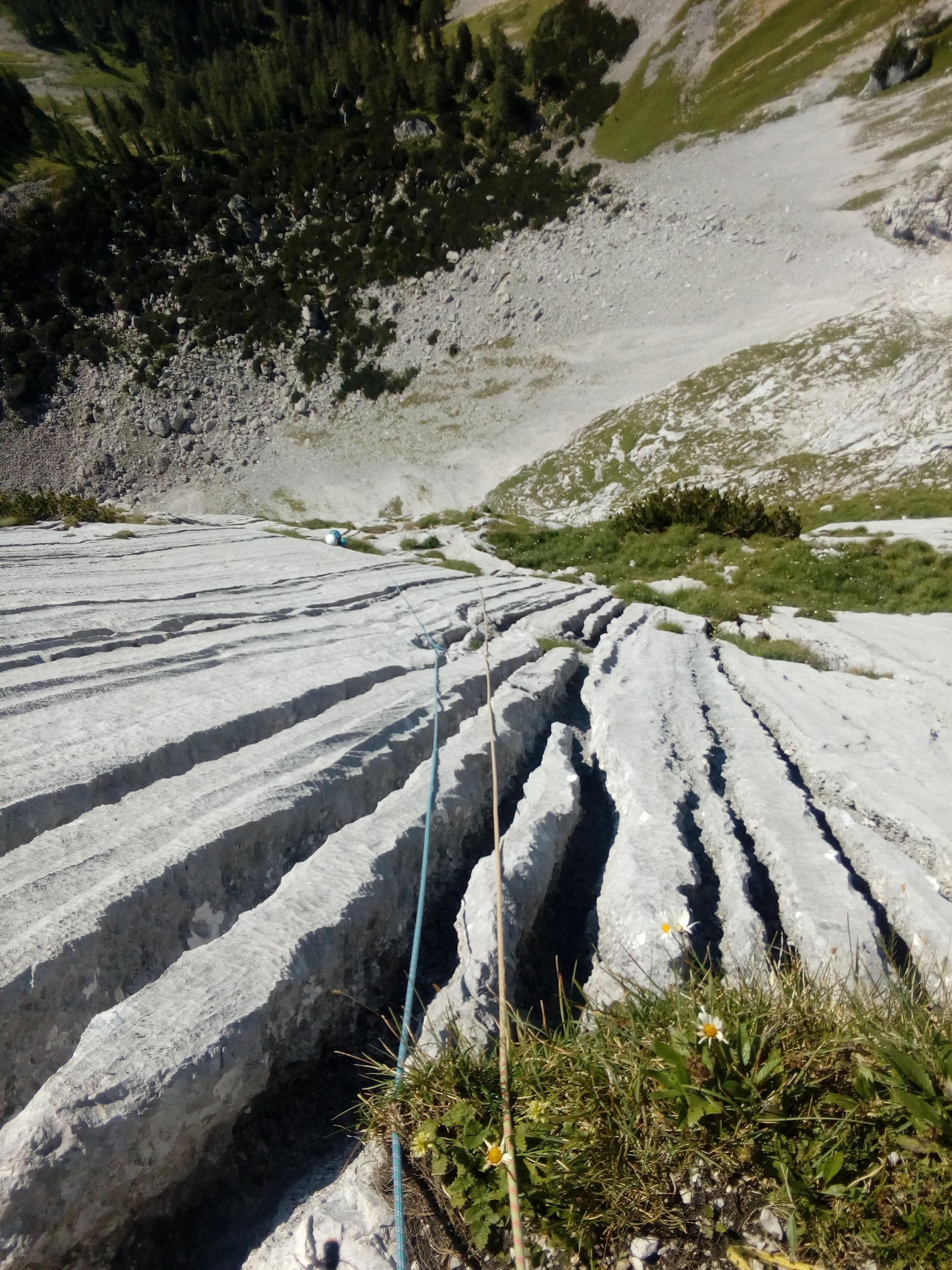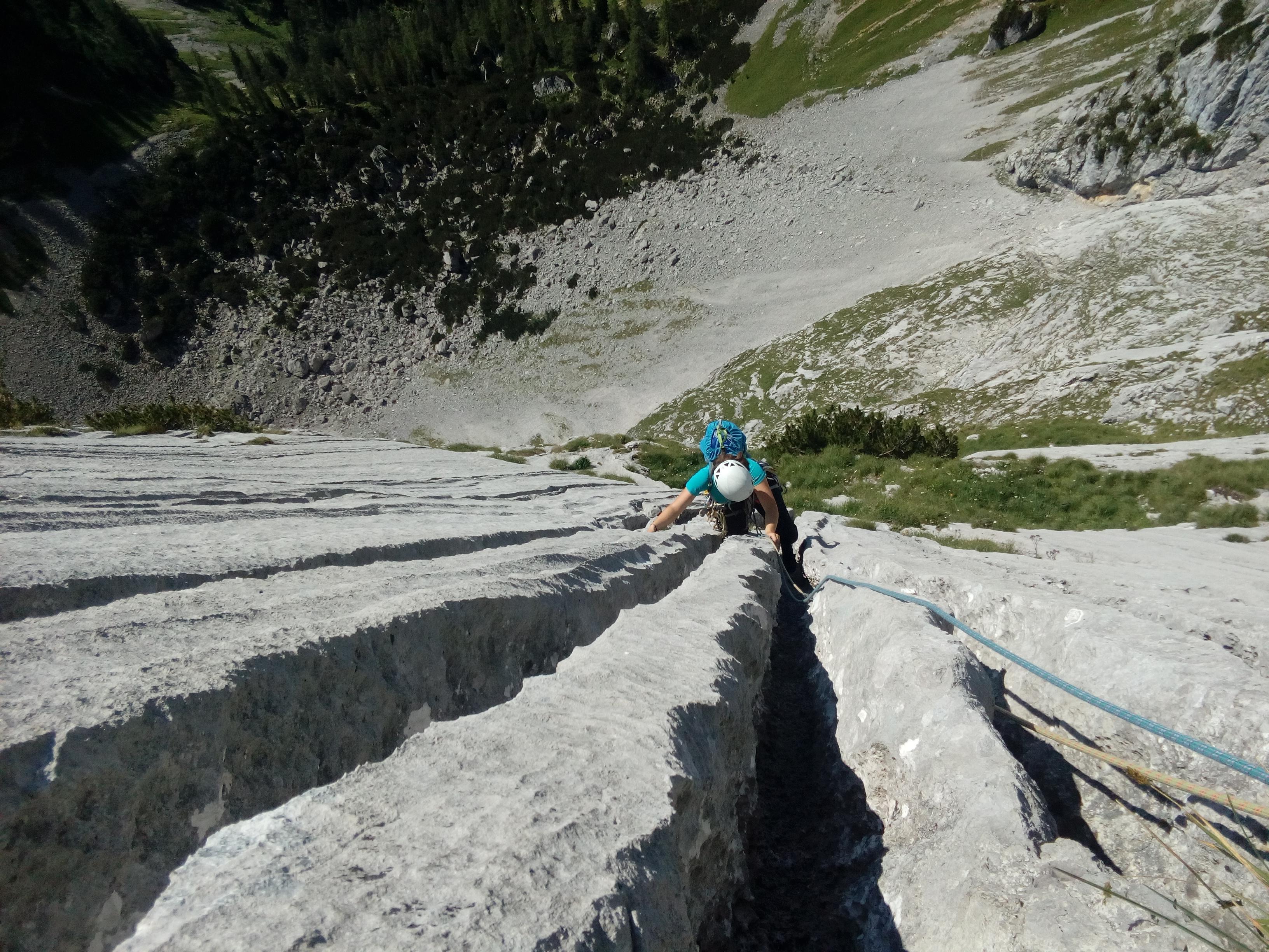 Naslednji dan sem v navezi z Nušo vstopila v smer Steyrerweg (IV+, 300m) v steni Festkogla. Do izhodišča v Johnsbachu (mi smo kraj krstili za Janezov potok) smo se že zgodaj zjutraj zapeljali z avtom (20 minut vožnje iz kempa) in pričeli s triurnim dostopom. Mi smo hodili mimo visokogorskih pašnikov, slapu, mimo gozdnih jagod in plezalcev, ki so prespali v gozdu, mimo nas pa so hitrih korakov hodili vsi ostali plezalci, ki so se podajali v okoliške stene. Dostop je bil ves čas lepo označen, tako da orientacijskih težav nismo imeli, sicer pa po približno 40 minutah hoje zagledaš steno in dileme, kam je treba, ni več. Dobre pol ure pod steno smo si nadeli čelade in začeli z zadnjim delom dostopa – poplezavanjem po strmih travah in šodru, ki pa je vsaj kompaktnejši kot pri nas. Kmalu se je od sten zaslišal odmev pesmi Veseli pastir in kaj kmalu smo ugotovili da nas je dohitela še ena naveza našega klape, ki je iz kempa sicer štartala precej kasneje kot mi. Jah, v formi pač še nismo bili. Tako smo bili na koncu kompletni, vsaka naveza se je podala pod svoj delček stene in si ogledovala nekam vlažne prve raztežaje. Sonce so kmalu zakrili koprenasti oblaki, tako da nam med plezanjem ni bilo vroče. Smer v kateri sem plezala, je ponujala odlično plezanje po kompaktnih luskah in platah. Tu in tam se je našel kakšen klin, celo kakšen sveder, večinoma pa sva uporabljali frende, za katere se nama je zdelo, da držijo precej bolje kot v domačih pokah. Težav z orientacijo nisva imeli, saj je bila linija precej logična, zato nama ni preostalo drugega kot da blazno uživava v konstantnih štiricah. V zadnjih raztežajih so naju oplazile prve dežne kaplje. Pri izstopu smeri sva naleteli na Kajo, Katjo in Žigo in skupaj smo v megli in dežju pričeli s sestopom. Najprej smo se po grebenu med lahkim poplezavanjem povzpeli na vrh gore, nato pa sestopali po nenavadno pustem svetu škrapelj in žlebičev. Sestop je bil sicer sprva lepo označen z velikimi rdečimi markacijami, ki pa so se kmalu izgubile in po občutku ter s pomočjo možicov smo se počasi spuščali. Na trenutke se je zdelo, kot bi hodili po drugem planetu. Vse okoli nas je tihoma klokotalo, saj se je dež pretakal po žlebičkih, ki jih je izklesal v skalo, po kateri smo hodili. Po dobri uri pazljivega spuščanja smo končno naleteli na planinsko pot, ki nas je nato po blatnih kravjih stopinjah pripeljala do avta. Popoldne se je v kempu ponovno pokazalo sonce in vsi zadovoljni smo po trati razvlekli premočeno opremo – jasno je bilo, da bo sledeči dan namenjen predvsem sušenju mokre opreme.