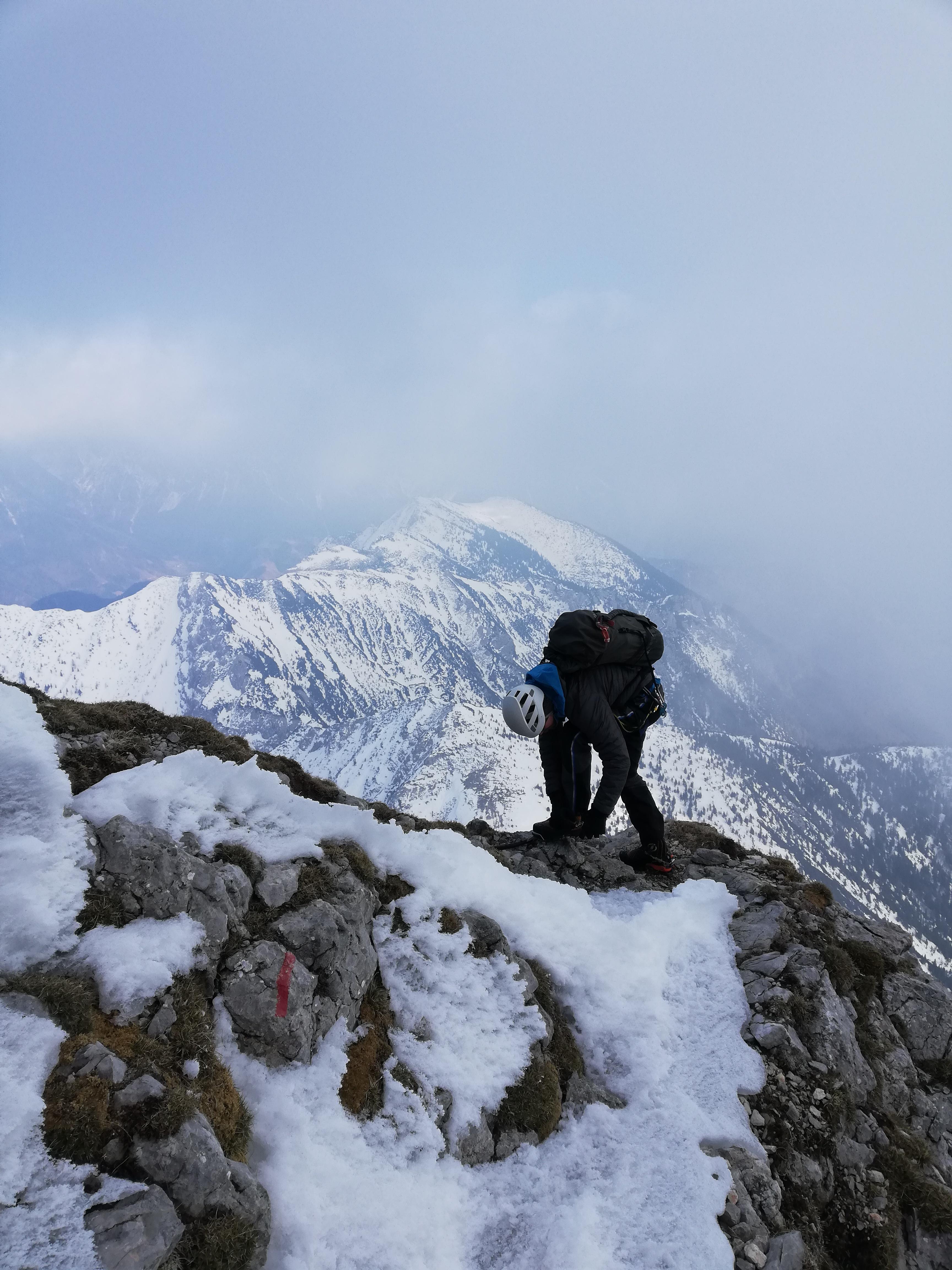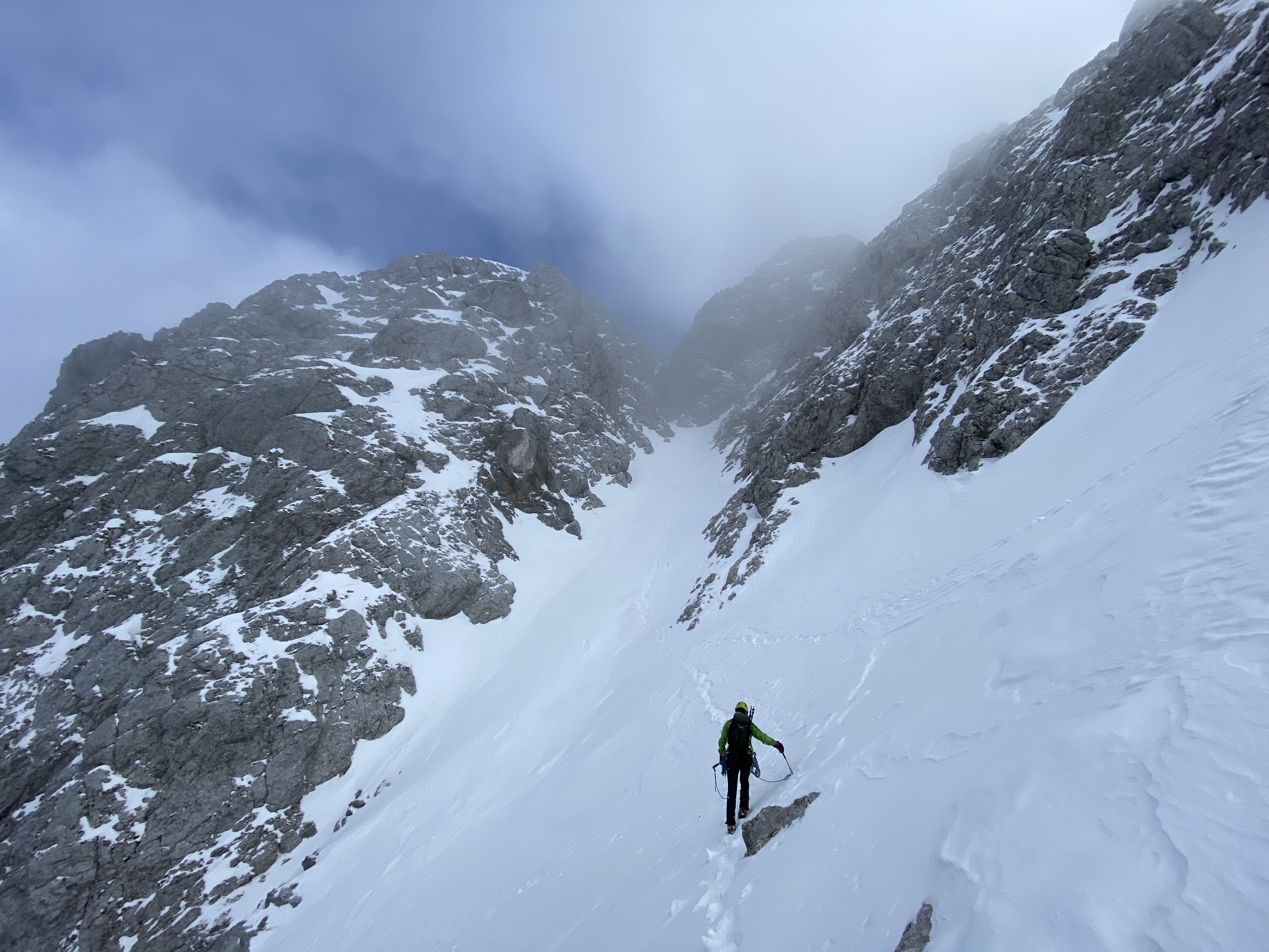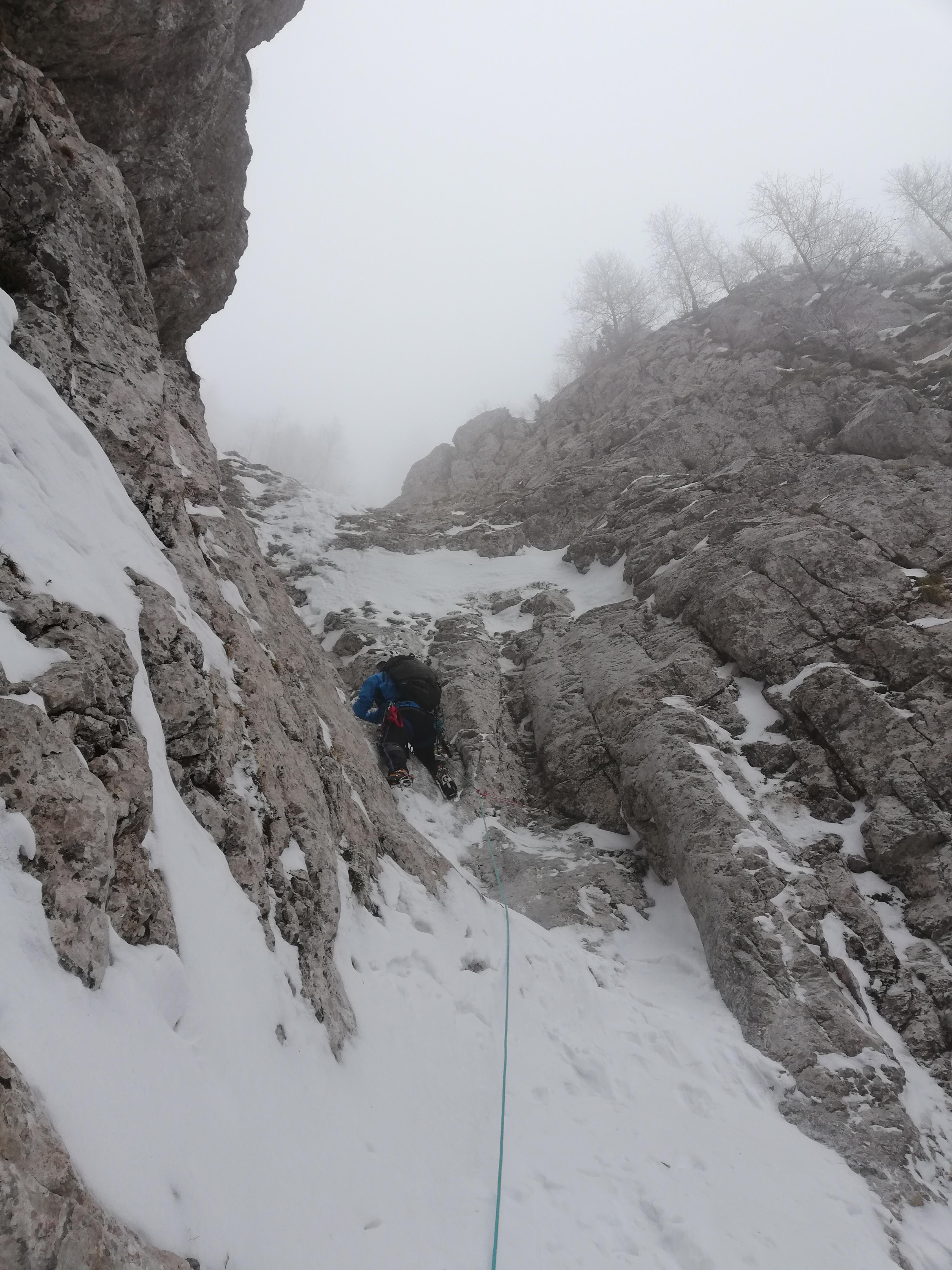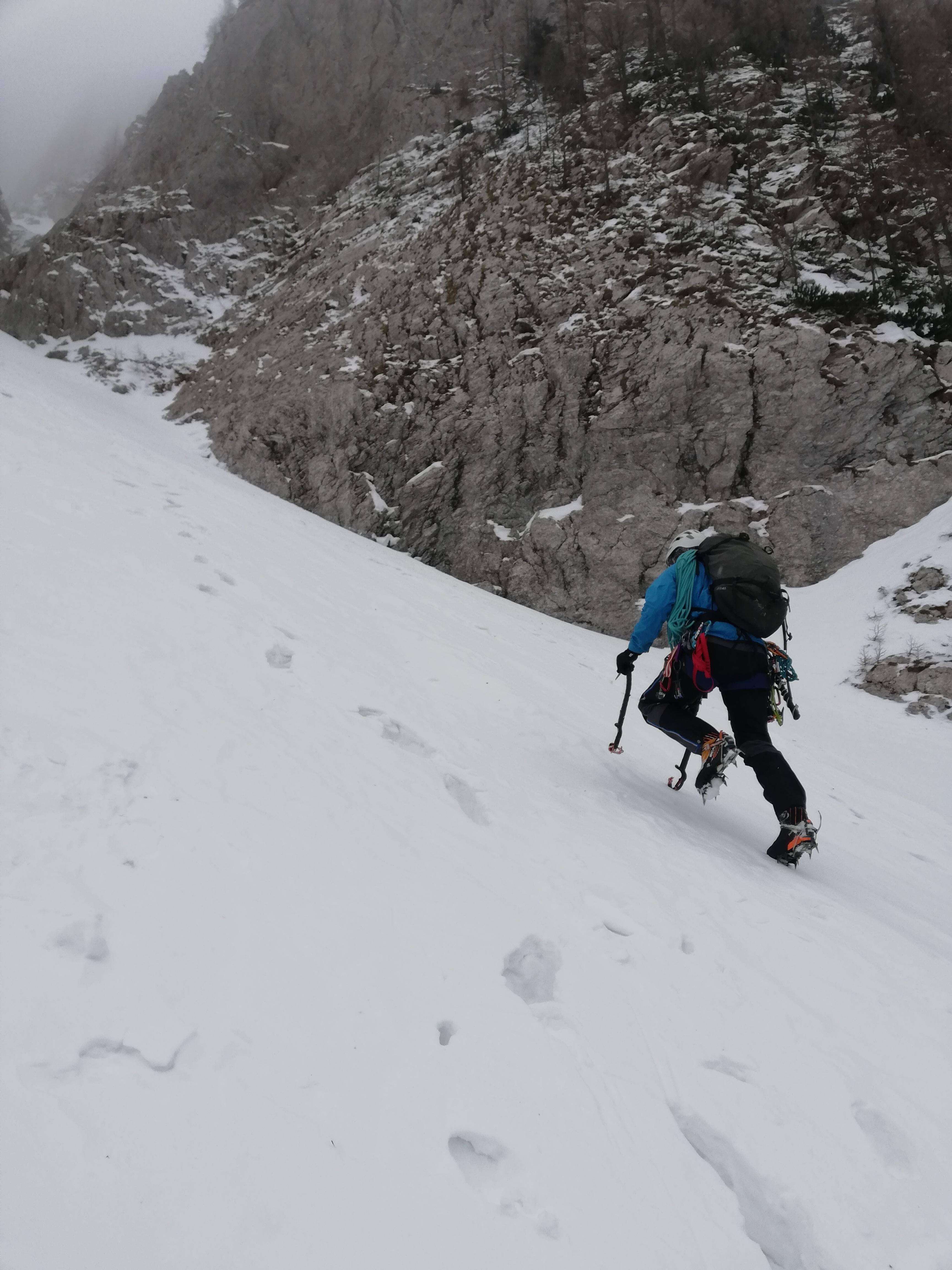 V petek zjutraj sva se z Dinčem, ki mu je uspelo, da me je zvabil iz sončnega Kopra, peljala pod Storžič v turoben spomladanski dan. Po zaledeneli cesti sva vztrajala proti Domu pod Storžičem, kolikor je šlo, nato pa sva jeklenega konjička osamljenega pustila ob cesti in se peš odpravila dalje. Prvi detajli so naju čakali že po cesti aka drsalnici do doma, ko sva prvič resno razmišljala o namestitvi derez. Snega je bilo bolj malo, po drevju so peli ptički in težko je bilo verjeti, da sva namenjena v Kramarjevo smer/grapo (600m, IV/I-II), v kateri sva, normalno, pričakovala zimske razmere. Vrh Storžiča in severna stena so bili oviti v meglo, nad katero je bilo slutiti sonce. Do vstopa v grapo je čas minil hitro. Nase sva navlekla vso opremo in medtem že pogledovala k prvemu skalnemu skoku. Dino se je odločil, da bo napadel desnega, a si je premislil in sva se nato prestavila pod levega. Dereze in cepini so škripali na kamenju in vame so leteli predvsem koščki zamrznjene trave in zemlje. Kljub temu je Dino mojstrsko opravil – več težav sem imela jaz, ki sem pravzaprav kaj takega v hribih počela prvič. Nekaj časa sem še vztrajala s cepini, nato pa sem snela rokavice in s skokom opravila na način, ki mi gre od nekdaj najbolje – z golimi rokami, ki se držijo skale. Na štantu sva se strinjala, da sva se kar dobro ogrela. Do naslednjega skoka sva se sprehodila po nakazanih stopinjah, ki pa jih je že skoraj popolnoma prekril sneg. Do vrha grape sva naletela na različne kakovosti snega – ponekod je bil trd, mehek, kložast, napihan, za vriskat,…malo mešano. Krajši postanek sva naredila pri fascinantnemu bivaku, ki naju je presenetil sredi stene. Ko se nama je mraz ponovno zagrizel v kosti, sva nadaljevala. Čakal naju je najtežji skalni skok. Poleg dveh klinov, ki sta že bila v steni, sva notri pustila še enega novega. Jaz sem sopihala in preklinjala, ko sem grabila po zamrznjeni travi in se pošteno spotila. Vsak v svojem ritmu sva sopihala dalje in naletela še na en skalni skok. Tega sva se že od začetka lotila z golimi rokami. Do vrha naju je nato čakal še en, solidno zalit skokec, v katerem sem končno občutila tiste besede, ki jih tolikokrat slišim: »K je tok dobr, da sam popikaš čez.« Kmalu po njem sva se pridružila veliki izhodni grapi, ki je skoraj do vrha popolnoma zalita, le tik pod izstopom sva spet malo kopala po pesku in skalovju. Na vrhu naju je končno pričakalo sonce, čeprav se je nato še večkrat sramežljivo potegnilo za oblak megle, ki se je podila čez vrh. Privoščila sva si malico in se nasmejana odpravila navzdol po vzhodnem grebenu. Nemalo zamišljena sva brezciljno sestopala in nato ugotovila, da nekaj ne štima. Smer ni bila prava…Tako sva šla nazaj na vrh in tam odkrila celo avtocesto stopinj, ki je vodila dol pod steno skozi Peto žrelo. Grapa je dobro zalita in brez težav sva bila v dobri uri nazaj pri Domu pod Storžičem. Dereze sva pustila na nogah vse do avta. V celem dnevu sva videla le dve živi človeški duši, ki sta pod steno za hip obrnili oči proti nama v smer, nato pa izginili v meglo neznano kam. Sklep ture je bil, da je zima zakon, ampak da se v teh koncih žal že poslavlja.