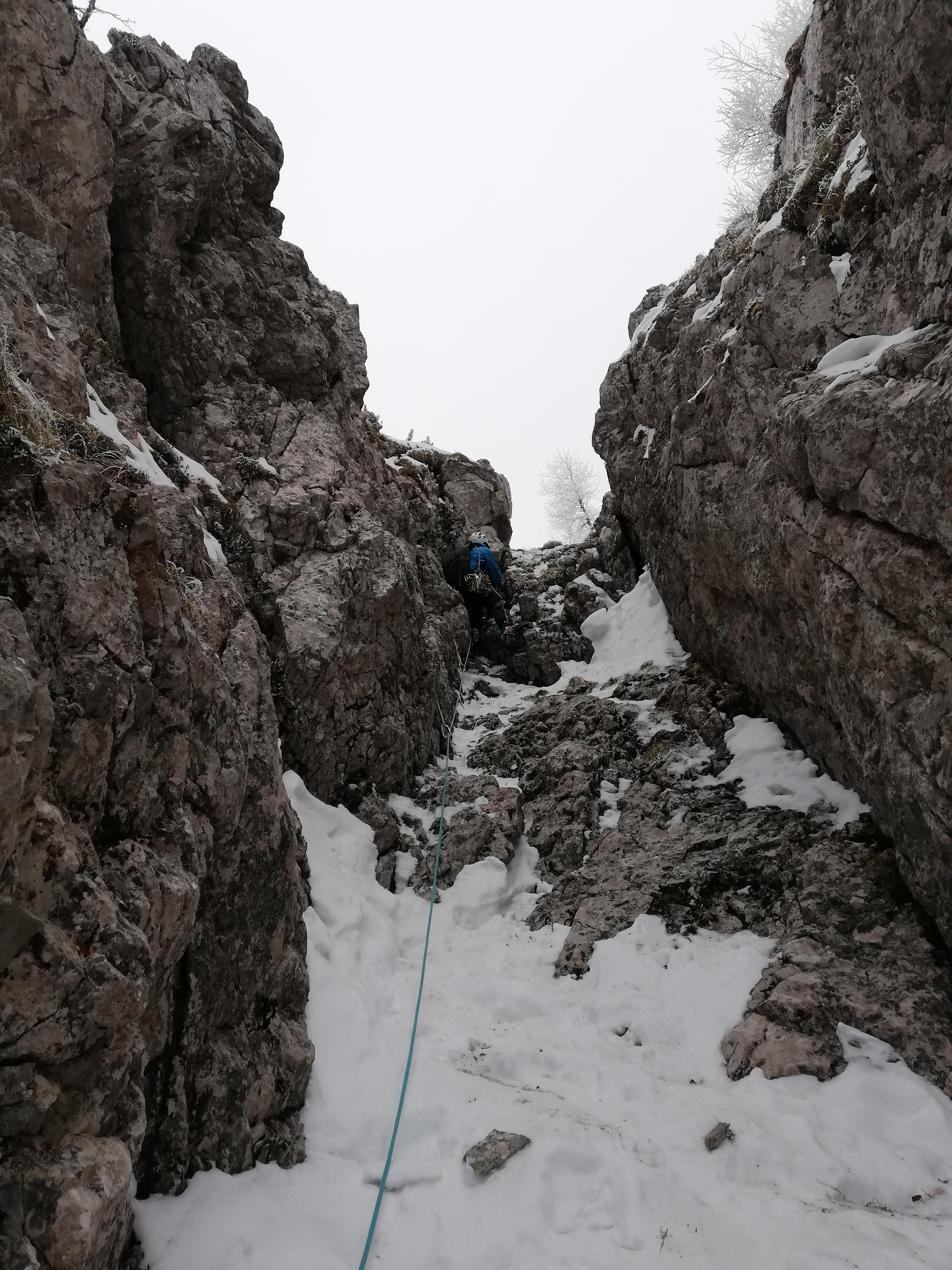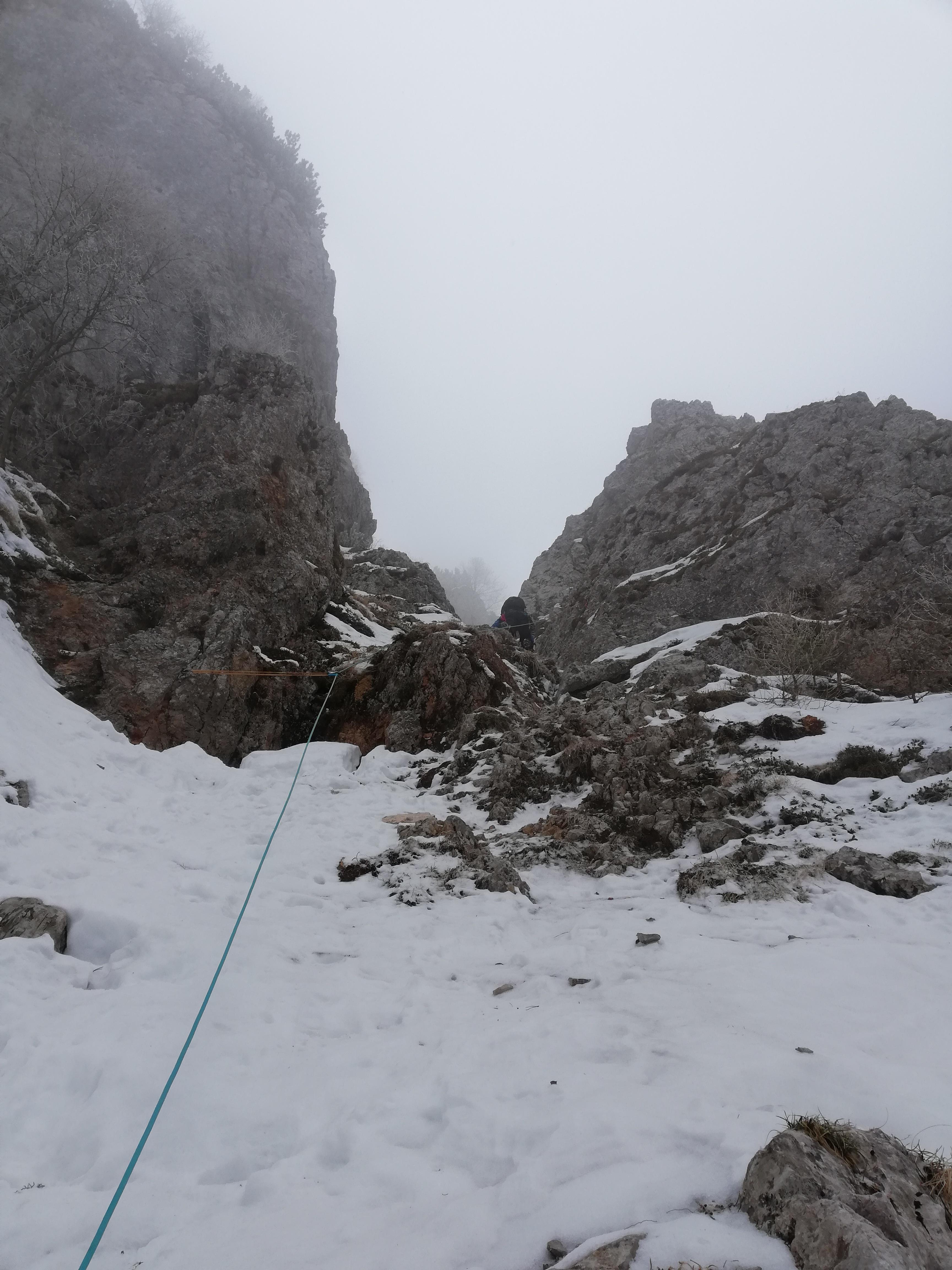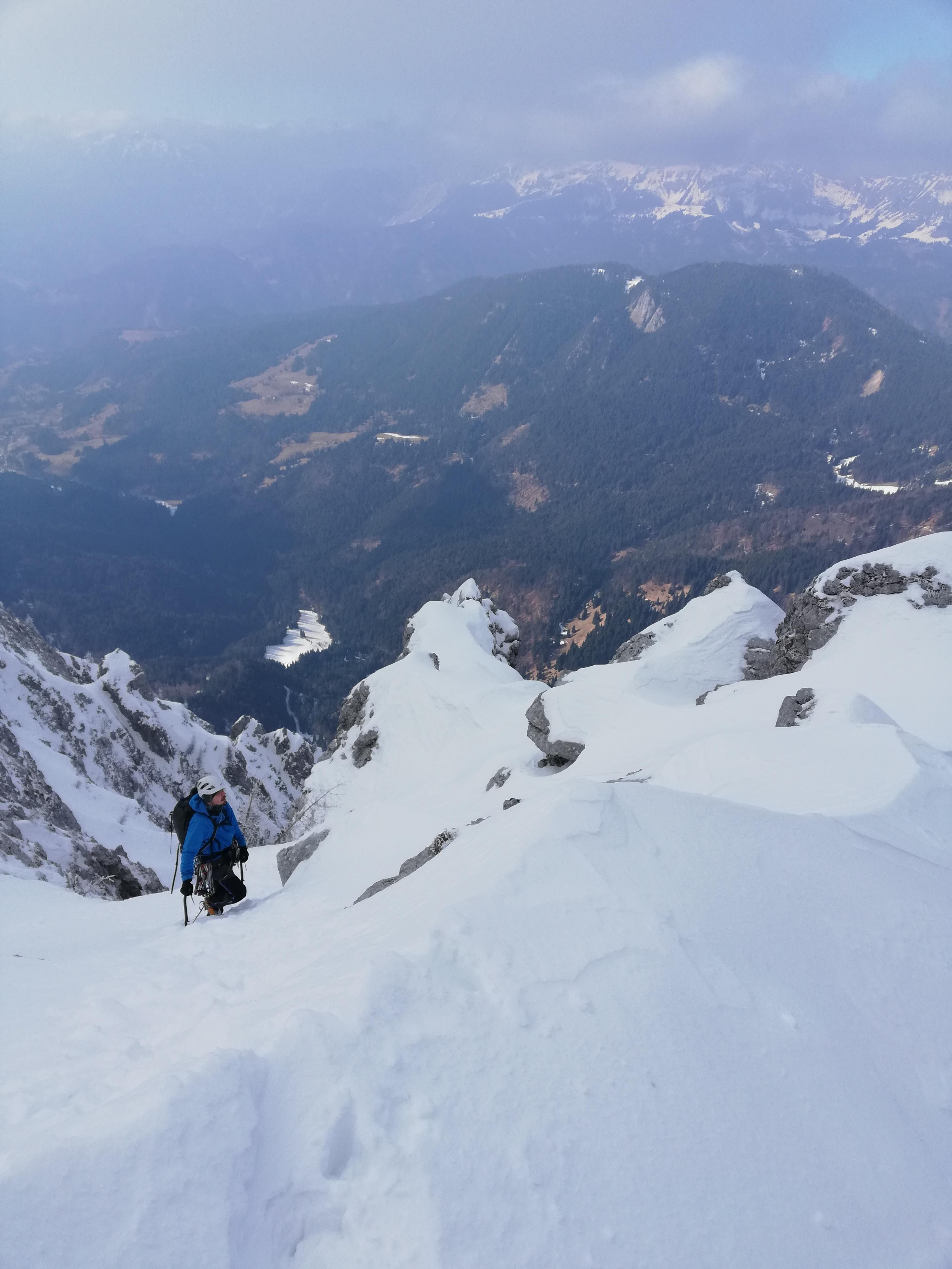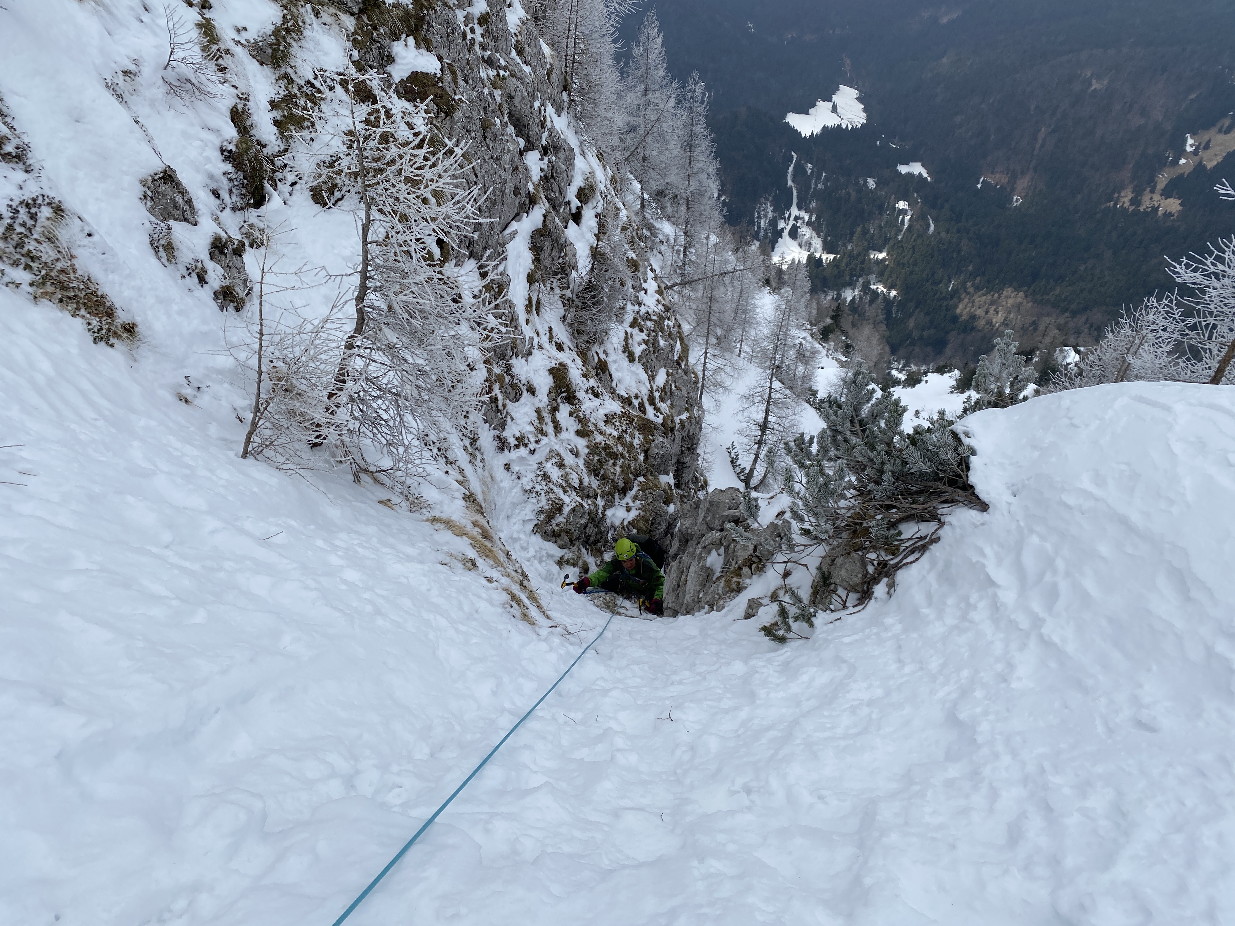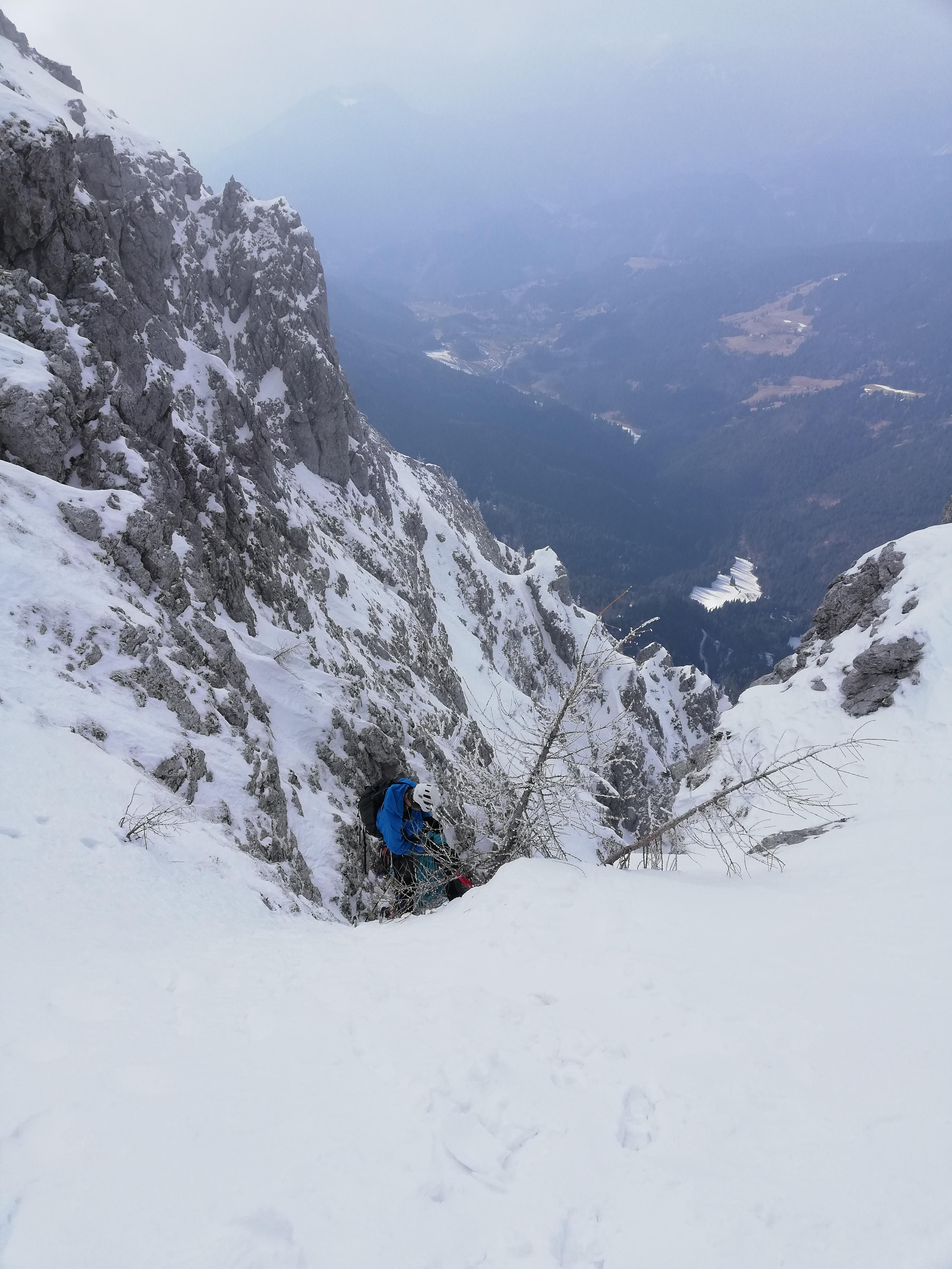 Kratek opis: Z Dinotom sva se v petek vzpela na Storžič preko Kramarjeve grape. V celotni smeri so trije skalni skoki, ki so skoraj popolnoma kopni. So pa zato dobro opremljeni s klini. Sicer je grapa lepo zalita s snegom, ki pa je vseh sort. Gaženje ni preveč naporno, še posebej če hodiš kot drugi ;) V smeri sva pustila 3 kline. Sestopila sva skozi Peto žrelo, kjer je snega še več kot dovolj. Celoten vzpon nama je vzel cca 7 ur, sestop pa slabi dve.
