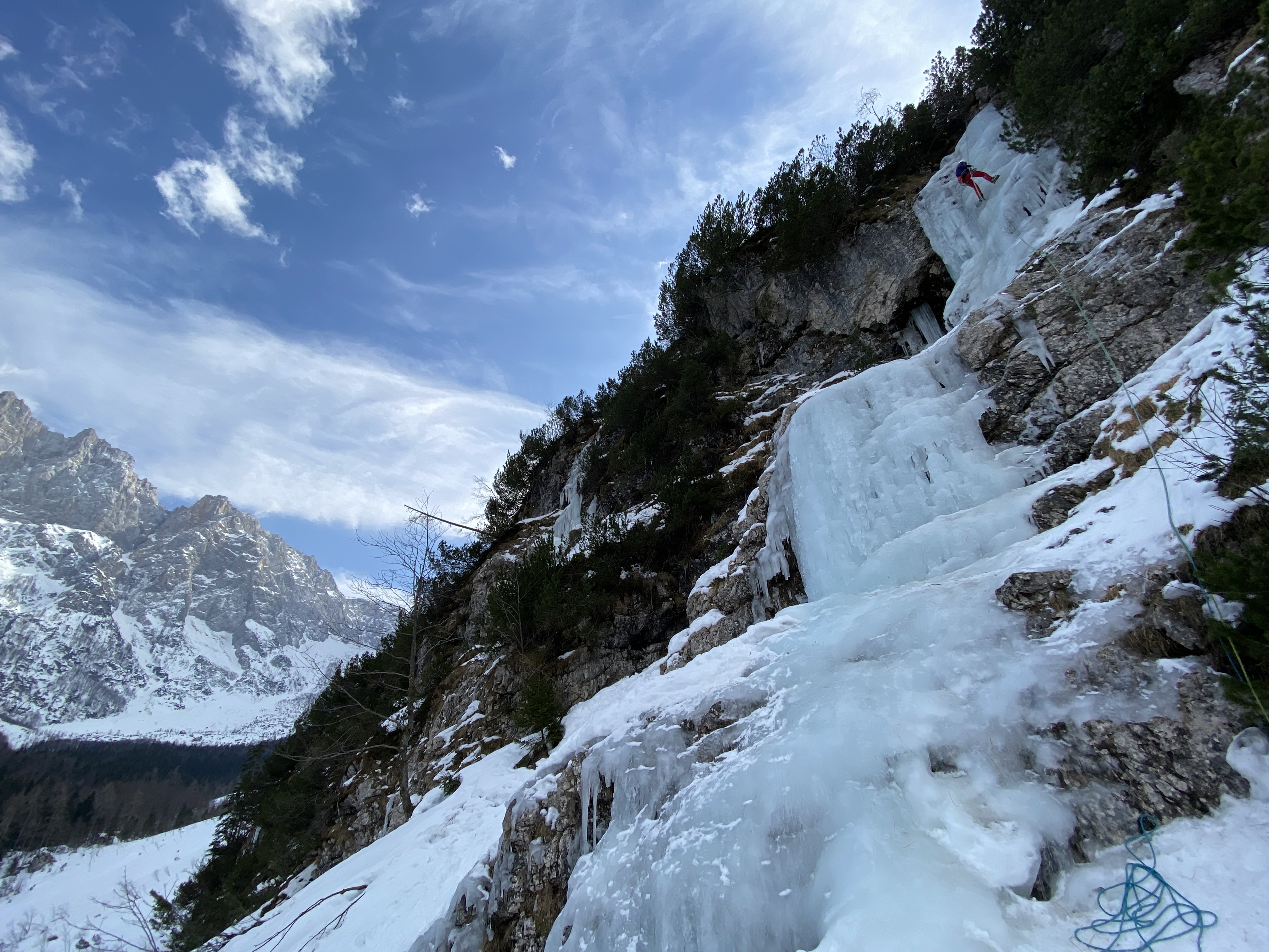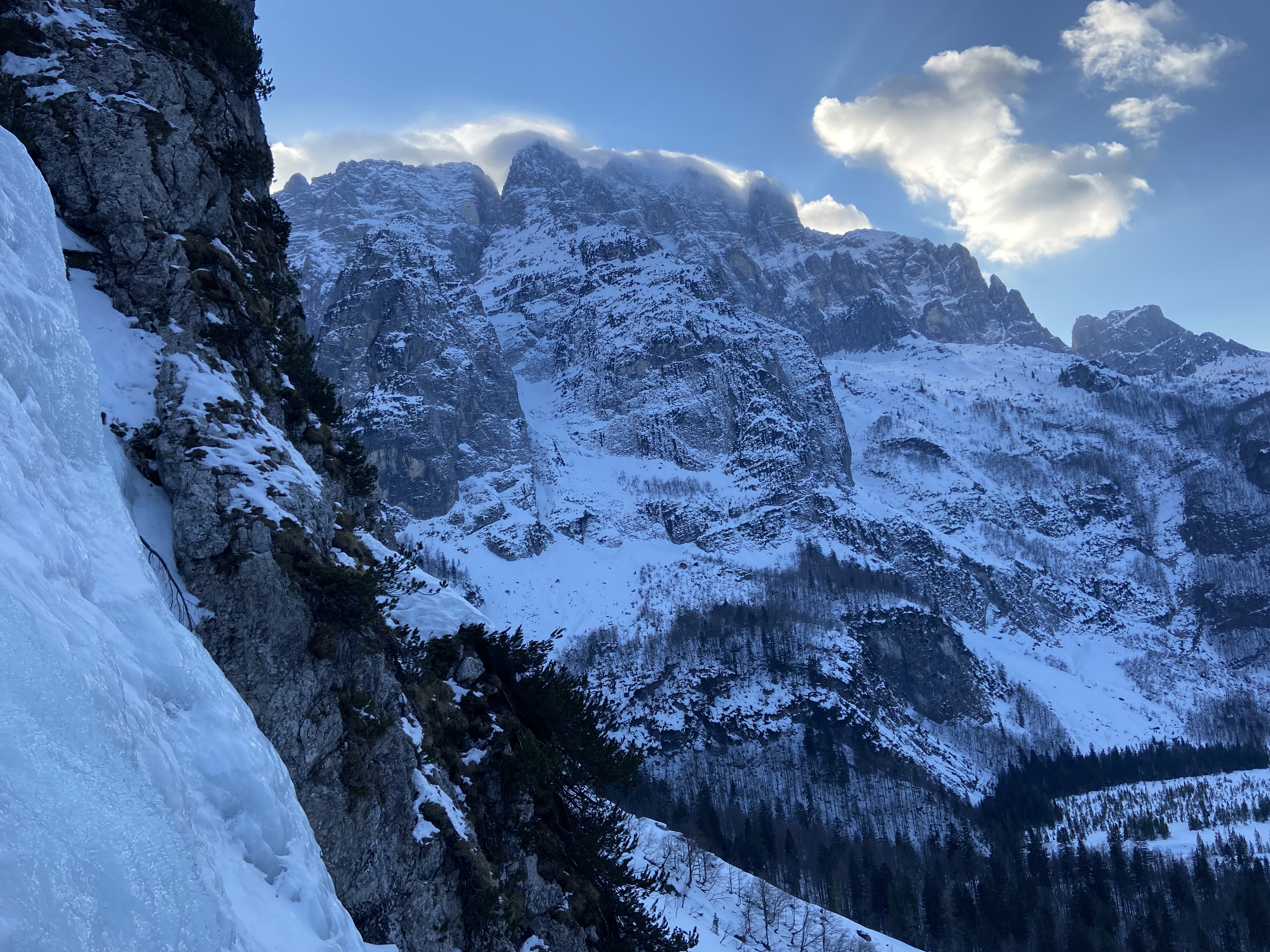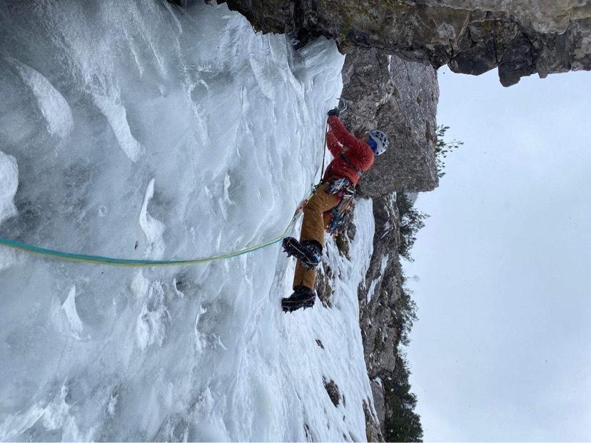 Že takoj naslednji dan po zaključku moje nočne izmene se z Nino odpeljeva čez mejo, v lepo dolino Zajezere. Dostopa do slapov je za cca 40. min. Odločiva se za slap Le placche parallele in sicer njegovo desno varianto. V slapu naju je pričakal trd led in posledično 'talarji'. Prvi raztežaj sem razdelil na dva dela saj sem vrtal bolj na gosto. Sledil je cug grapice in nato še dva polna raztežaja lepe plezarije po ledu. Za sestop so pripravljeni štanti za abzajl. Dva spusta pred koncem mi je ob druženju z navezo iz Ao Rašica, ki nama je prijazno odstopila nekaj prostora na štantu iz rok padel reverso. Hvala Nini za njenega rezervnega(pripravljena punca ni kaj haha). Po skoraj 40 urah brez spanca je bilo lepo nazaj na trdnih tleh in opazovati sonči zahod nad mogočnim ostenjem Montaža. Pod slapom pa sem doživel tudi prijetno presenečenje saj sem našel tako reverso kot tudi šrauf, ki mi je padel v predzadnjem raztežaju :D