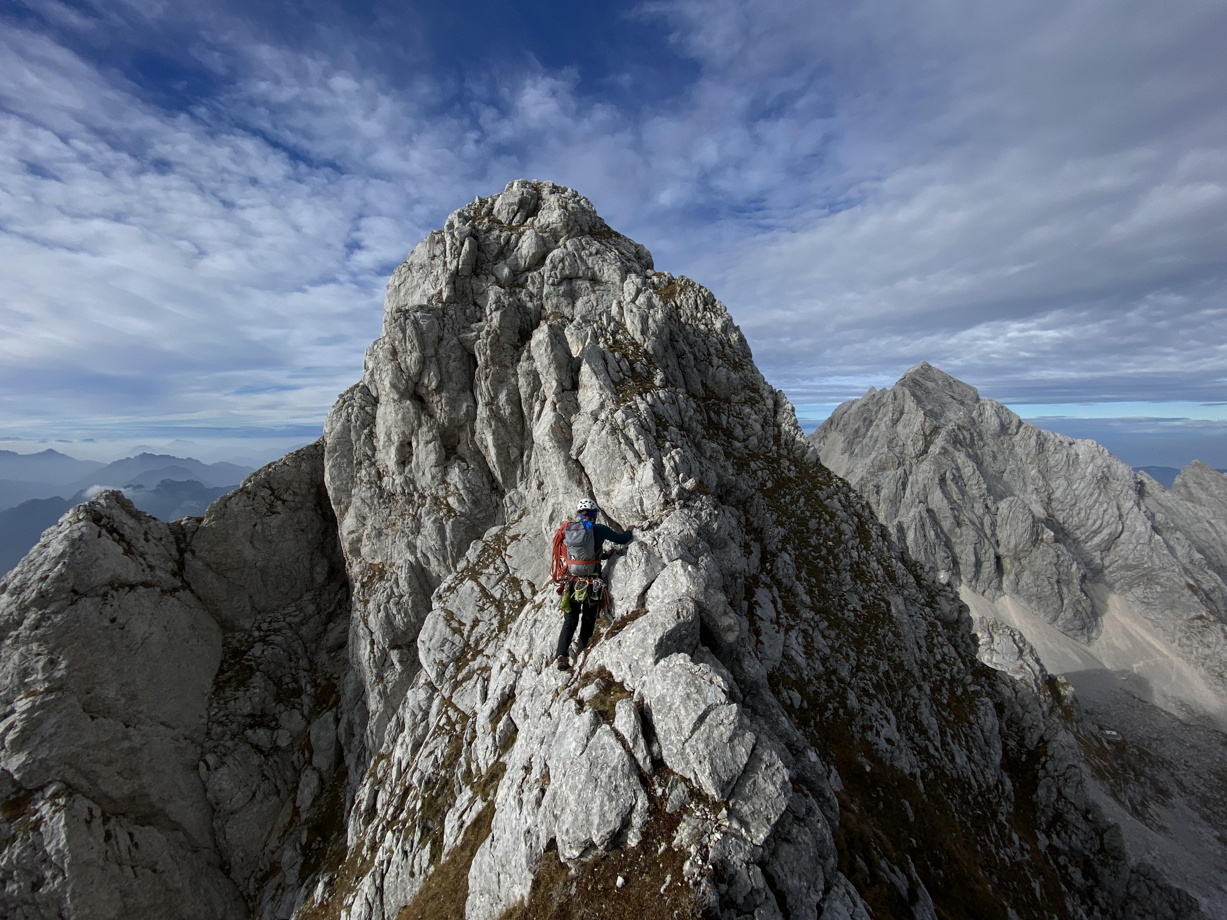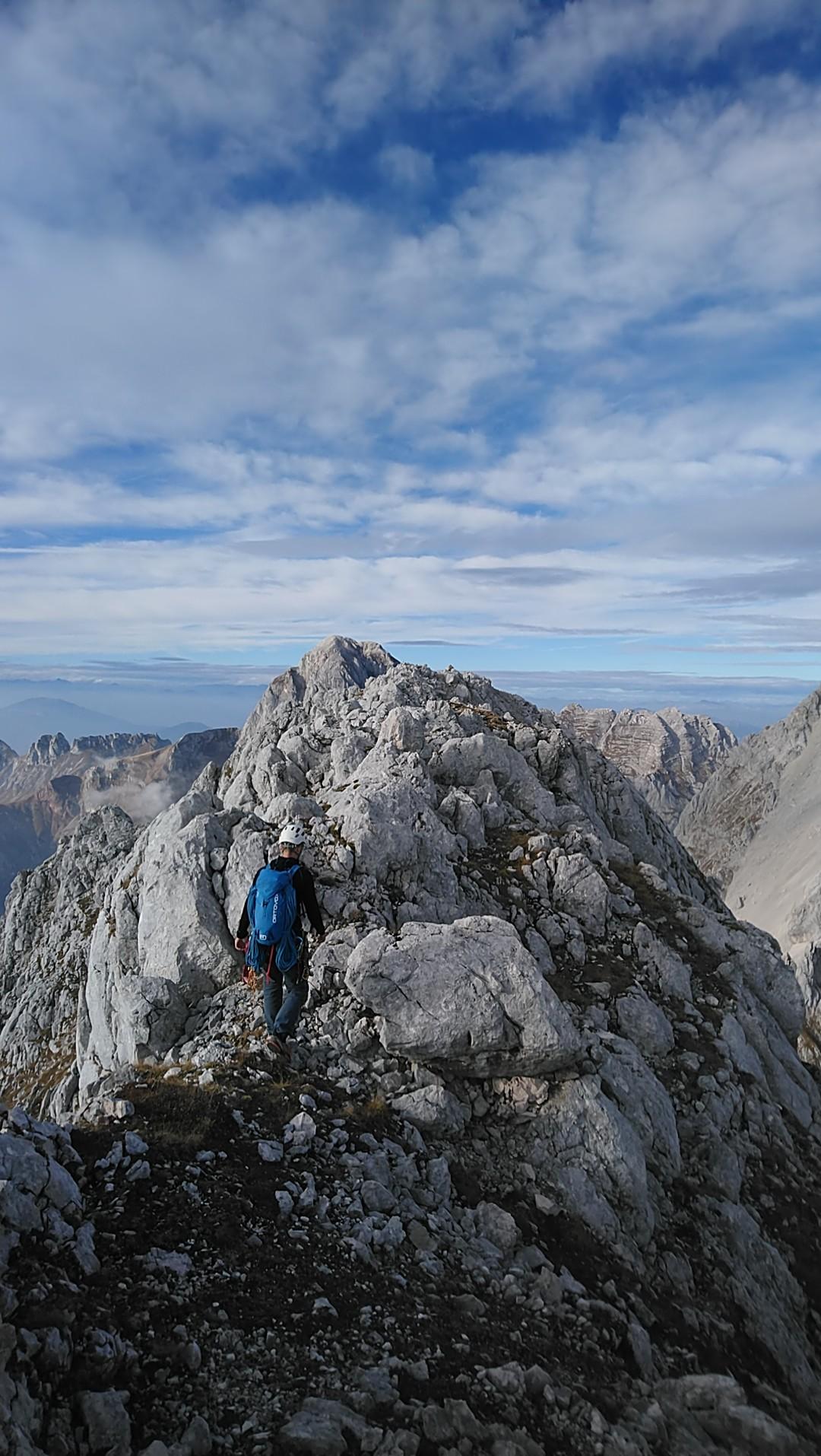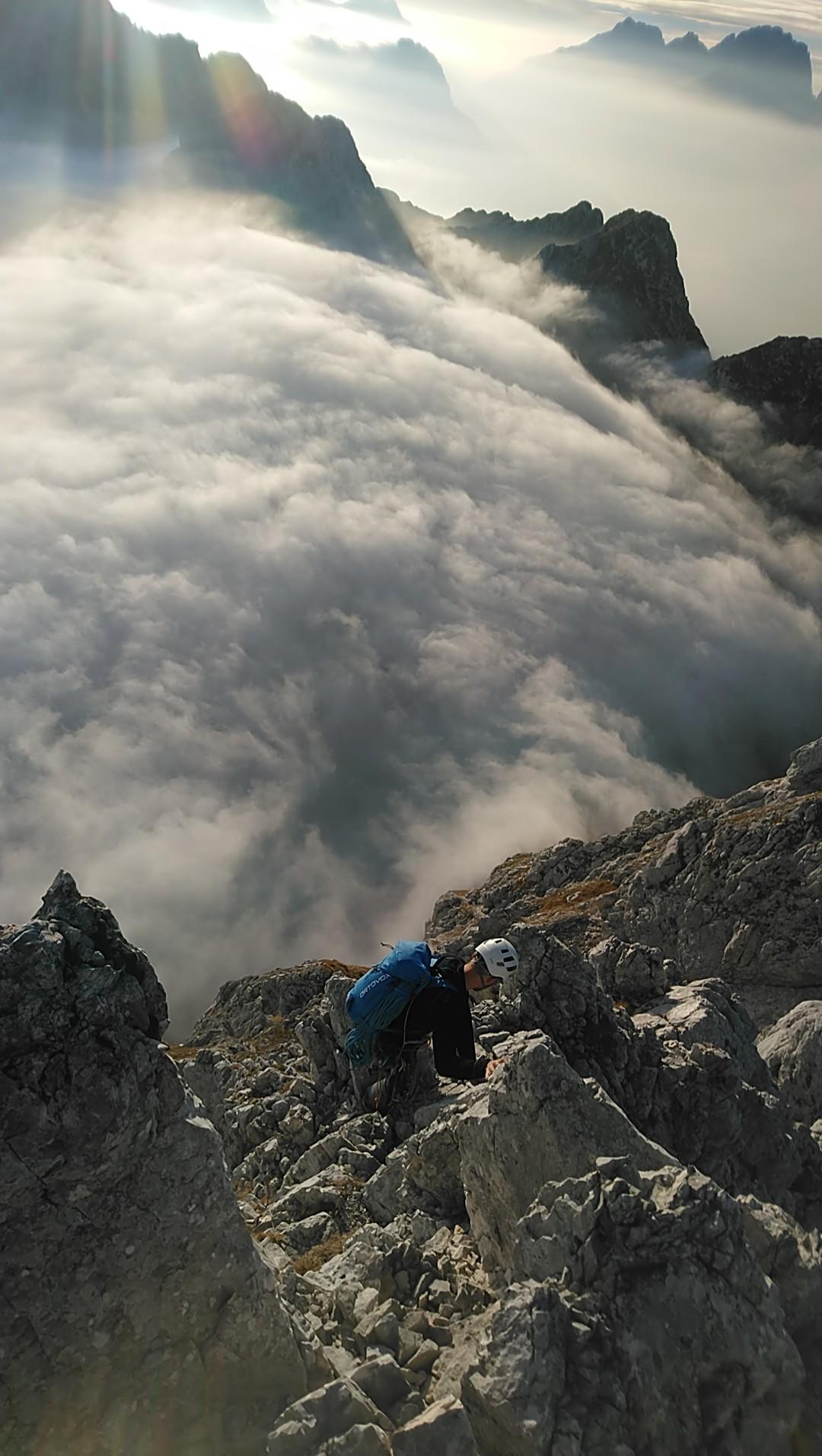 Najna smer začne na vrhu trikotnega melišča in išče naravne prehode skozi sprane plošče, kamine in na zgornji polovici še skozi zajedo, ki traja do vrha. Zaradi naravnih prehodov orientacija ni zahtevna, le v prvem raztežaju te skica vodi levo gor, moraš pa iti proti desni čez previs, kjer je edino logično nadaljevanje. V smeri je skala dobra, premično varovanje se da lepo nameščati, klini pa tudi vedno najdejo poko. V smeri sva pustila 4, od tega 3 na sidriščih. Za ta dan je bilo vreme napovedano oblačno. Nekoga bi to odvrnilo, nama pa je nizka oblačnost ponudila pravljične razglede na morje oblakov, iz katerega se dvigajo samotni otoki okoliških vršacev. Sestop je sledil po grebenu iz Srednjega Pelca na vrh. Prečenje Pelcev je še kar veliko plezano. Zdaj sem videl zakaj. Ta del grebena ponuja zračno plezanje po ostrem grebenu v odlični skali. Predvidevam, da je tudi tisti del, ki ga nisva plezala odličen. Iz vrha sva sestopila po Z grebenu (II-III) dol. Za ta del velja isto kot za prej omenjenega. Celo nekaj sidrišč je že not in pripravljenih za spust na težavnejših mestih.