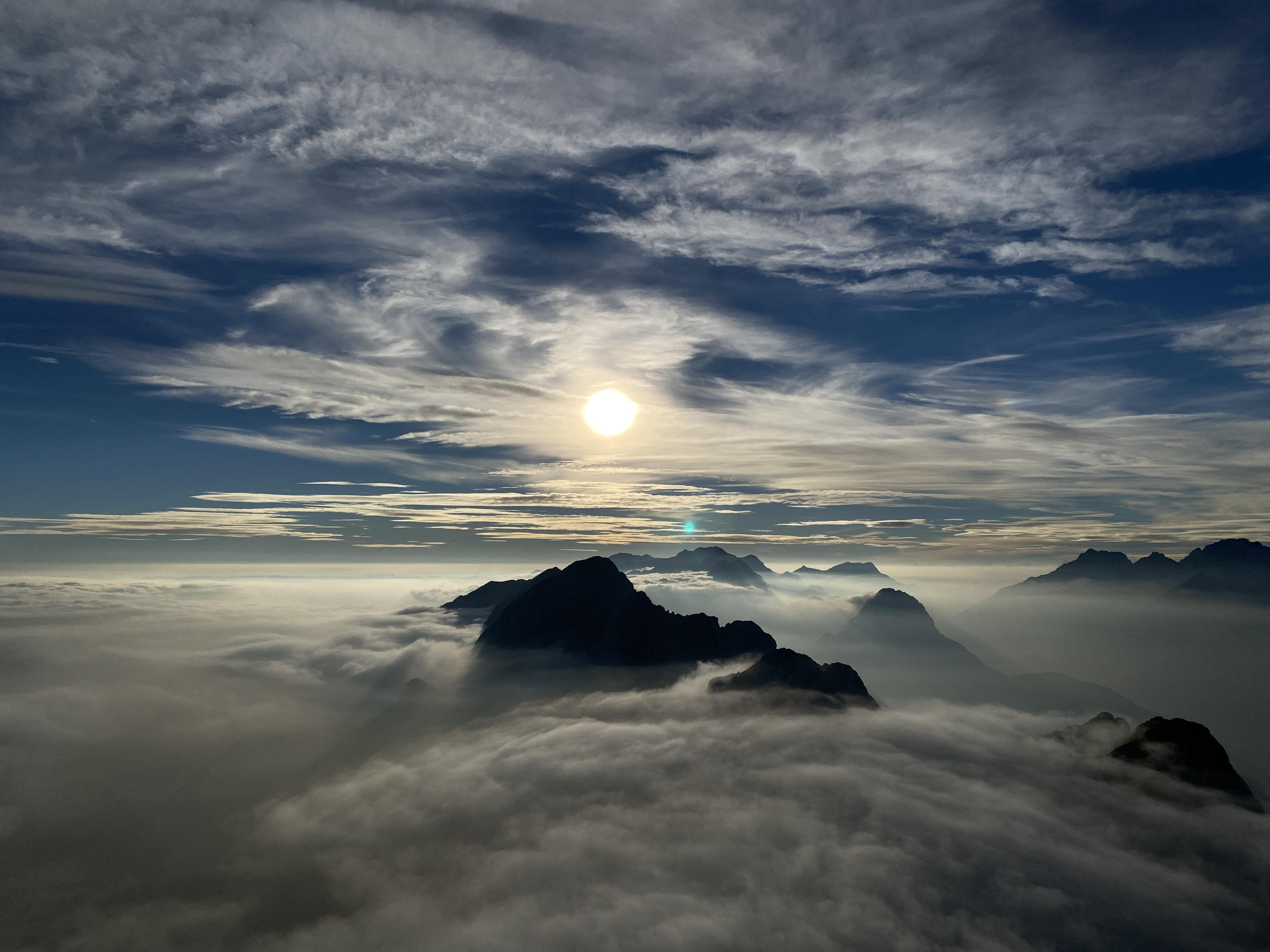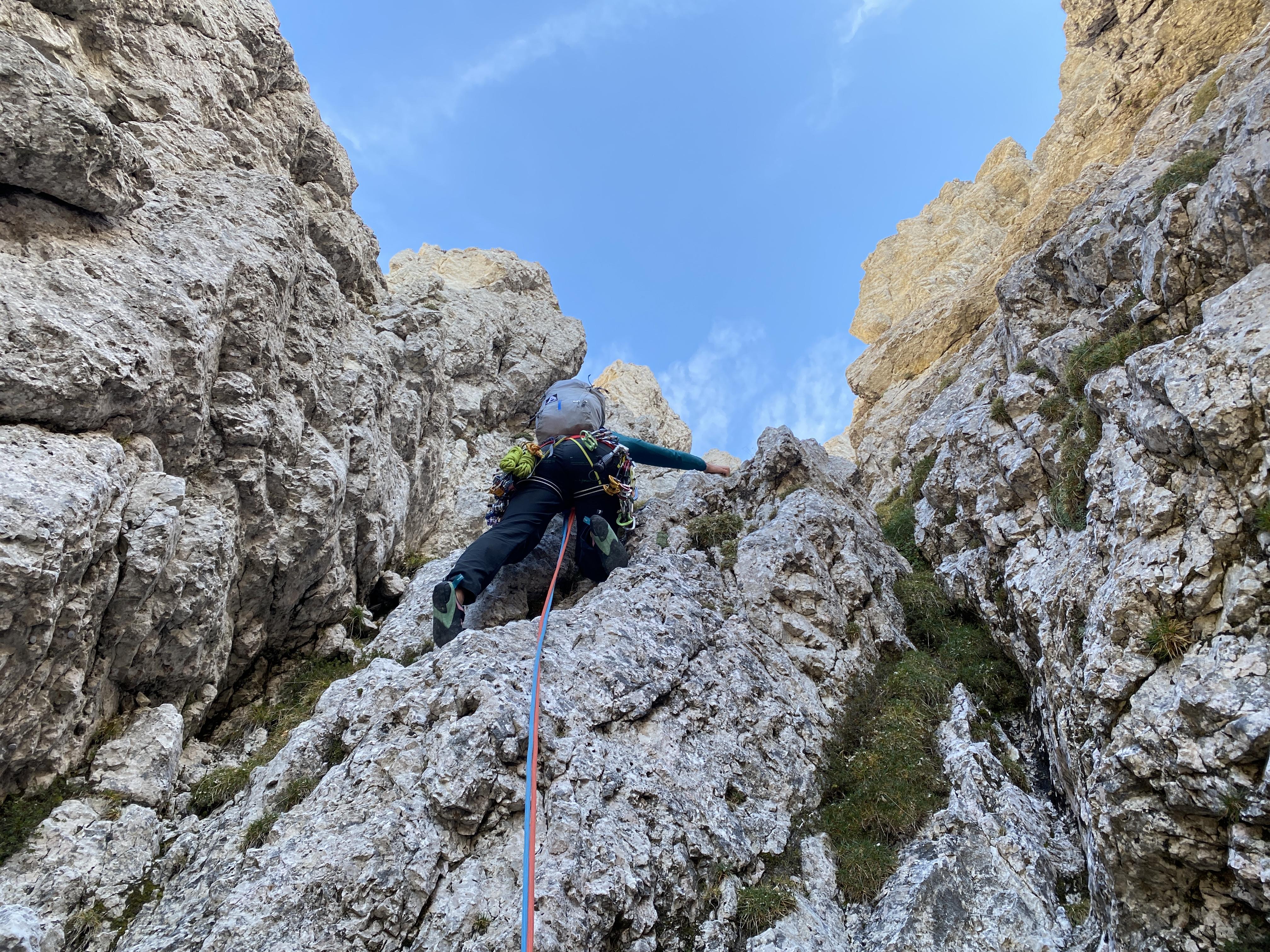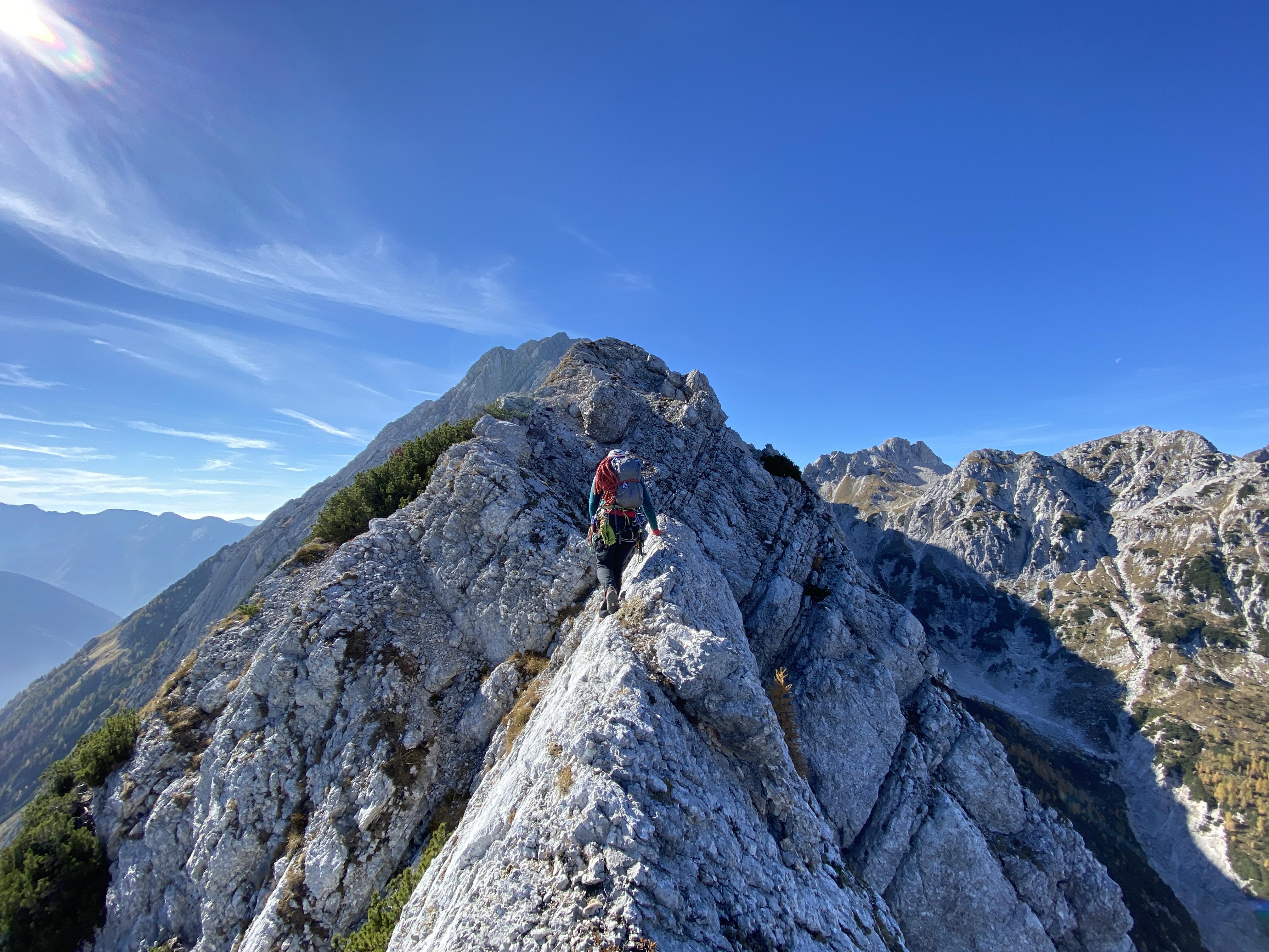 Najna smer začne na vrhu trikotnega melišča in išče naravne prehode skozi sprane plošče, kamine in na zgornji polovici še skozi zajedo, ki traja do vrha. Zaradi naravnih prehodov orientacija ni zahtevna, le v prvem raztežaju te skica vodi levo gor, moraš pa iti proti desni čez previs, kjer je edino logično nadaljevanje. V smeri je skala dobra, premično varovanje se da lepo nameščati, klini pa tudi vedno najdejo poko. V smeri sva pustila 4, od tega 3 na sidriščih. Za ta dan je bilo vreme napovedano oblačno. Nekoga bi to odvrnilo, nama pa je nizka oblačnost ponudila pravljične razglede na morje oblakov, iz katerega se dvigajo samotni otoki okoliških vršacev. Sestop je sledil po grebenu iz Srednjega Pelca na vrh. Prečenje Pelcev je še kar veliko plezano. Zdaj sem videl zakaj. Ta del grebena ponuja zračno plezanje po ostrem grebenu v odlični skali. Predvidevam, da je tudi tisti del, ki ga nisva plezala odličen. Iz vrha sva sestopila po Z grebenu (II-III) dol. Za ta del velja isto kot za prej omenjenega. Celo nekaj sidrišč je že not in pripravljenih za spust na težavnejših mestih.