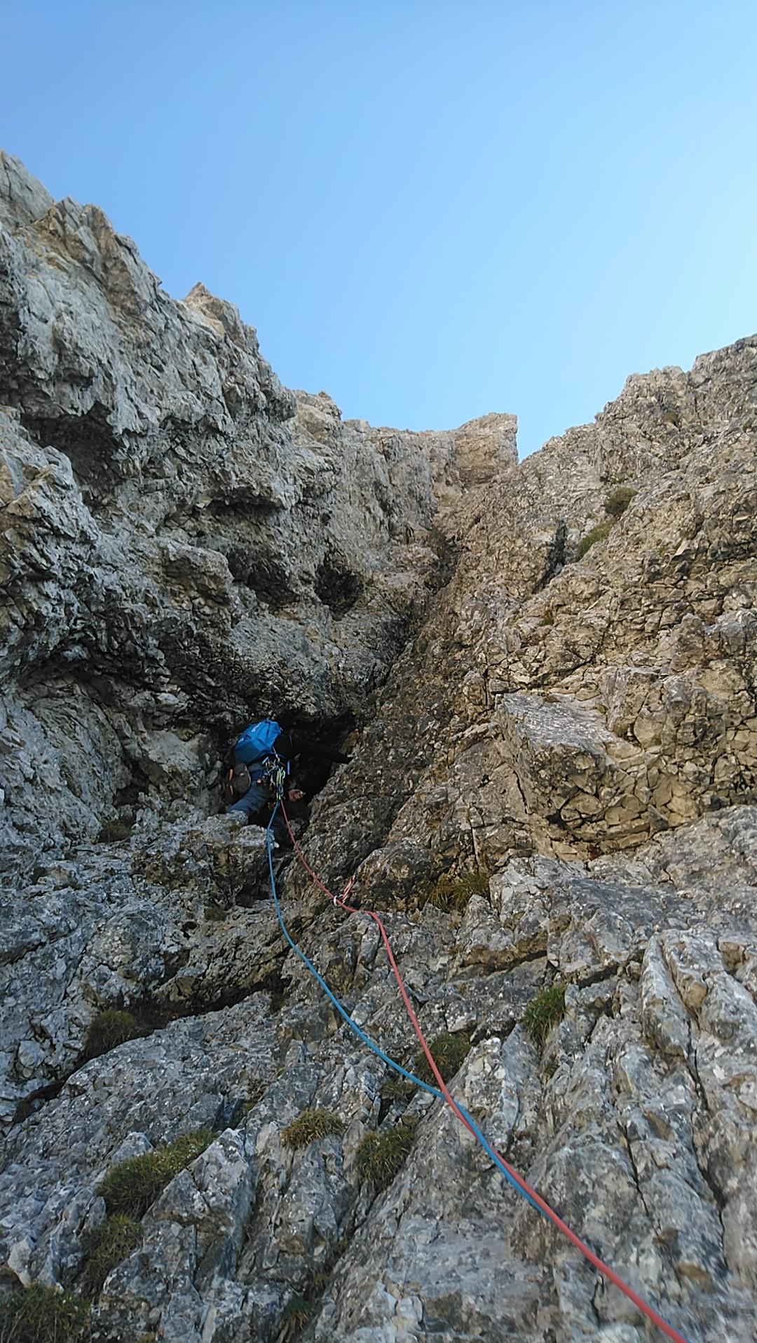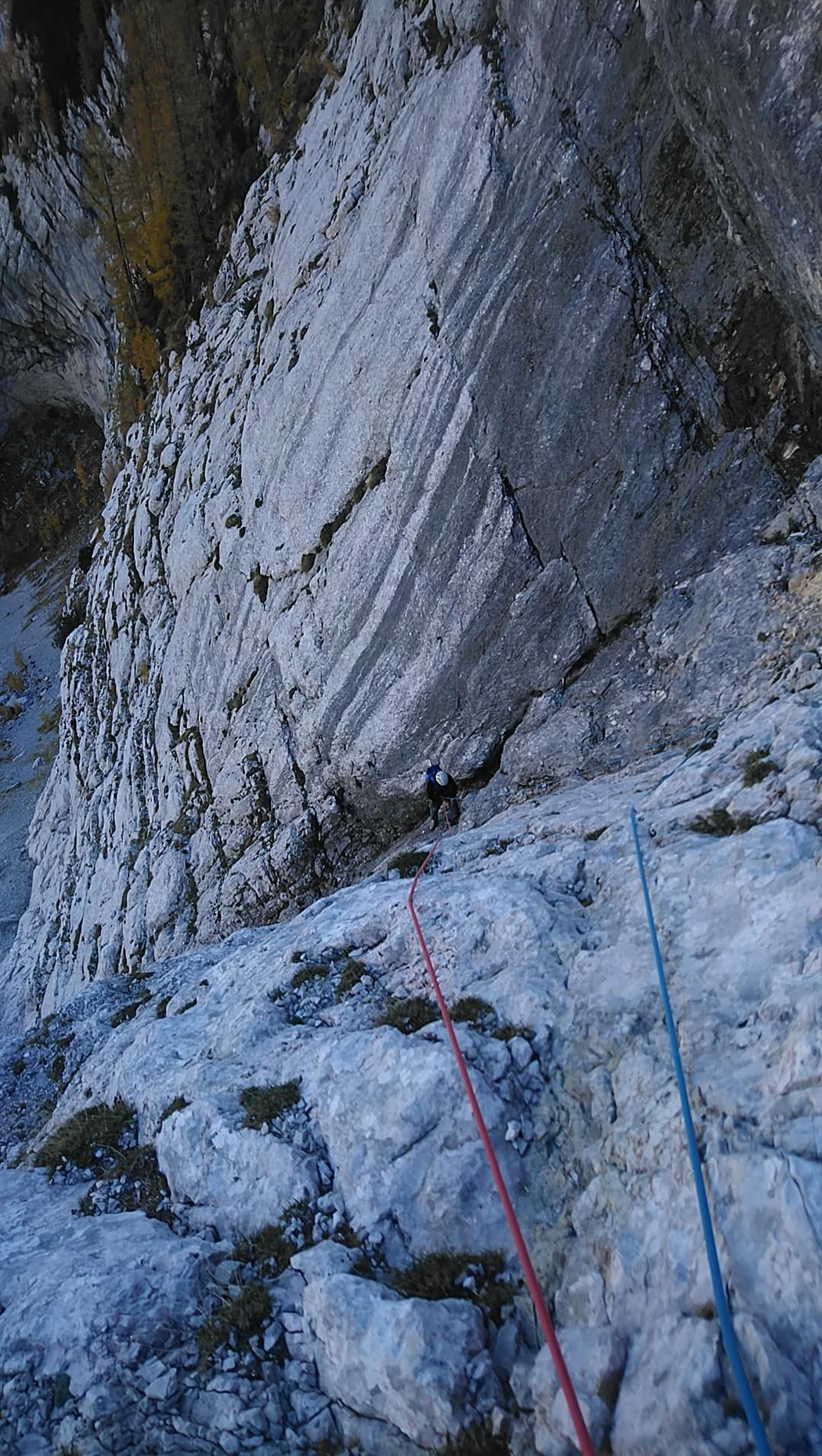 V nedeljo sva se namenila v Mlinarico v Levšarjevo peč. Prvotne sva na dostopu opustila, saj sva se nepričakovano znašla med reševalno akcijo GRS. Na bližnje trave je strmoglavil padalec in se poškodoval (če to bere upam, da je vse ok). Za backup sva izbrala lažjo Ribino smer, vendar sva po dveh raztežajih obračala, saj po tem dogodku glava ni bila 'na mestu'.
