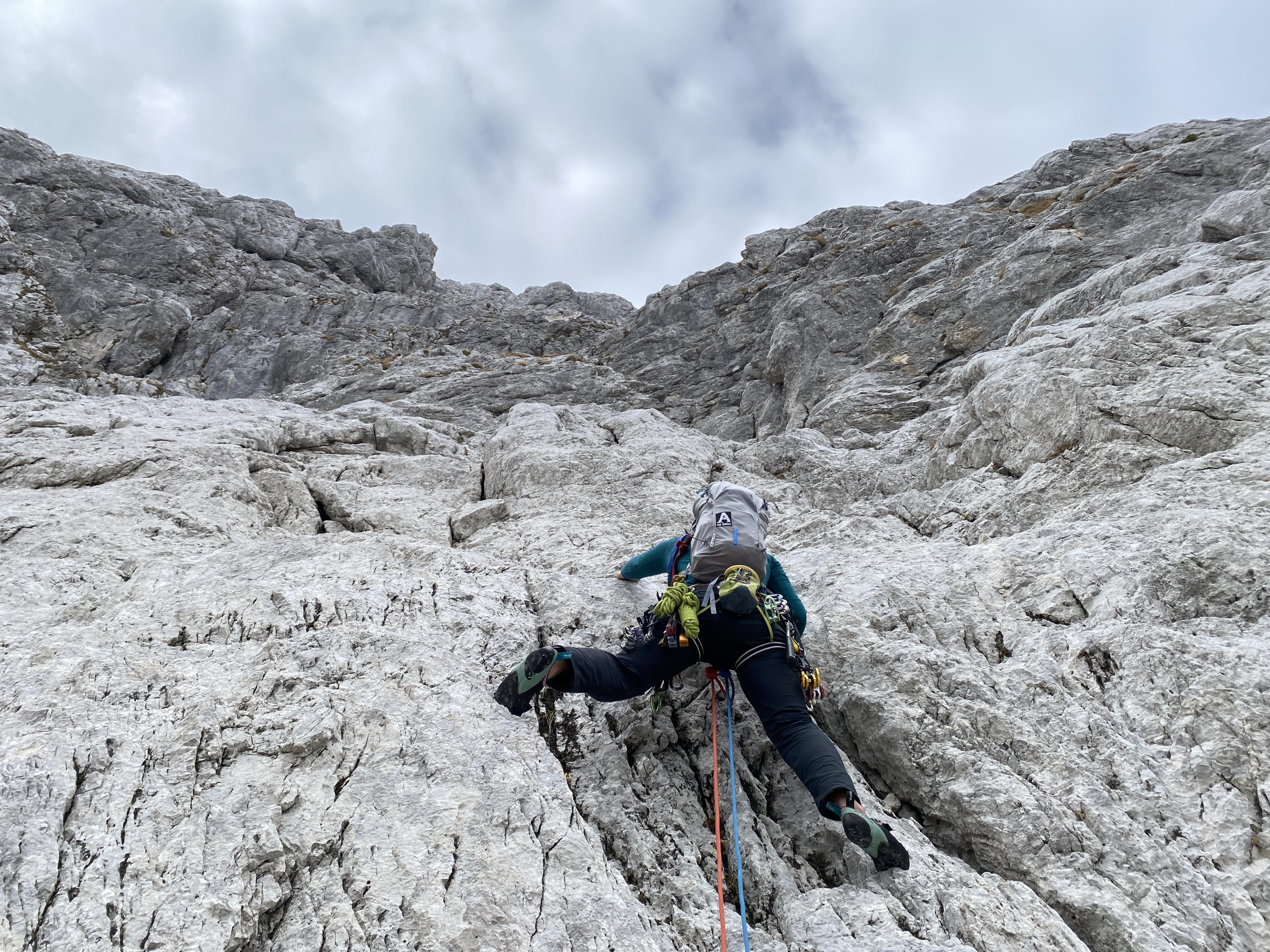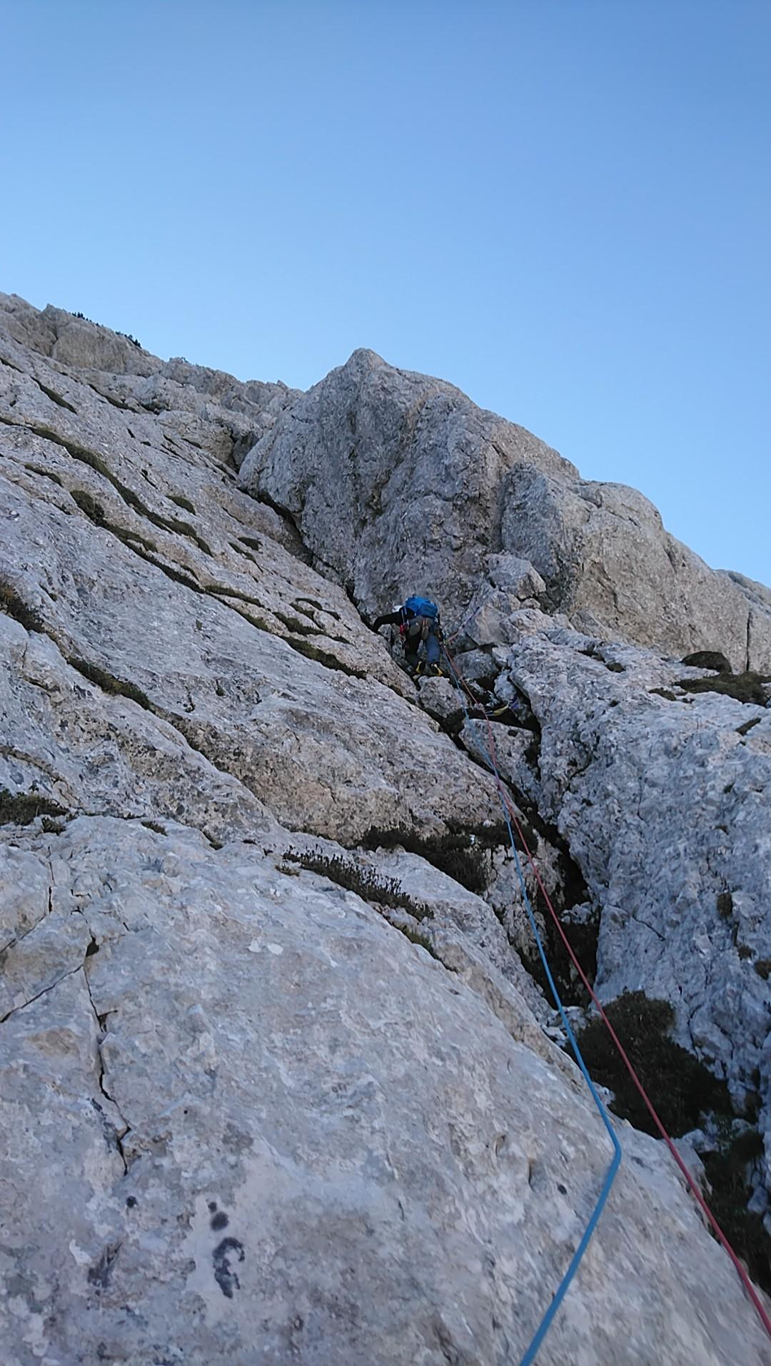 V ponedeljek sva raziskovala nad planino Zapotok. Plezala sva smer Likar.Markič (IV+/IV, 200m) v Zapotoškem vrhu. Tej smeri se dela krivica, da ni objavljena v Miheliču. Dobro opremljena klasika v odlični skali, ki se v levem delu po lepih naravnih prehodih vije na vrh.