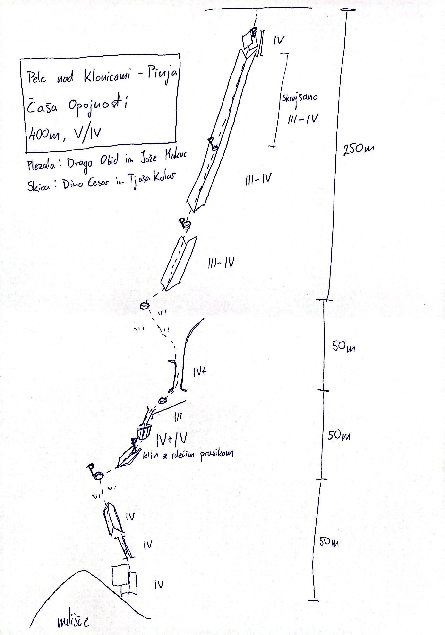 Za vikend sem se udeležil tabora v Trenti, ki ga je organizirala Komisija za alpinizem. V petek smo se zbrali v apartmaju v Trenti, ki je bil za čas trajanja tabora naš dom. Naveze in plani za čez vikend se kar hitro ustvarijo. S soplezalko Tjašo Kolar (AK Črna) sva se odločila, da greva v Pelc nad Klonicami, po trentarsko Pinja. Po vzhodni steni se do vrha vije več smeri. Izbrala sva si Čašo opojnosti (V/IV, 400m), ki poteka v levem delu. Trojna naveza udeležencev tabora pa je izbrala Zajedo v steni (VI-/V).