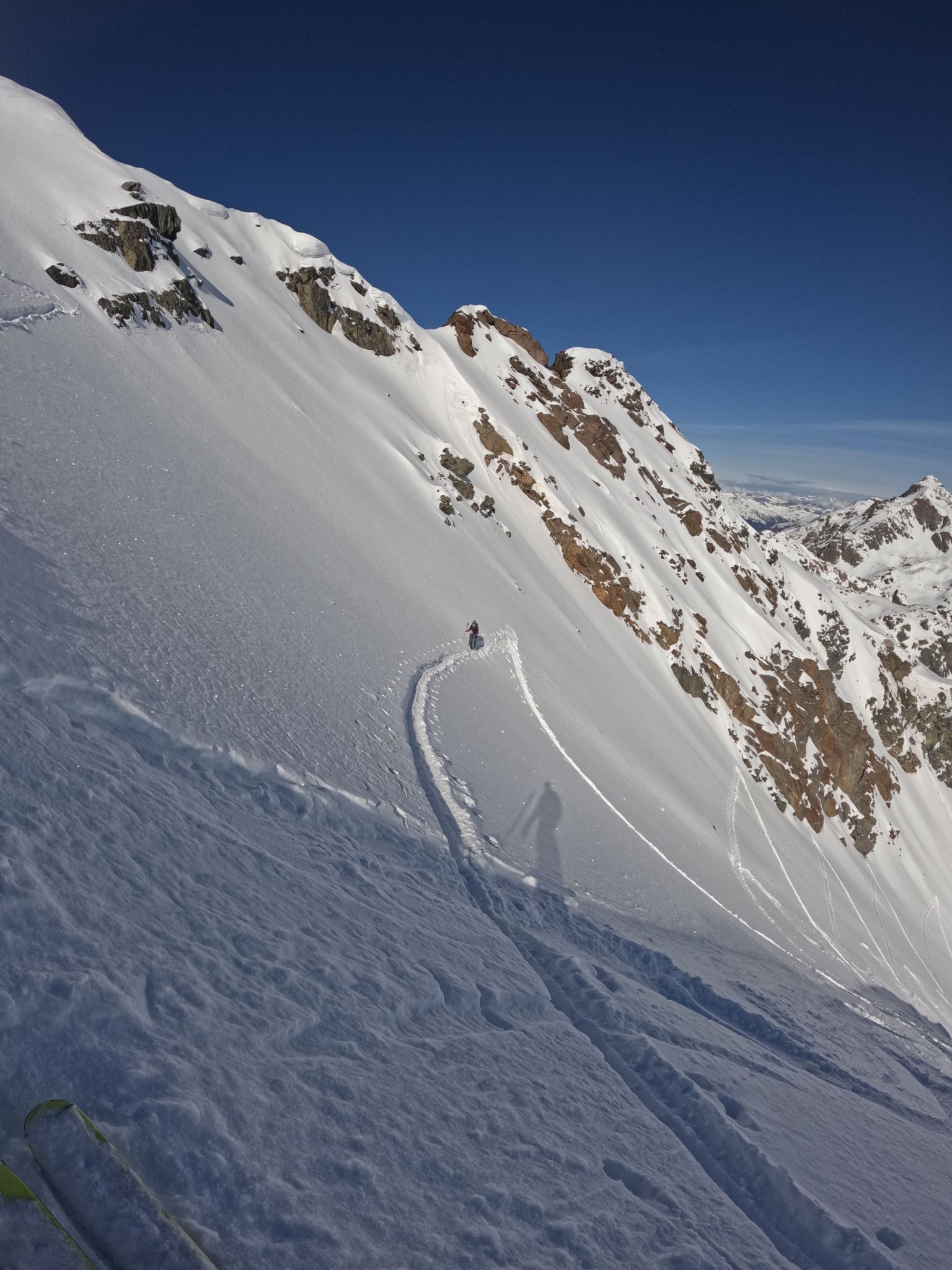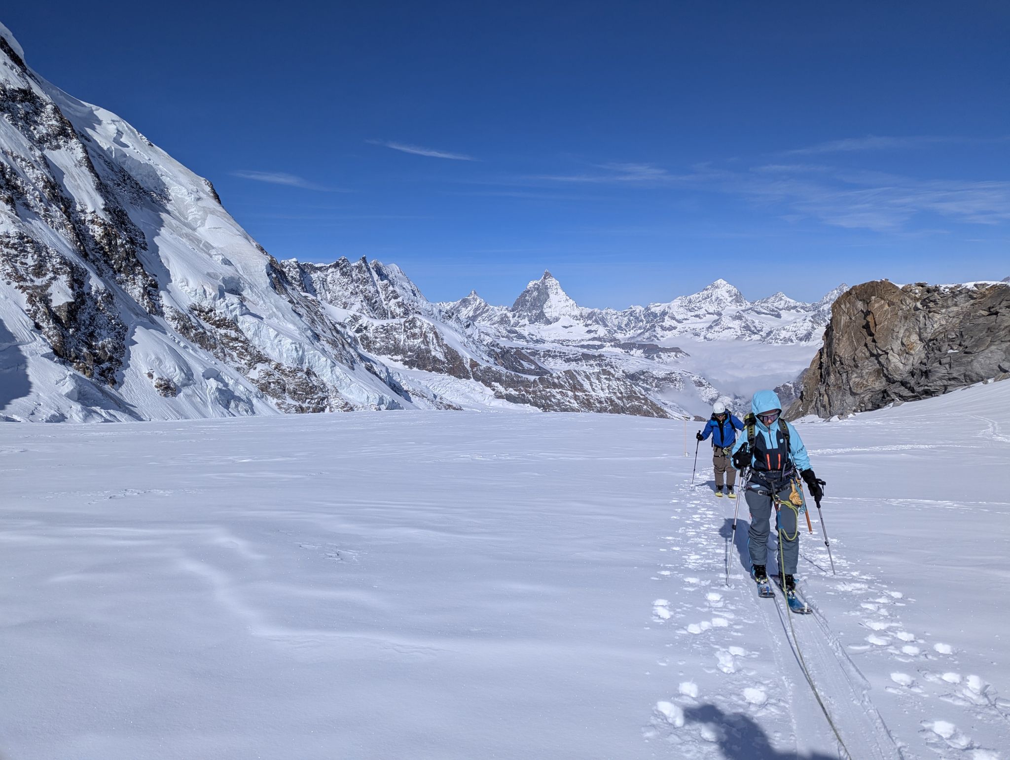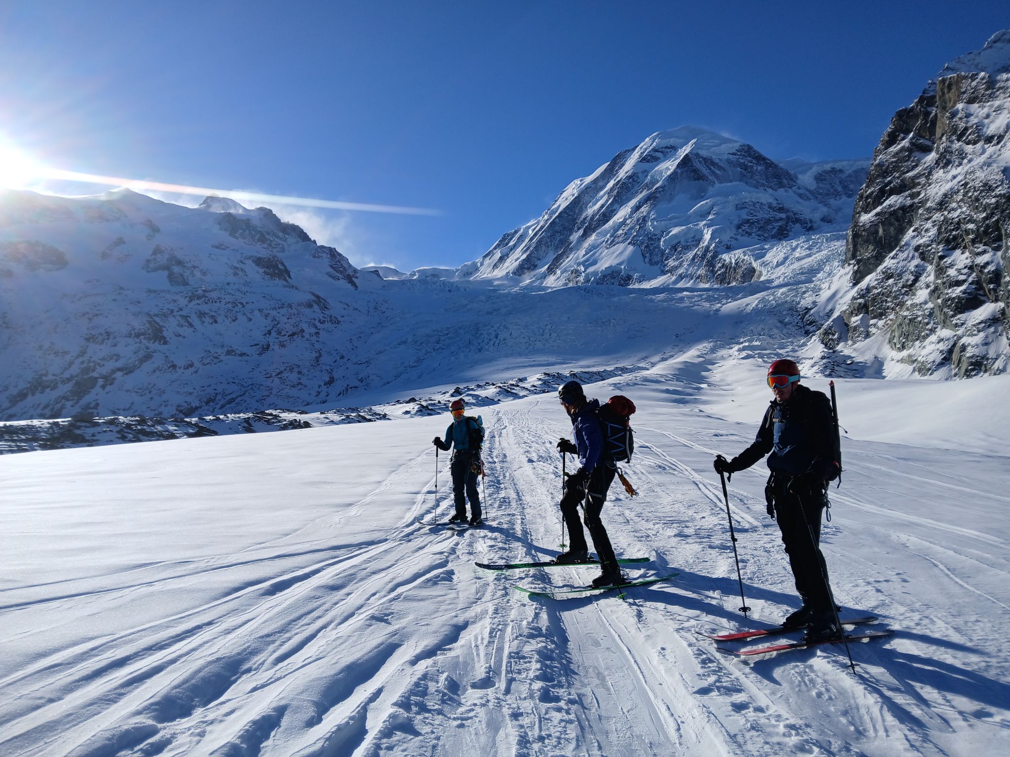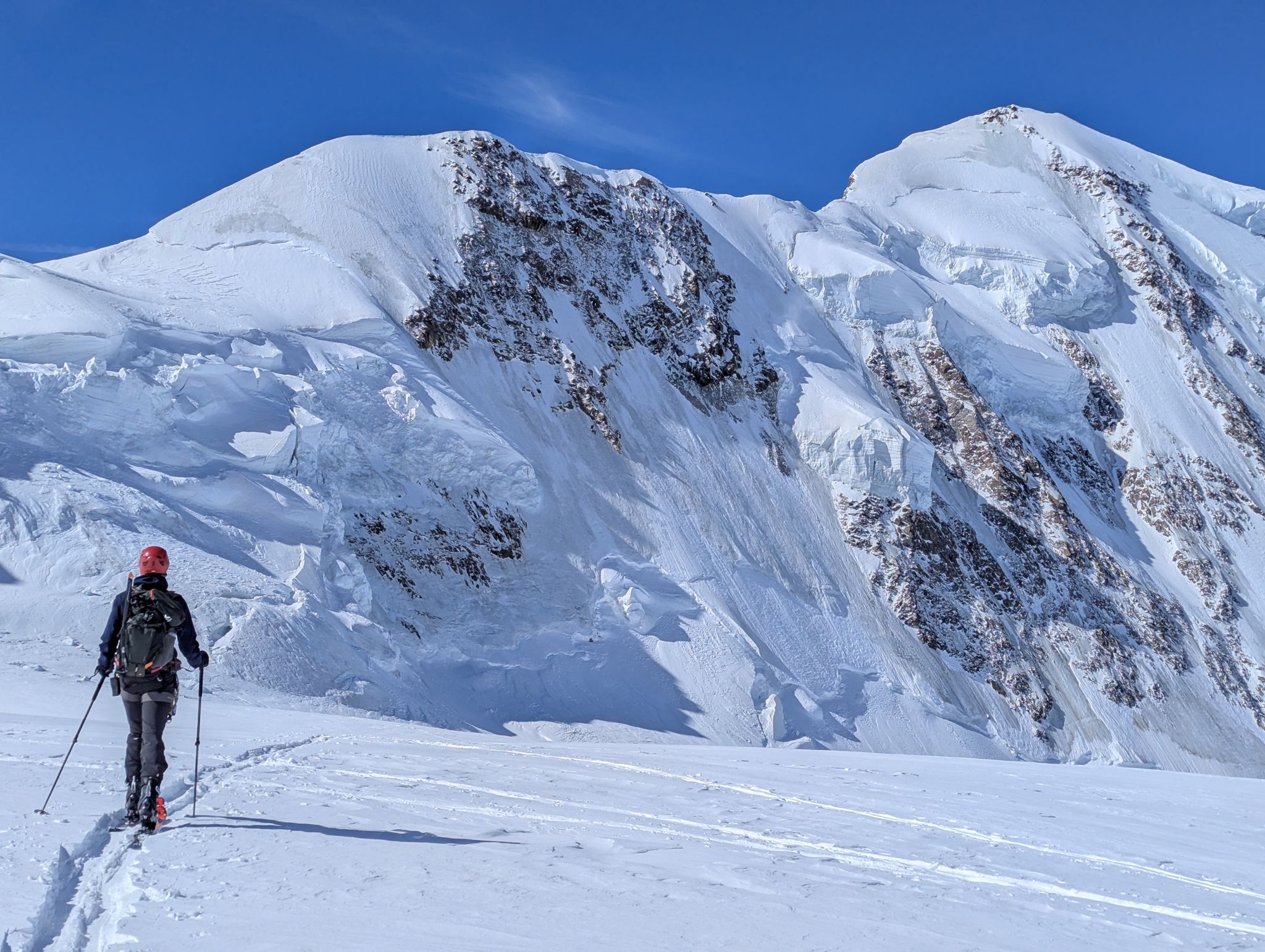 Z Majo sva zadnji teden v marcu izvedla turno smuko v Švici. Prvi teden sva preživela v regiji Engadin v kantonu Graubuenden. Vso opremo sva nesla iz vasice Susch (1.559) po zaprti cesti pod prelazom Fluela do strnjene snežne odeje, nato sva se vzpela čez dolino Grialetsch do koče Grialetsch (2.540). Naslednji dan sva odsmučala predvrh Piz Grialetsch (3.027) in nato še čez škrbino Rothorafurgga na Raduener Rothora (3.021). Naslednji dan sva se povzpela na Piz Sarsura (3.176) ter odsmučala čez ledenik Vadret da Sarsura v dolino. Noč sva preživela v dolini in zjutraj v lepem vremenu pohitela na prelaz Julier (2.237), od kjer sva se vzpela čez dolino Val d’Agnel na škrbino d’Agnel (2.982) ter se po ledeniku s severne strani povzpela na Piz Surgonda (3.195). Spustila sva se do koče Jenatsch (2.652). Zjutraj sva se povzpela čez dolino Traunter Ovas na škrbino Margun (2.945) ter z južne strani na Corn Suvretta (3.071), nato pa čez planoto Margun in Val d'Agnel odsmučala nazaj na prelaz. Ker sva se v štirih dneh povzpela na pet tritisočakov in opravila kar nekaj tisoč višinskih metrov, sva si vzela dan počitka. V soboto sva se odpeljala v kanton Wallis ter z vlakom v Zermatt, kjer sta se nama pridružila Peter in David. Skupaj smo se od postaje Furi povzpeli čez sotesko Gorner, prečili ledenik Gorner in spodnji del Mejnega ledenika do koče Monte Rosa (2.882). Naslednji dan smo se v smučarski ledeniški navezi štirih povzpeli čez zgornji del Mejnega ledenika na Signalkuppe (Punta Gnifetti)(4.554) do razgledne koče Regina Margheritta, ki pa je v tem času zaprta. Odsmučali smo čez ledenik po smeri pristopa. Zadnji dan smo odsmučali še čez oba spodnja ledenika ter neposredno v Zermatt, kjer smo čez mesto v pancerjih odkolovratili do železniške postaje. Kdo pravi, da alpinizem ni turizem? Skratka, dopust je uspel.