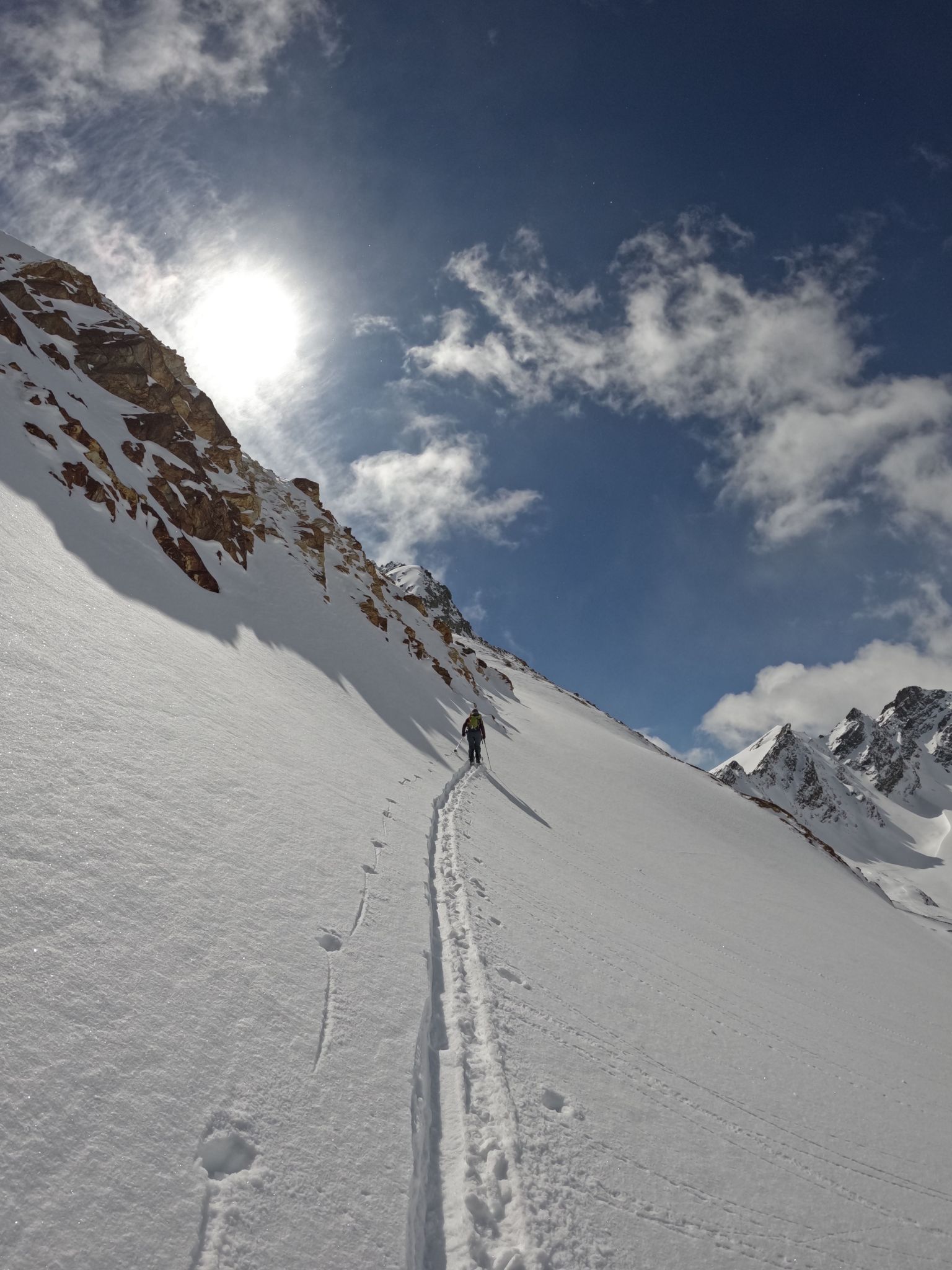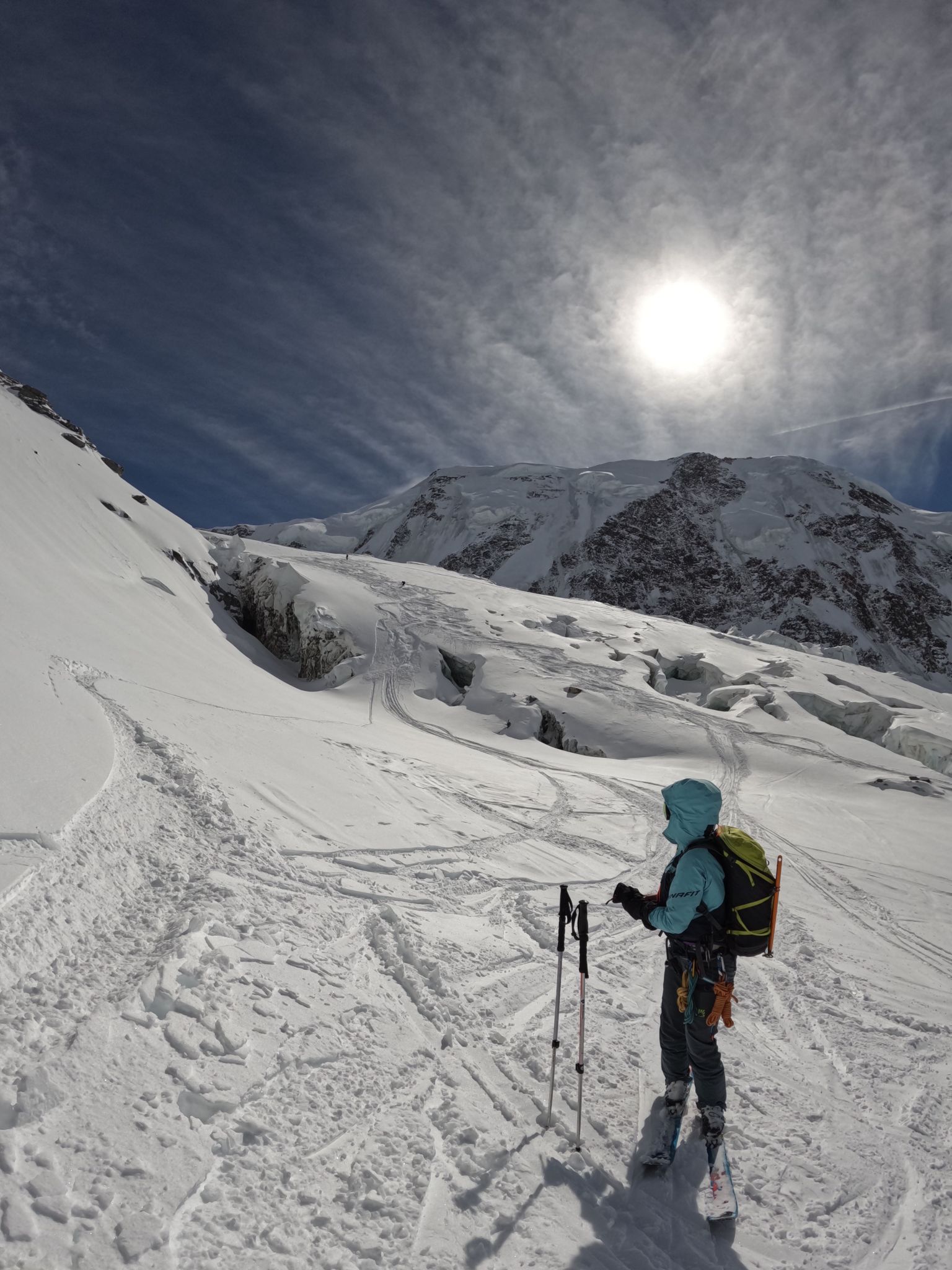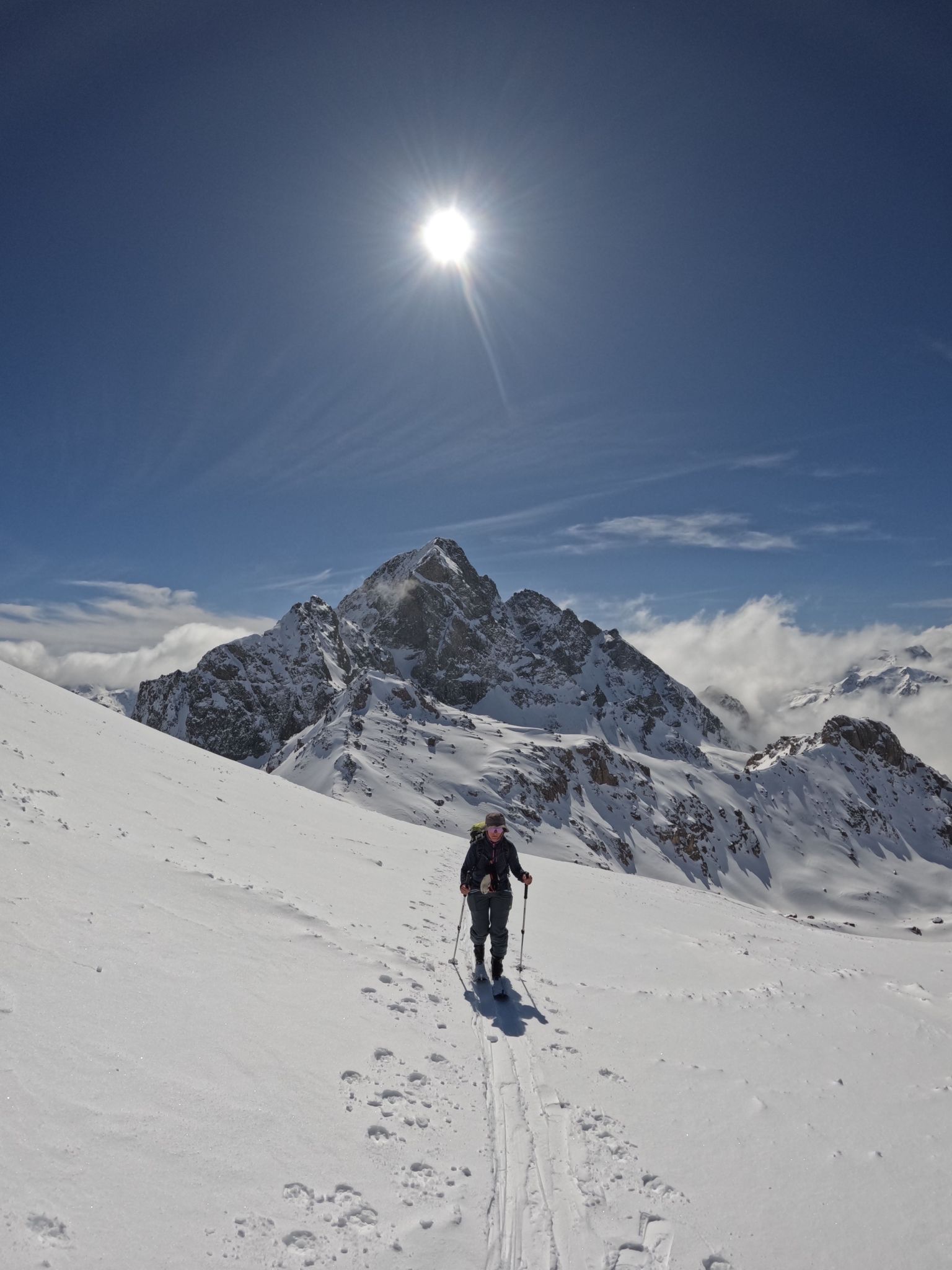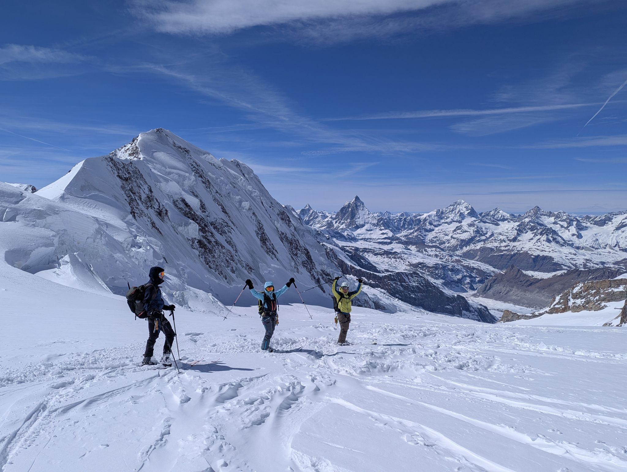 Z Majo sva zadnji teden v marcu izvedla turno smuko v Švici. Prvi teden sva preživela v regiji Engadin v kantonu Graubuenden. Vso opremo sva nesla iz vasice Susch (1.559) po zaprti cesti pod prelazom Fluela do strnjene snežne odeje, nato sva se vzpela čez dolino Grialetsch do koče Grialetsch (2.540). Naslednji dan sva odsmučala predvrh Piz Grialetsch (3.027) in nato še čez škrbino Rothorafurgga na Raduener Rothora (3.021). Naslednji dan sva se povzpela na Piz Sarsura (3.176) ter odsmučala čez ledenik Vadret da Sarsura v dolino. Noč sva preživela v dolini in zjutraj v lepem vremenu pohitela na prelaz Julier (2.237), od kjer sva se vzpela čez dolino Val d’Agnel na škrbino d’Agnel (2.982) ter se po ledeniku s severne strani povzpela na Piz Surgonda (3.195). Spustila sva se do koče Jenatsch (2.652). Zjutraj sva se povzpela čez dolino Traunter Ovas na škrbino Margun (2.945) ter z južne strani na Corn Suvretta (3.071), nato pa čez planoto Margun in Val d'Agnel odsmučala nazaj na prelaz. Ker sva se v štirih dneh povzpela na pet tritisočakov in opravila kar nekaj tisoč višinskih metrov, sva si vzela dan počitka. V soboto sva se odpeljala v kanton Wallis ter z vlakom v Zermatt, kjer sta se nama pridružila Peter in David. Skupaj smo se od postaje Furi povzpeli čez sotesko Gorner, prečili ledenik Gorner in spodnji del Mejnega ledenika do koče Monte Rosa (2.882). Naslednji dan smo se v smučarski ledeniški navezi štirih povzpeli čez zgornji del Mejnega ledenika na Signalkuppe (Punta Gnifetti)(4.554) do razgledne koče Regina Margheritta, ki pa je v tem času zaprta. Odsmučali smo čez ledenik po smeri pristopa. Zadnji dan smo odsmučali še čez oba spodnja ledenika ter neposredno v Zermatt, kjer smo čez mesto v pancerjih odkolovratili do železniške postaje. Kdo pravi, da alpinizem ni turizem? Skratka, dopust je uspel.