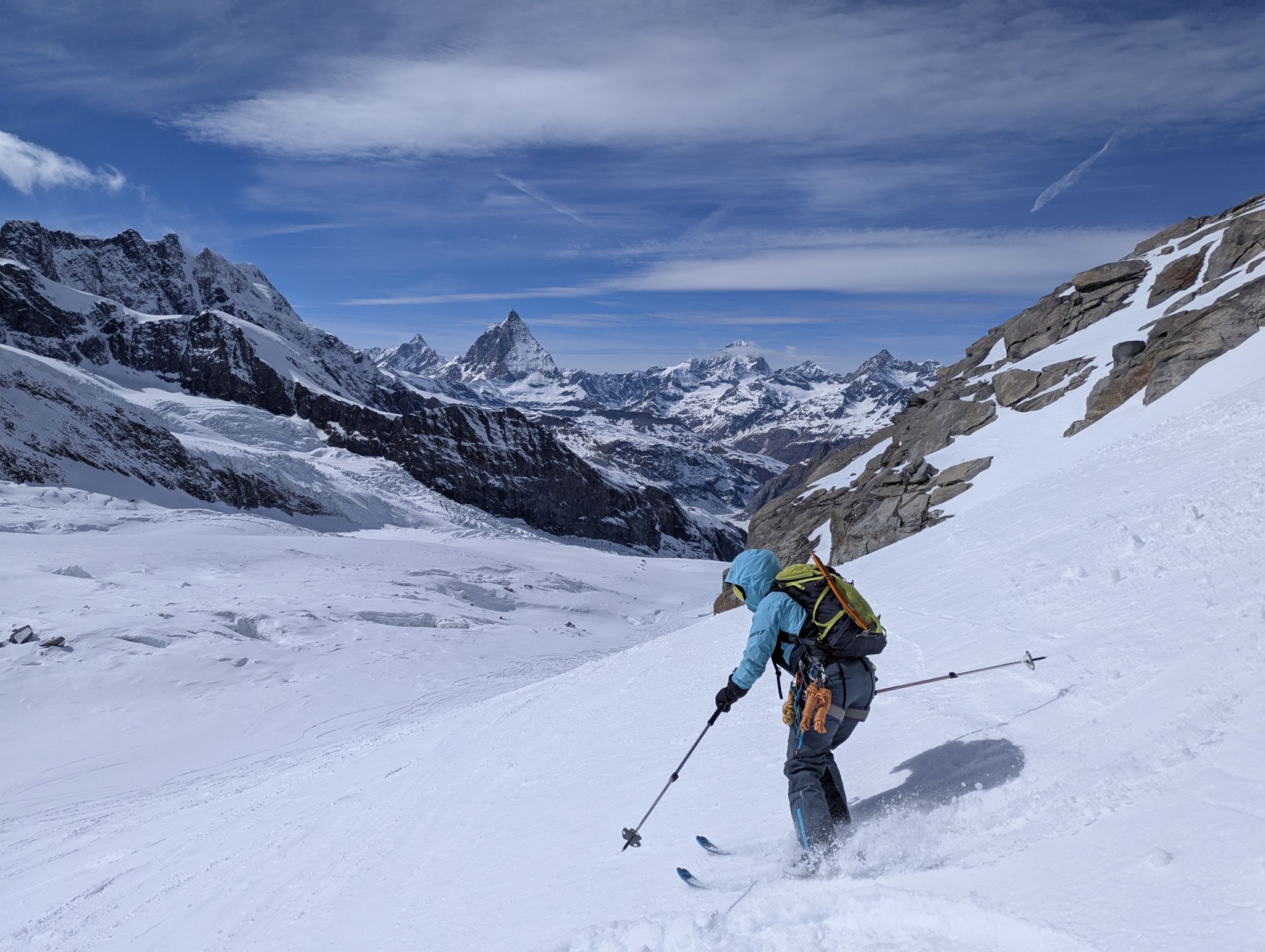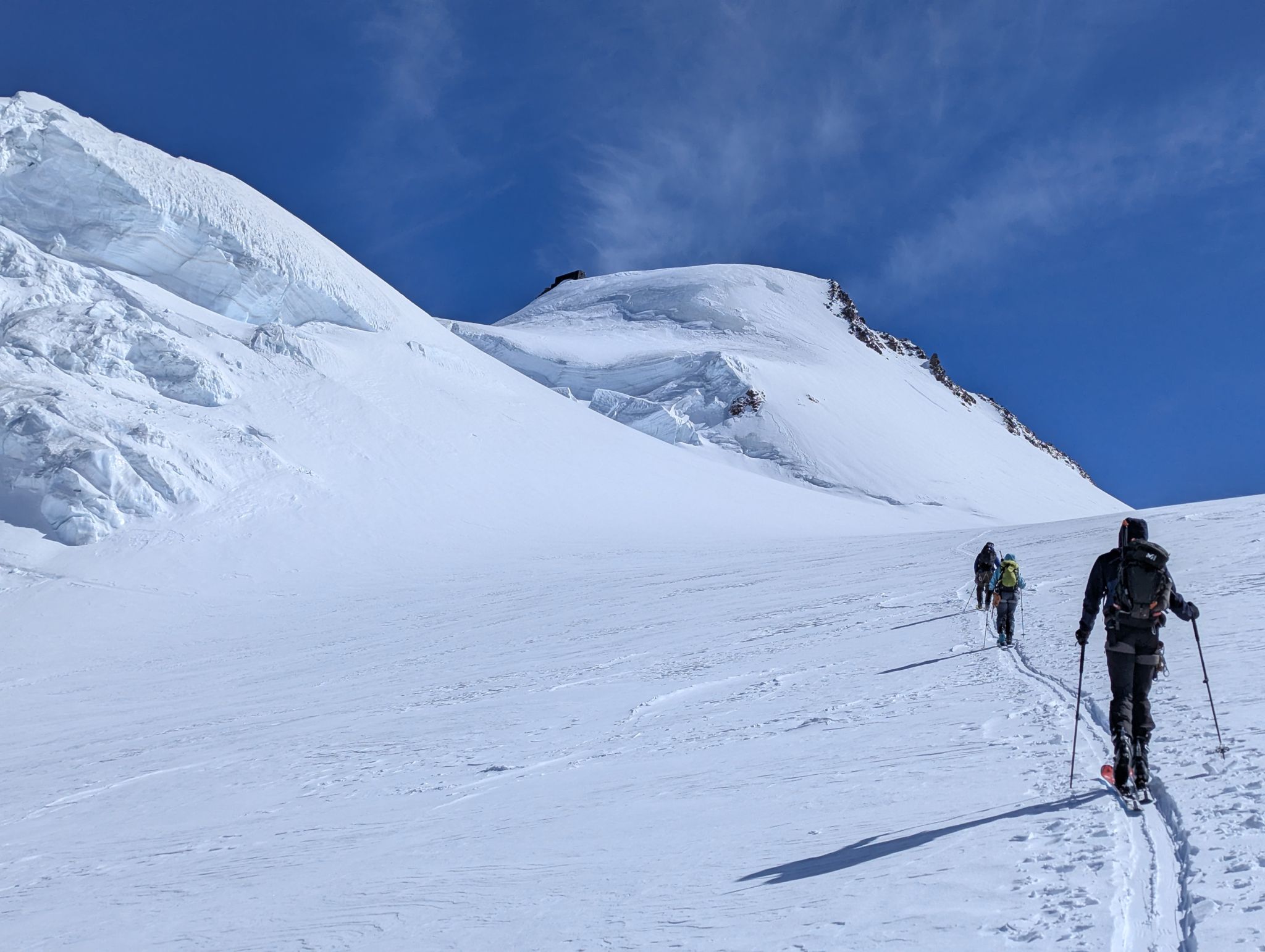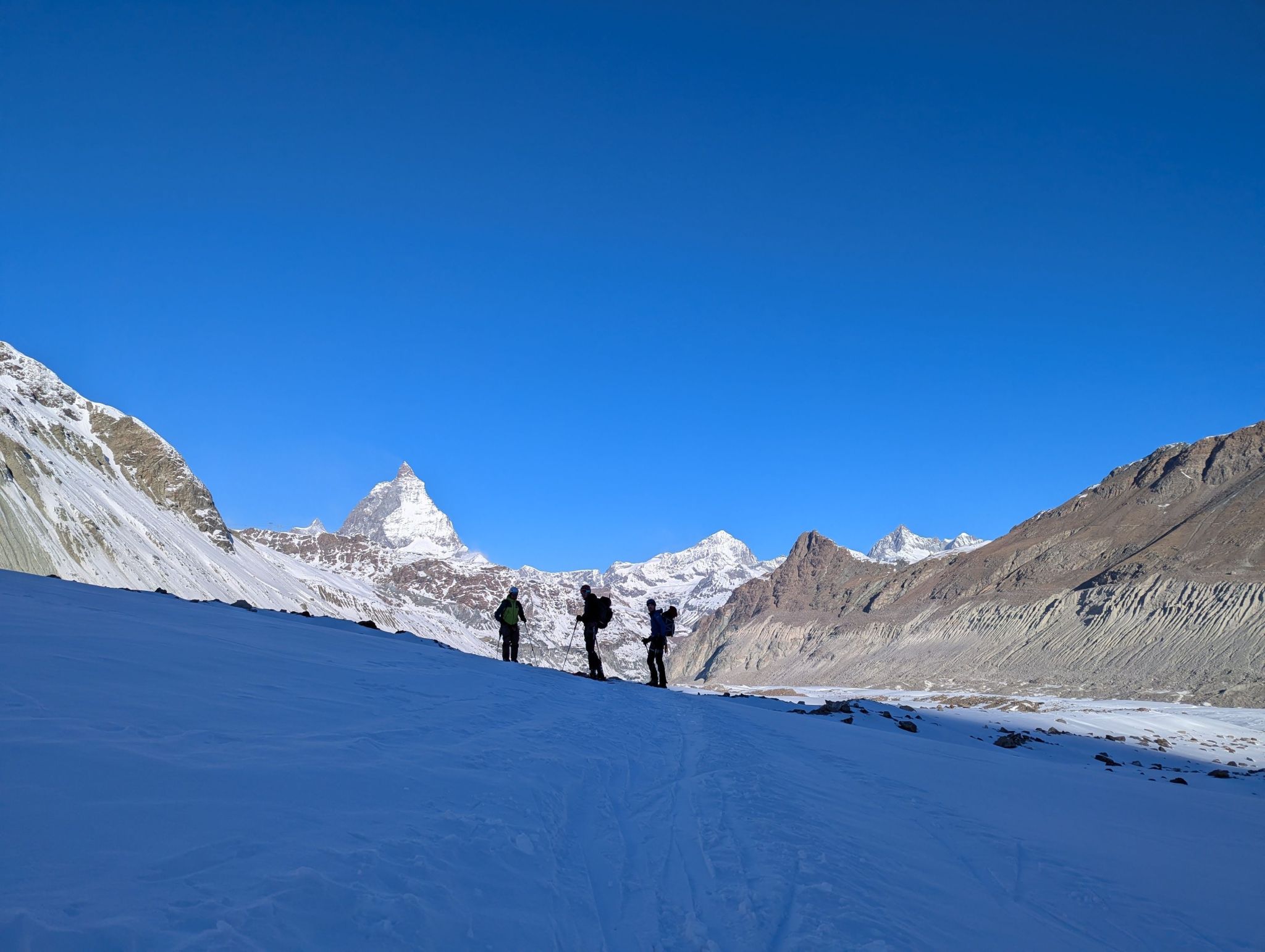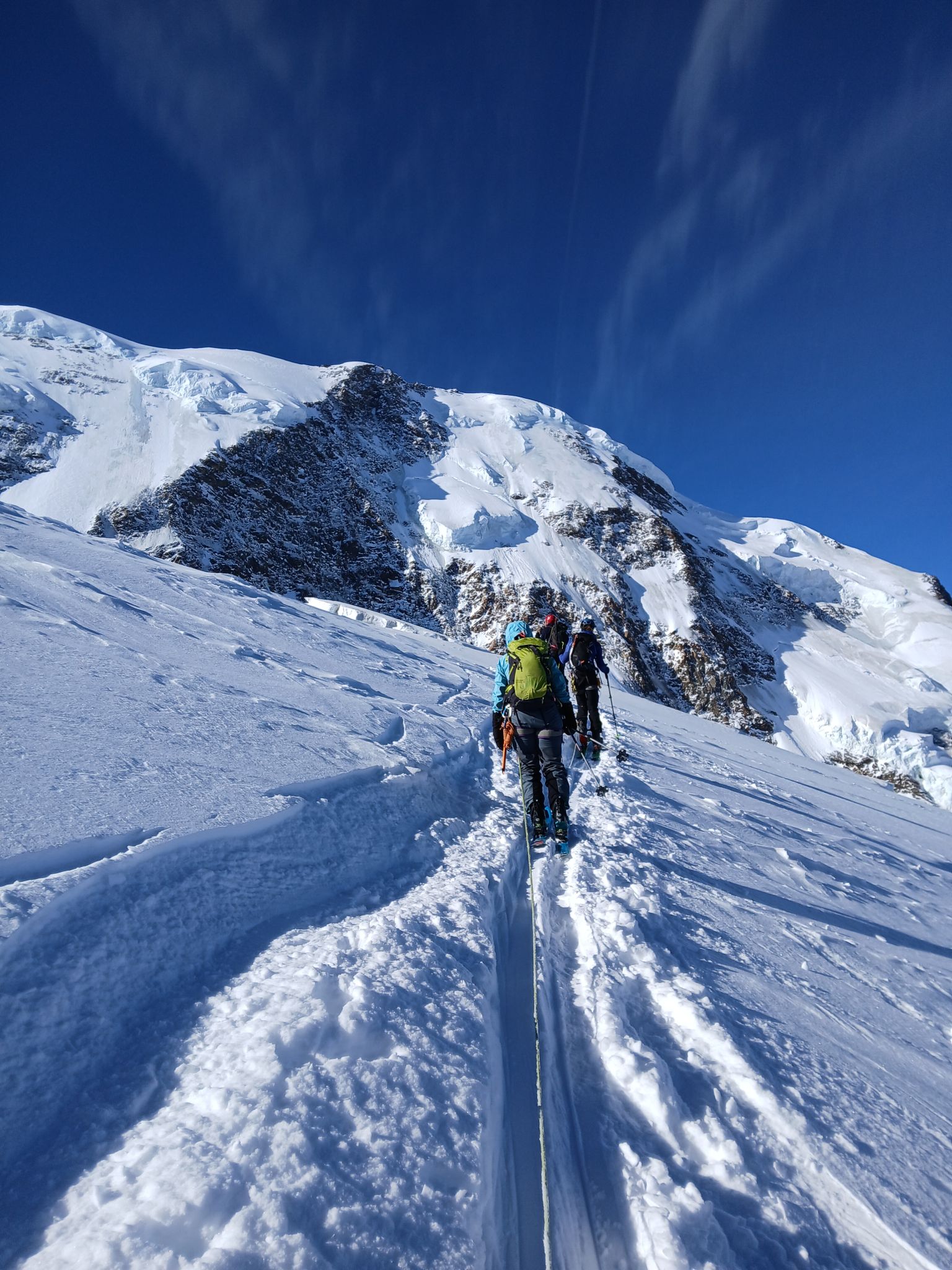 Z Majo sva zadnji teden v marcu izvedla turno smuko v Švici. Prvi teden sva preživela v regiji Engadin v kantonu Graubuenden. Vso opremo sva nesla iz vasice Susch (1.559) po zaprti cesti pod prelazom Fluela do strnjene snežne odeje, nato sva se vzpela čez dolino Grialetsch do koče Grialetsch (2.540). Naslednji dan sva odsmučala predvrh Piz Grialetsch (3.027) in nato še čez škrbino Rothorafurgga na Raduener Rothora (3.021). Naslednji dan sva se povzpela na Piz Sarsura (3.176) ter odsmučala čez ledenik Vadret da Sarsura v dolino. Noč sva preživela v dolini in zjutraj v lepem vremenu pohitela na prelaz Julier (2.237), od kjer sva se vzpela čez dolino Val d’Agnel na škrbino d’Agnel (2.982) ter se po ledeniku s severne strani povzpela na Piz Surgonda (3.195). Spustila sva se do koče Jenatsch (2.652). Zjutraj sva se povzpela čez dolino Traunter Ovas na škrbino Margun (2.945) ter z južne strani na Corn Suvretta (3.071), nato pa čez planoto Margun in Val d'Agnel odsmučala nazaj na prelaz. Ker sva se v štirih dneh povzpela na pet tritisočakov in opravila kar nekaj tisoč višinskih metrov, sva si vzela dan počitka. V soboto sva se odpeljala v kanton Wallis ter z vlakom v Zermatt, kjer sta se nama pridružila Peter in David. Skupaj smo se od postaje Furi povzpeli čez sotesko Gorner, prečili ledenik Gorner in spodnji del Mejnega ledenika do koče Monte Rosa (2.882). Naslednji dan smo se v smučarski ledeniški navezi štirih povzpeli čez zgornji del Mejnega ledenika na Signalkuppe (Punta Gnifetti)(4.554) do razgledne koče Regina Margheritta, ki pa je v tem času zaprta. Odsmučali smo čez ledenik po smeri pristopa. Zadnji dan smo odsmučali še čez oba spodnja ledenika ter neposredno v Zermatt, kjer smo čez mesto v pancerjih odkolovratili do železniške postaje. Kdo pravi, da alpinizem ni turizem? Skratka, dopust je uspel.