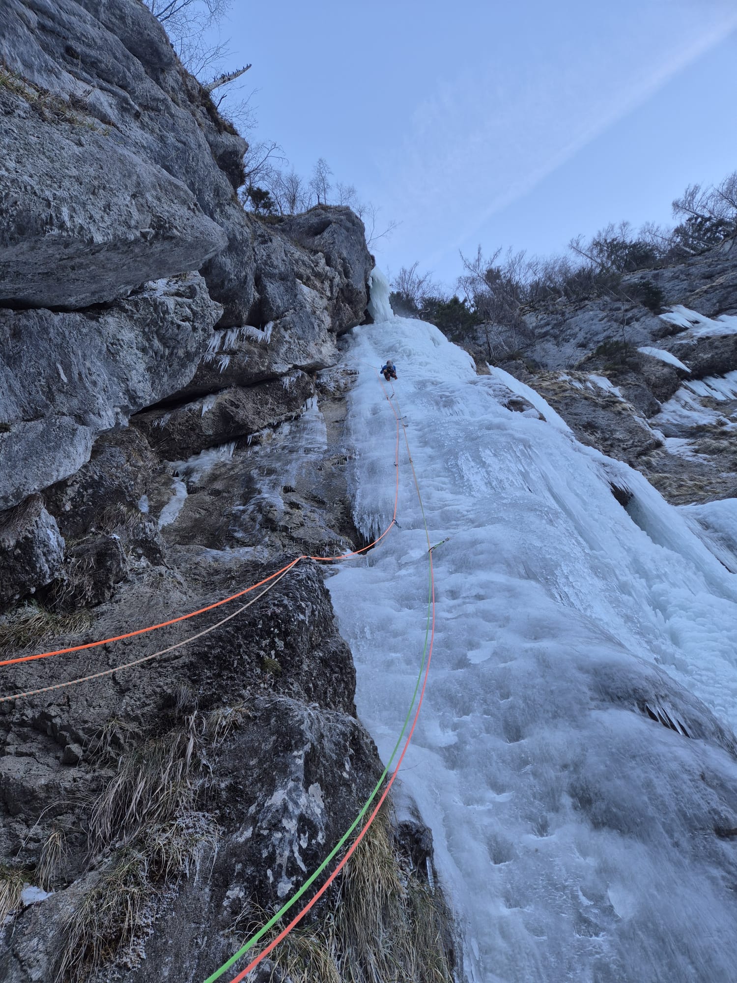 Že pred novim letom se je začelo nakazovat, da bi se januarja lahko plezalo v ledu. To se je tudi zgodilo. Tako smo se v začetku januarja, na Metkovo pobudo, zapeljali v Avstrijo. Točneje v Mallnitz, v dolino pod Ankogel. Tu smo po pol ure pešačenja po dolini, prispeli do slapu Bavaria Blue. Tri naveze smo se praktično naenkrat pognale v ta slabih 400m dolg slap. Začetno navdušenje je malo pokvarila kvaliteta ledu. Trd in napet, talarji in poke so se delale ob vsakem udarcu cepina. Kljub previdnosti, je Miha domov odnesel prebito ustnico. Vseeno smo bili veseli lednega začetka. Na poti domov že delamo plane za naprej.